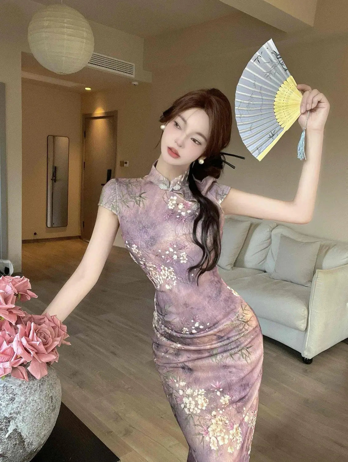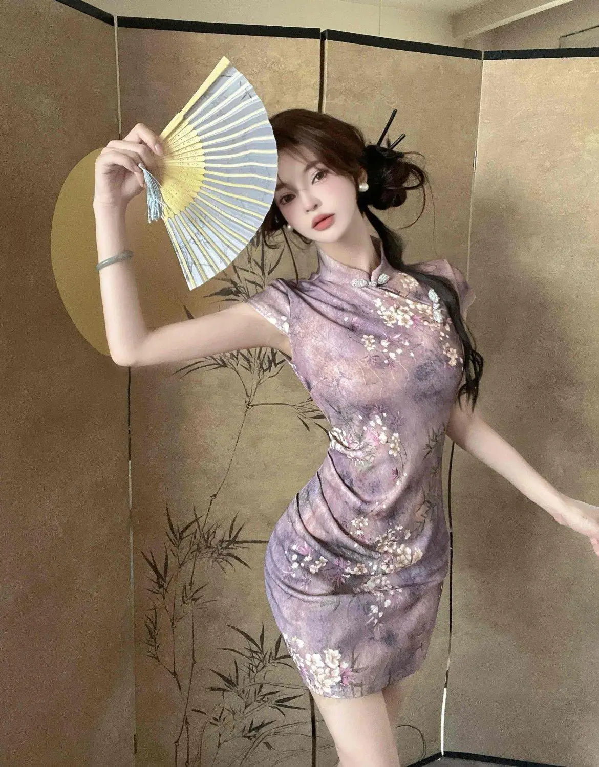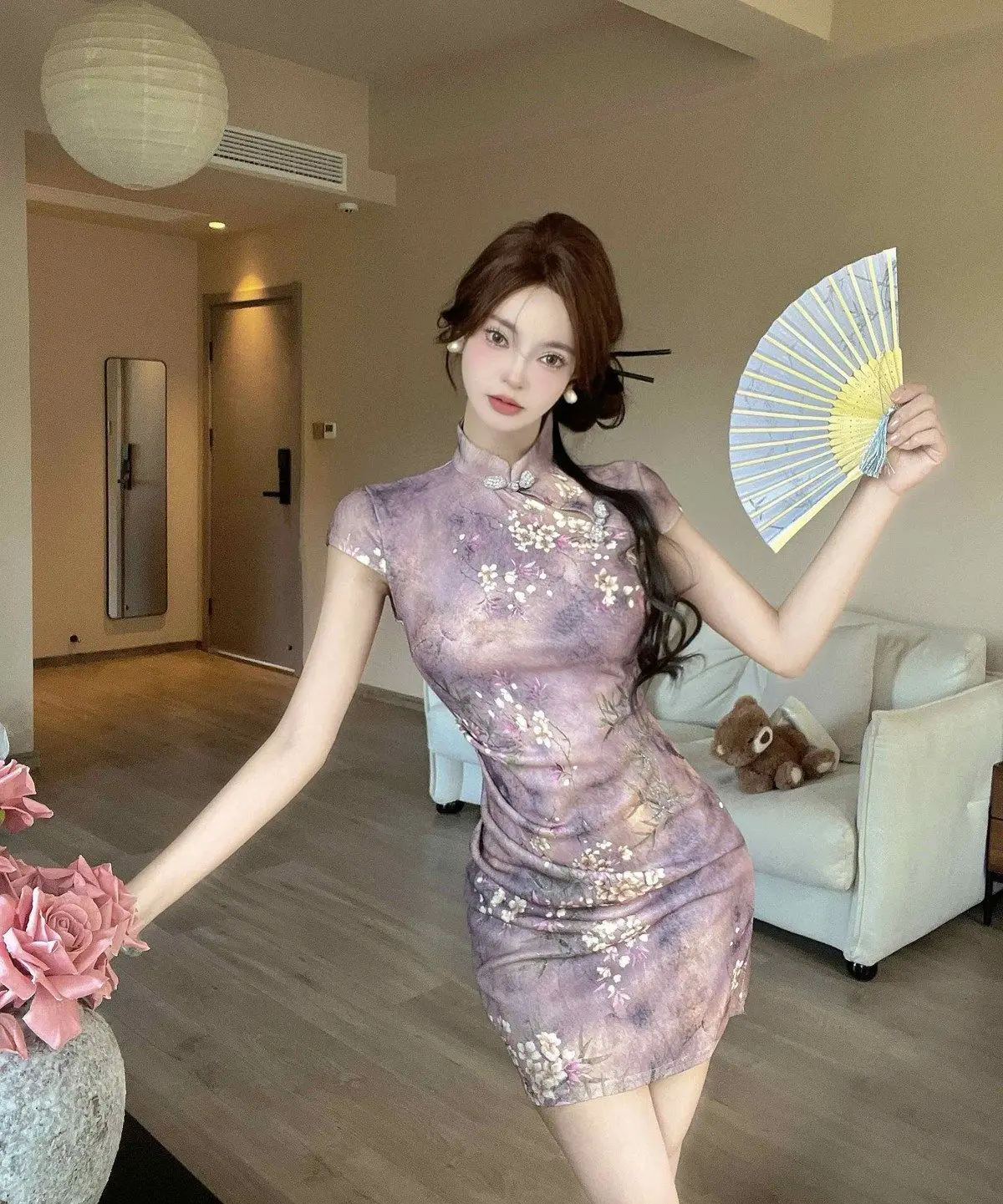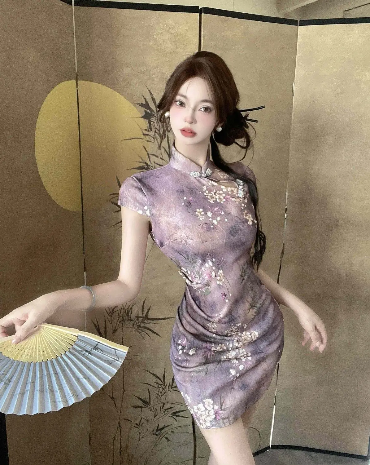 Cyflymder Summer New Chinese Style Improved Cheongsam Women Dress Retro Purple Print Slim Fit Wrap Hip Sexy Mini Dress for Women