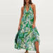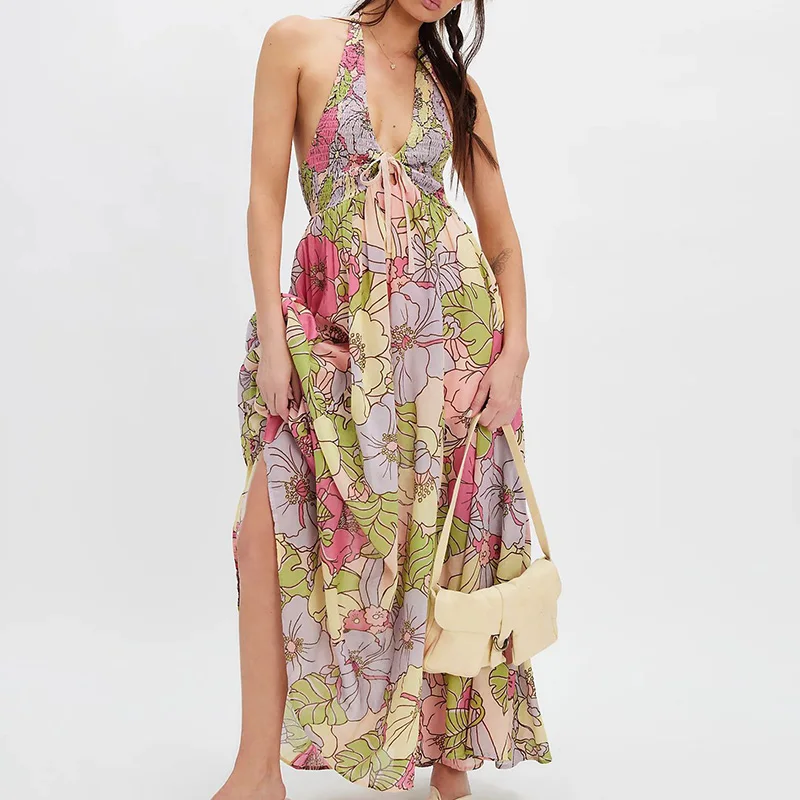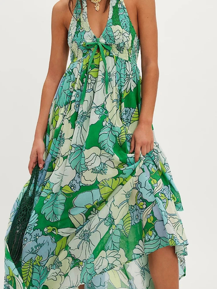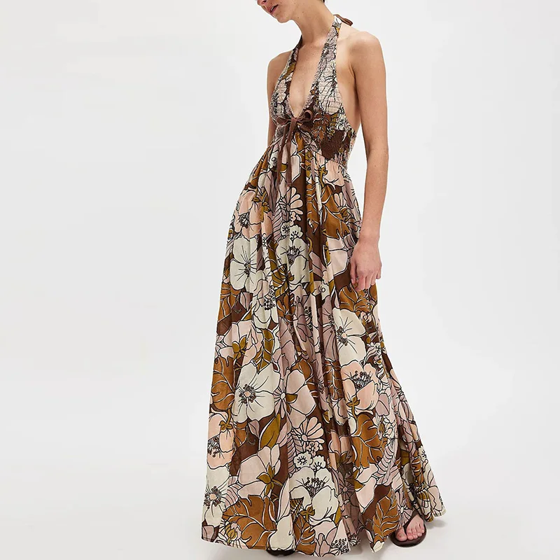 Cyflymder Summer New Floral Print Women's Long Dress Fashion Backless Hollow Out Holiday Dress Female Casual Halter Tie Up Bohemian Dress