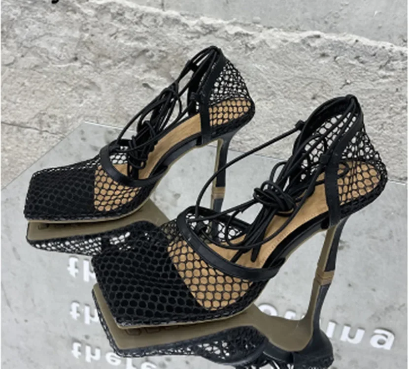 Cyflymder Summer New Plus Size Women's Shoes Breathable Mesh Strap Thin Heel Square Head Hollow High Heel Shoes