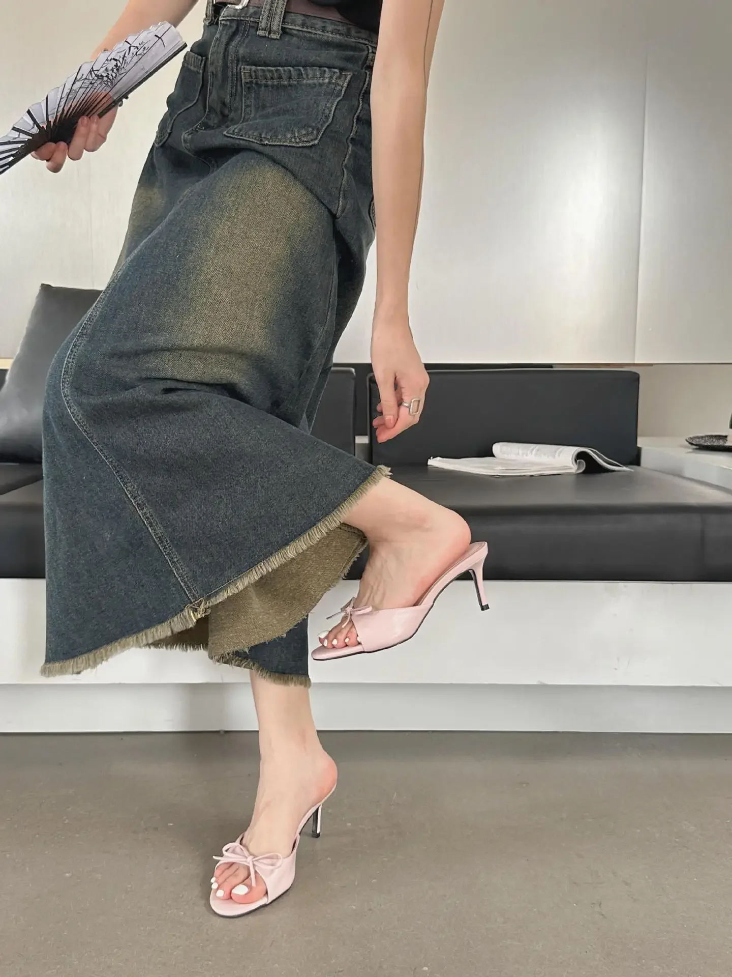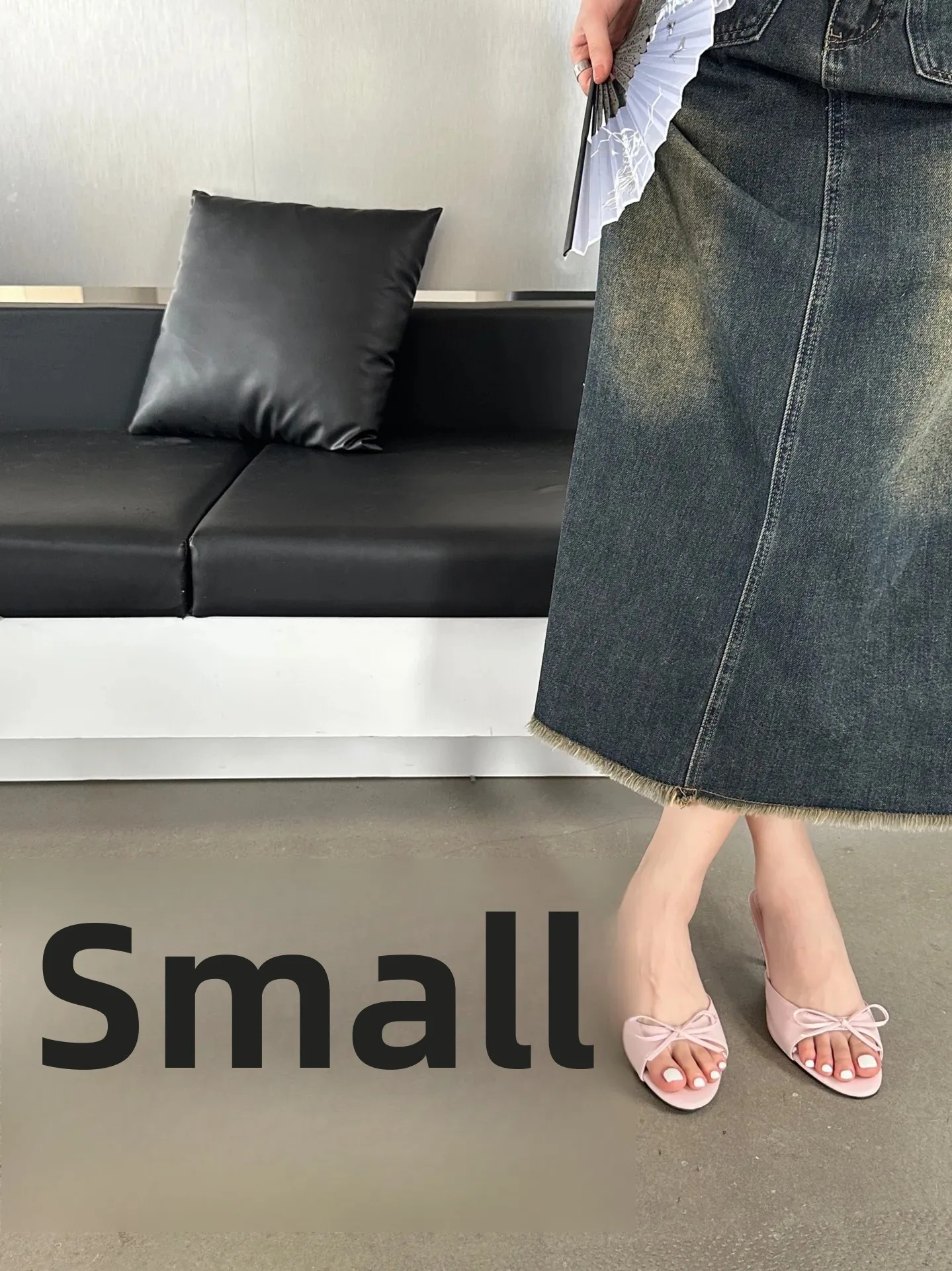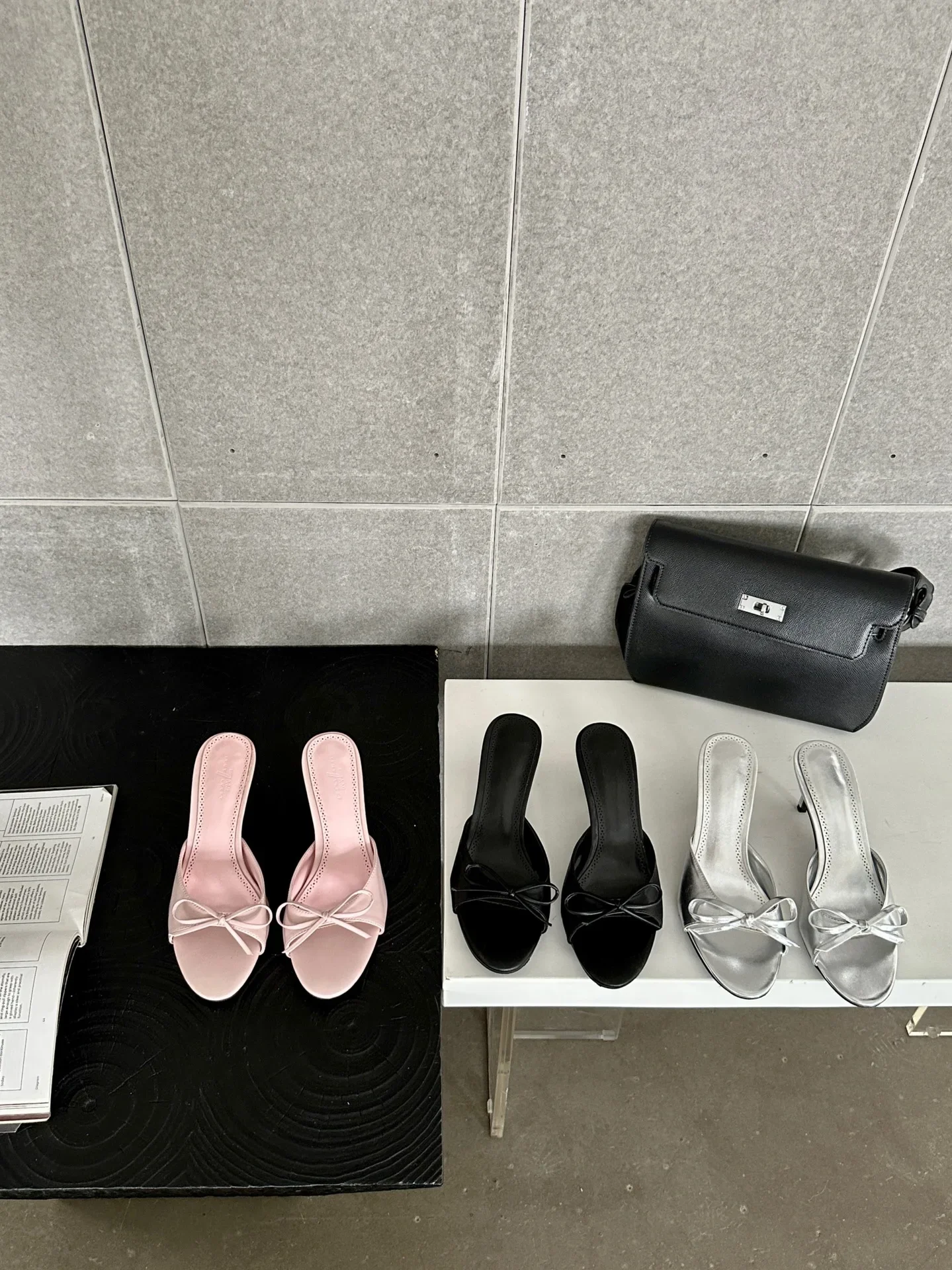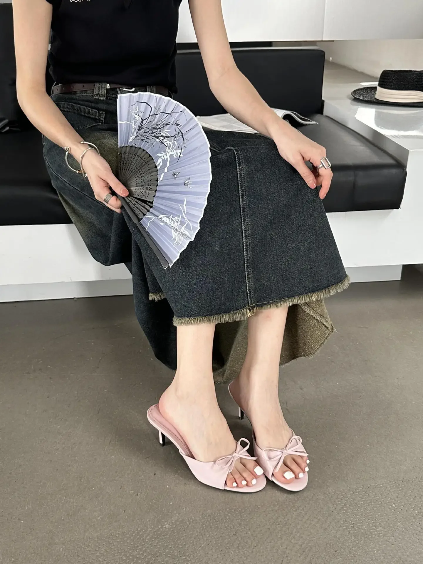 Cyflymder Summer New Women's Slippers Bow Toe Fine Heel Medium Heel Drag Shoes Outer Wear High Heel Women's Sandals 40 Yards