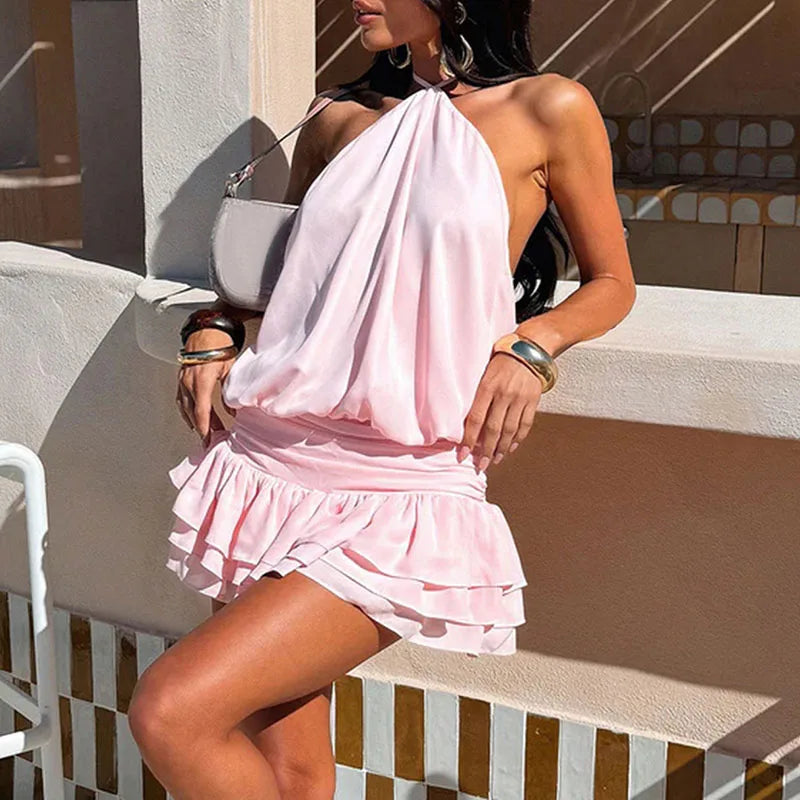 Cyflymder Summer Off Shoulder Backless Hollow Dress Women Fashion Halter Camisole Cakes Dress 2025 Spring Solid Spliced Pleated Mini Dress