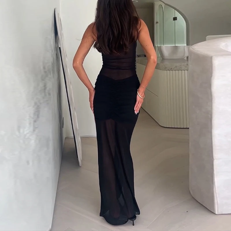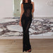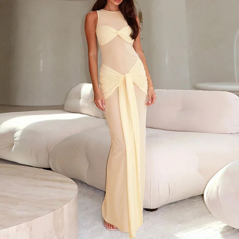 Cyflymder Summer Sleeveless Thin Gauze Twist Banquet Dress Sexy Slim Solid O Neck Wrap Hips Dress Chic Womens High Waist Ribbon Long Dress