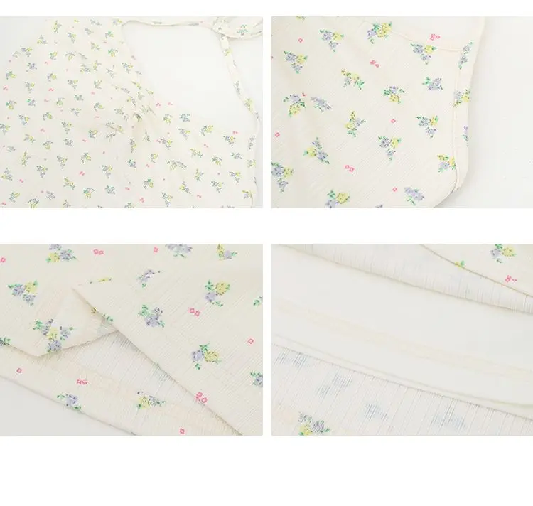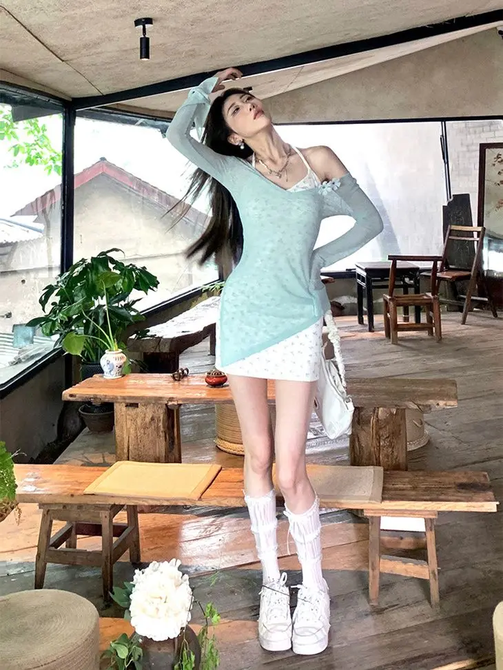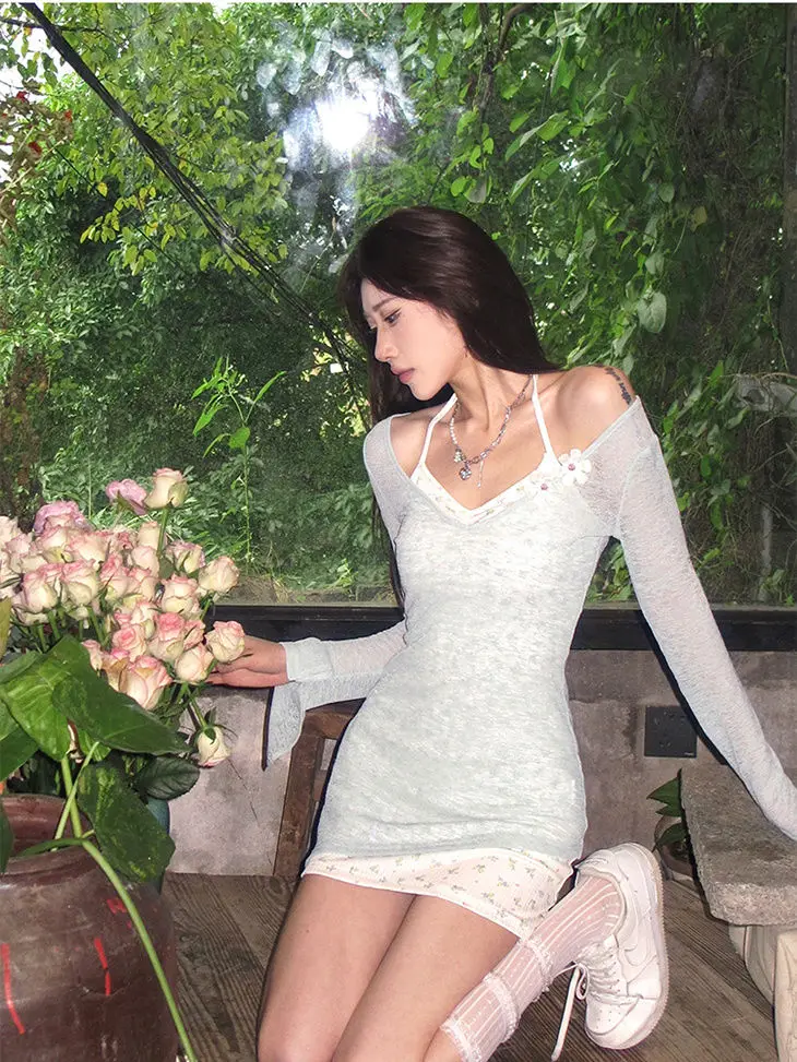 Cyflymder Summer Suit for Women Waist-hugging Short Printed Suspender Dress Thin + Long-sleeved Shirt Two-piece Set
