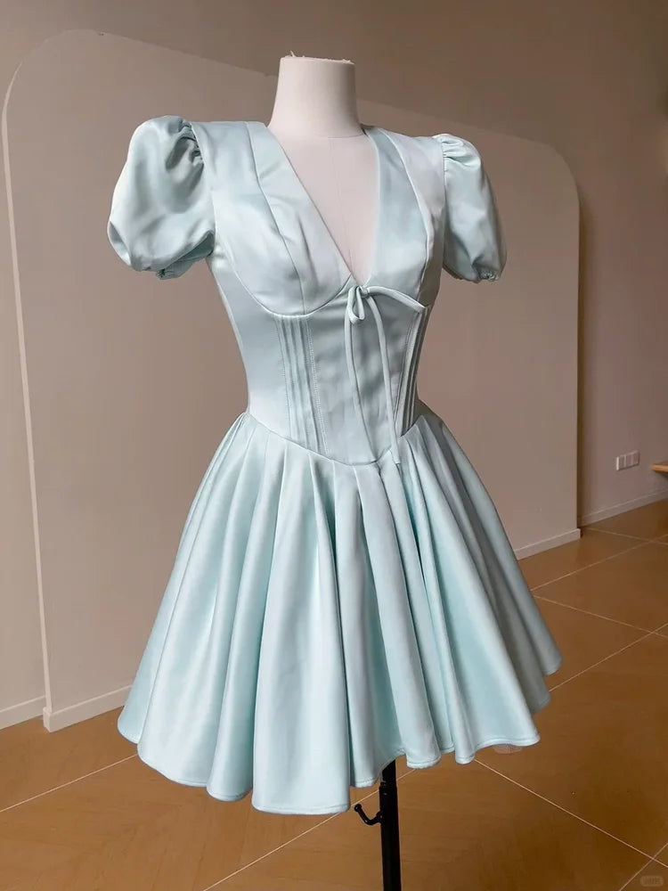 Cyflymder Summer Sweet Princess Bubble Sleeve Dress Women's Waist Tie Flared Mini Skirt