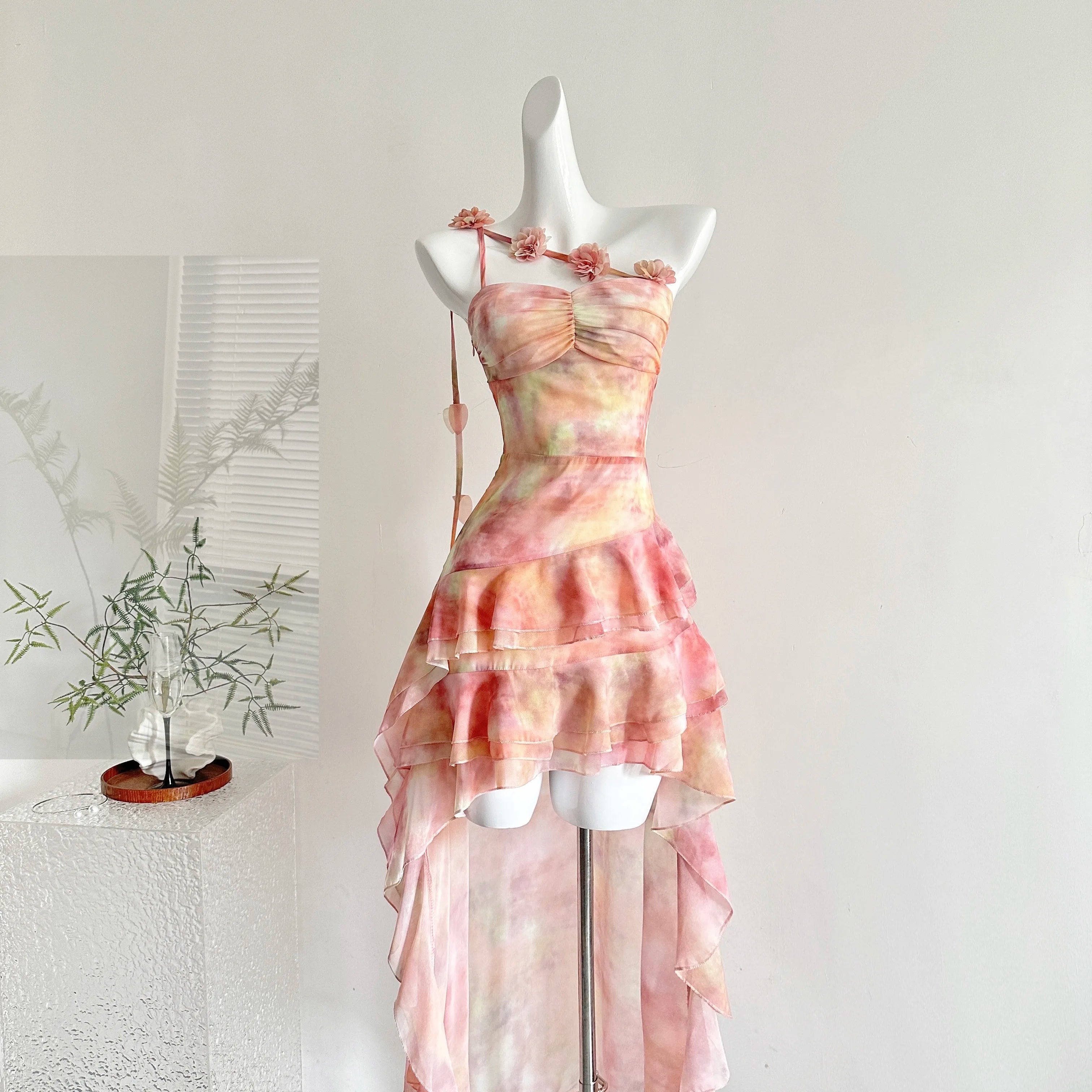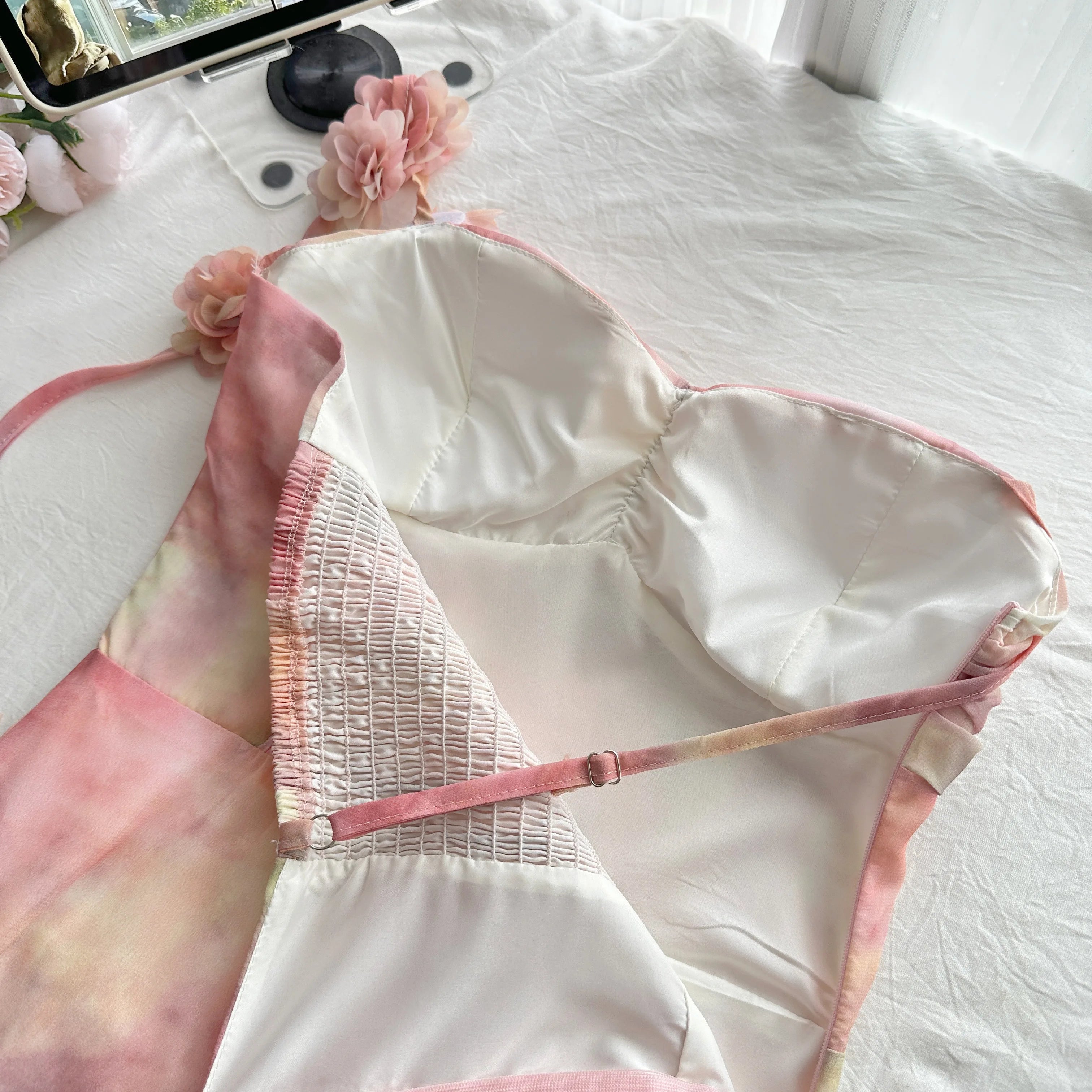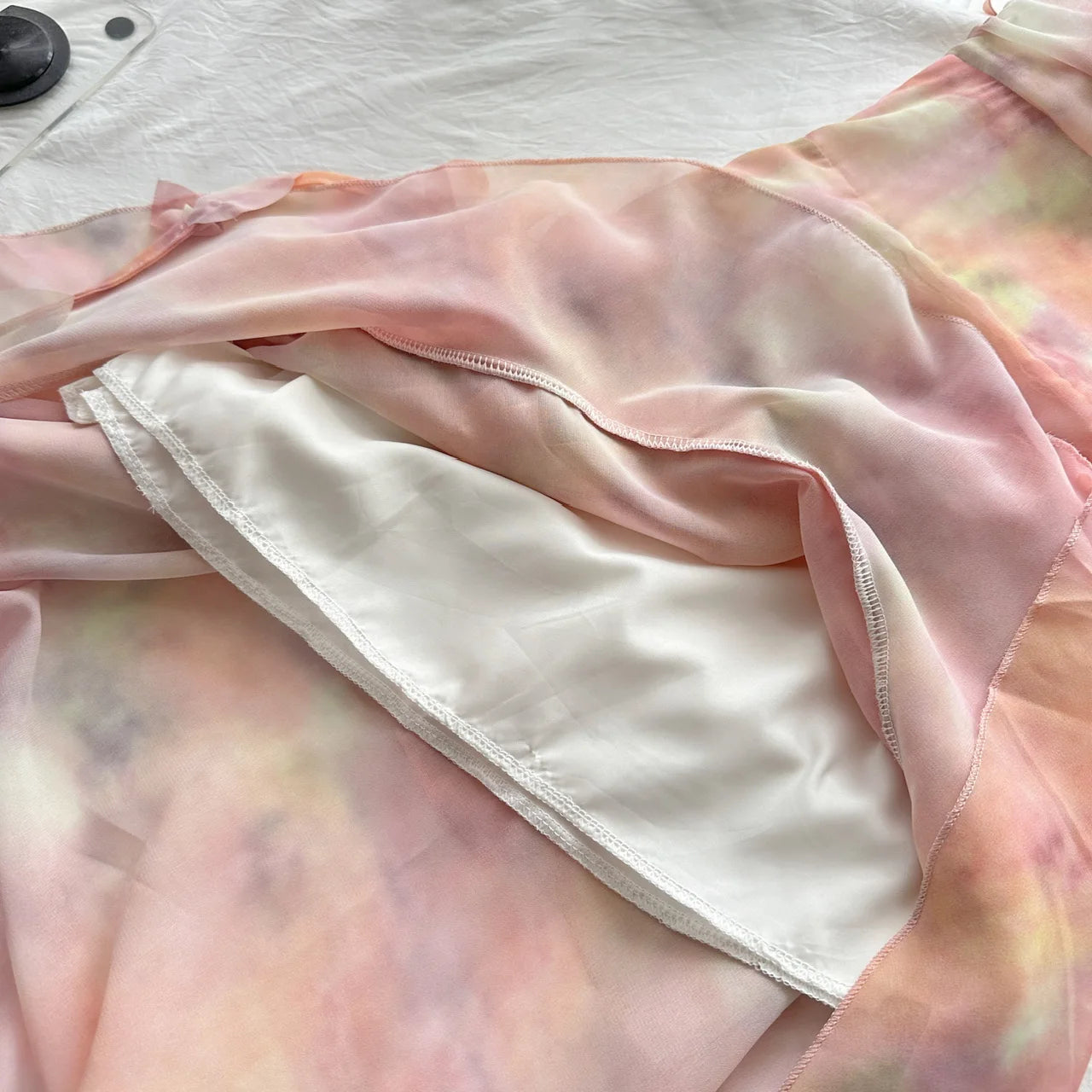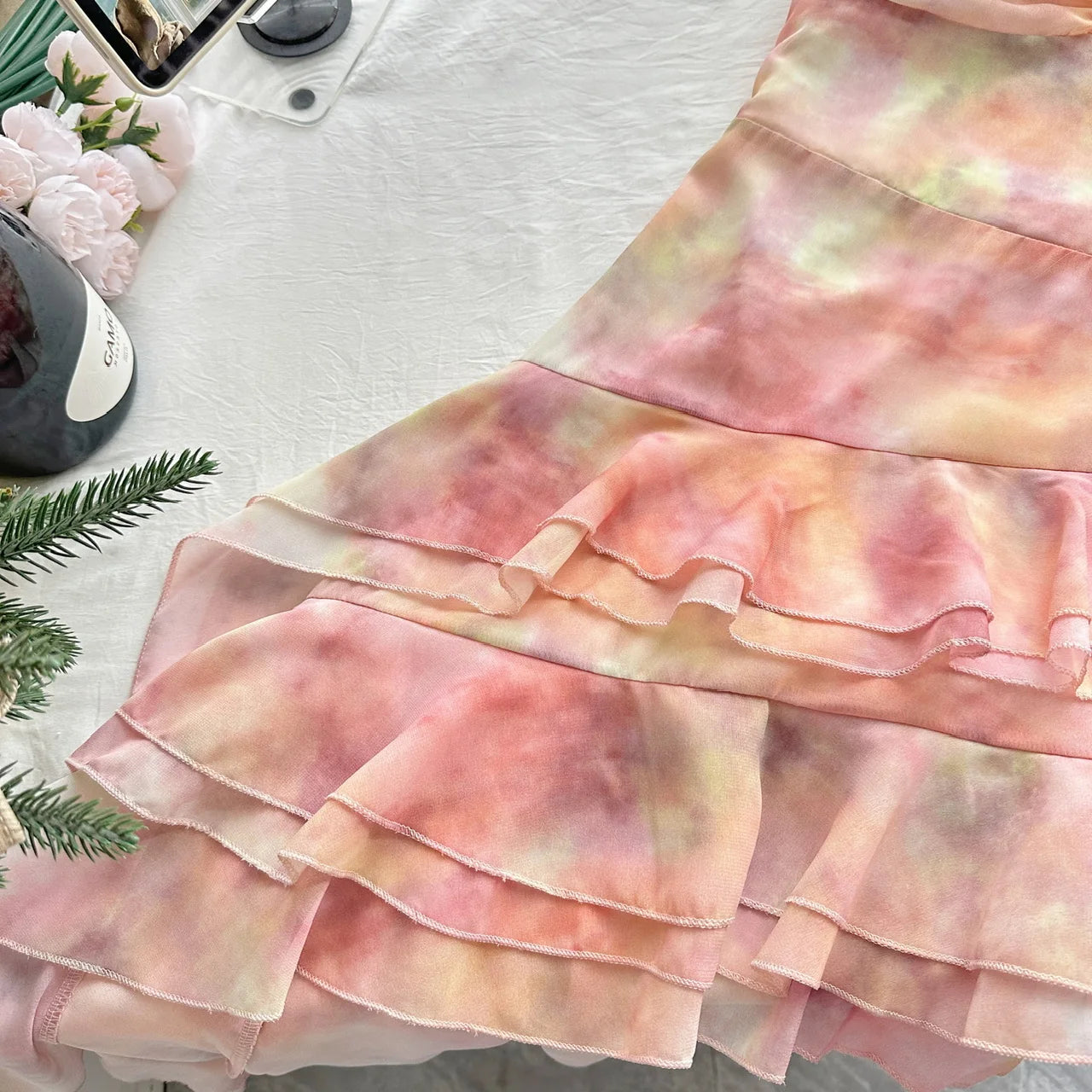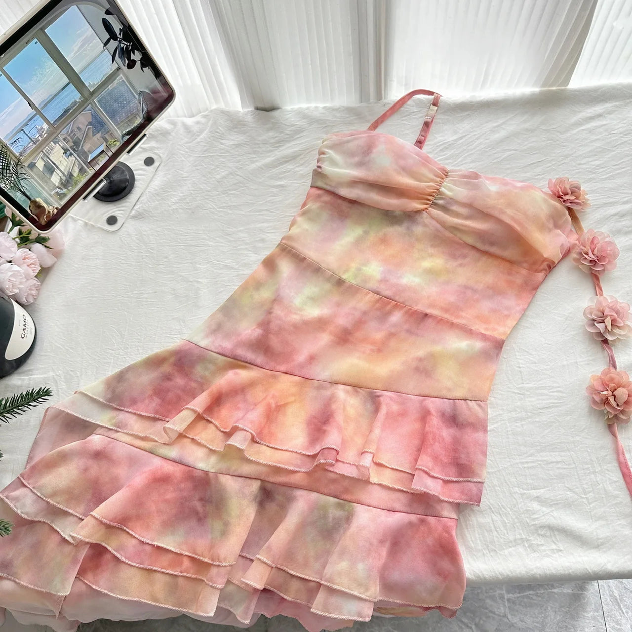 Cyflymder Summer Women French Vintage Graduation Off Shoulder Dress Mini Chiffon Tie Dye Frock Evening Shoujo Girl One-Piece Party 2000s