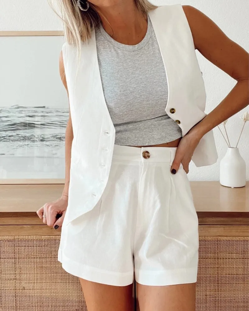 Cyflymder Summer Women Office 2 Piece Suit Fashion V-Neck Sleeveless Front Button Tank Pants Set Work Blazer Sets