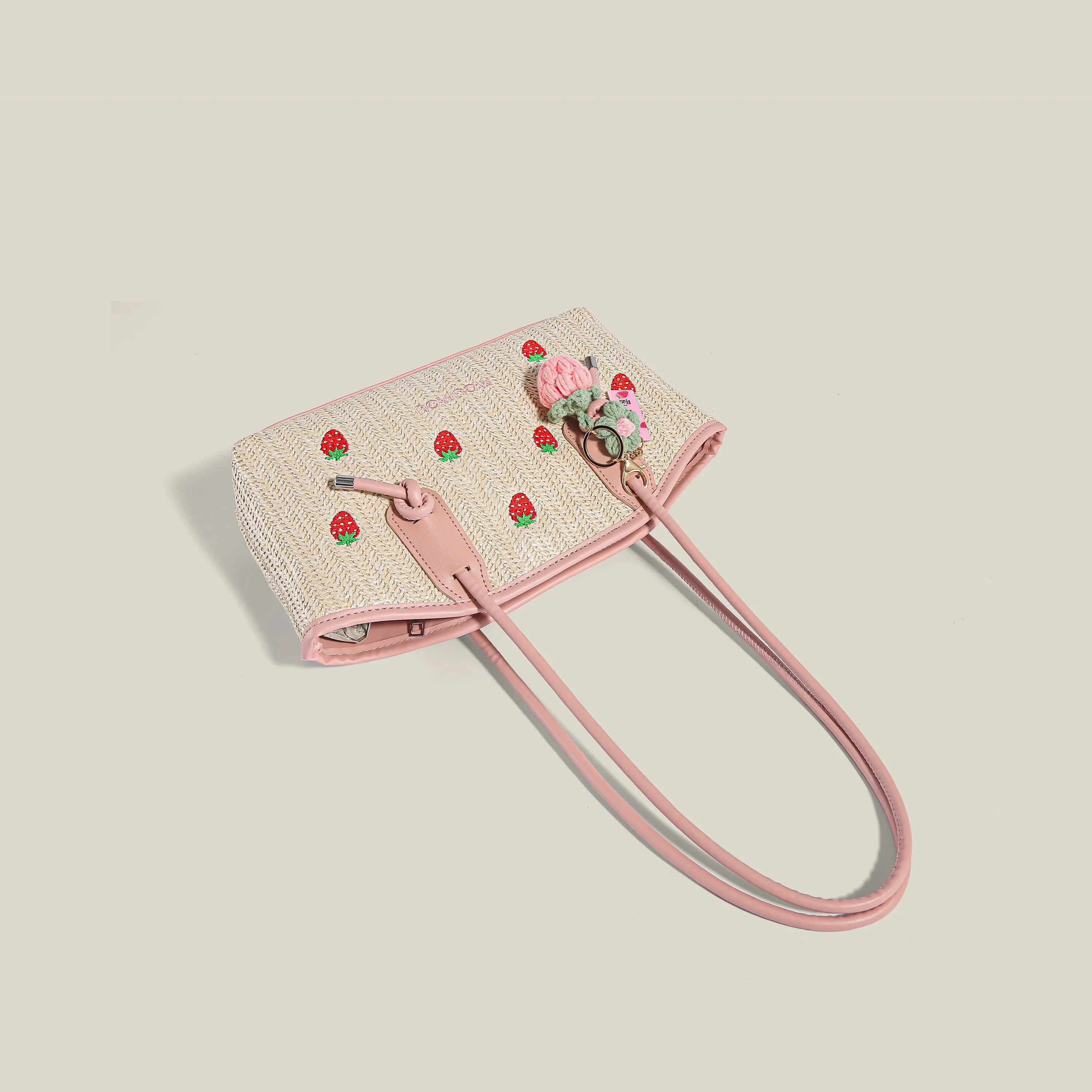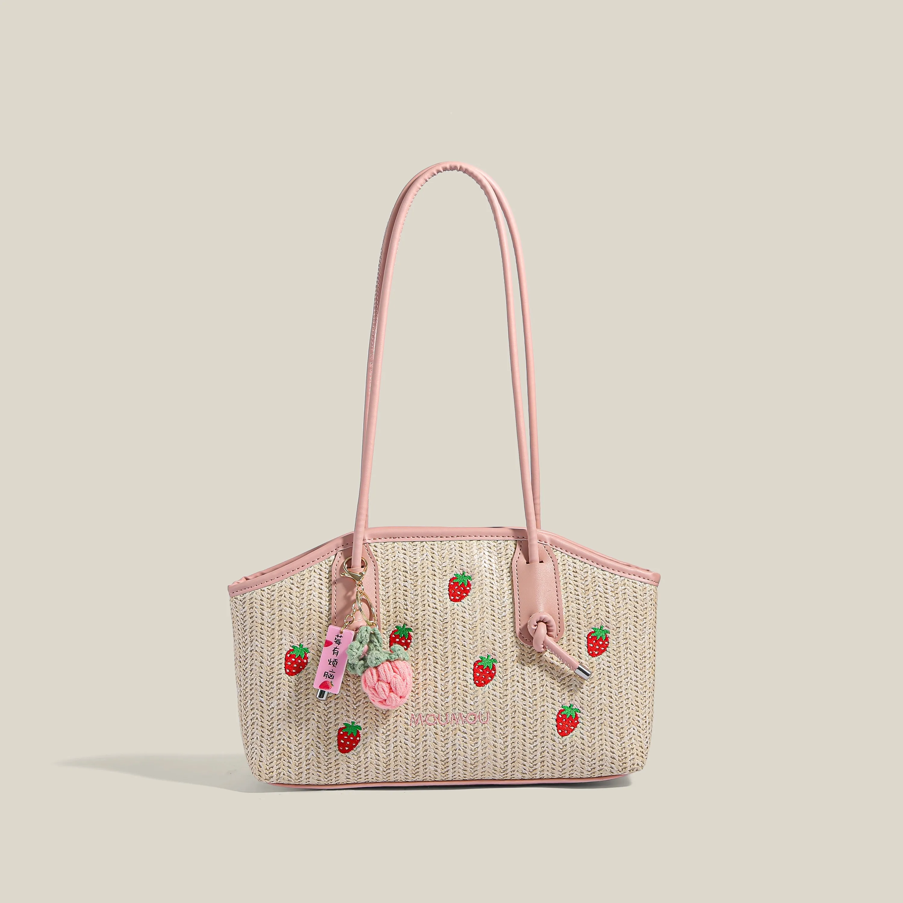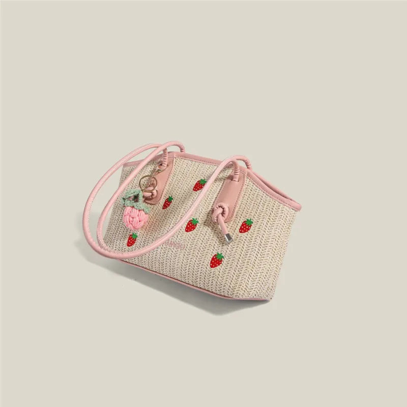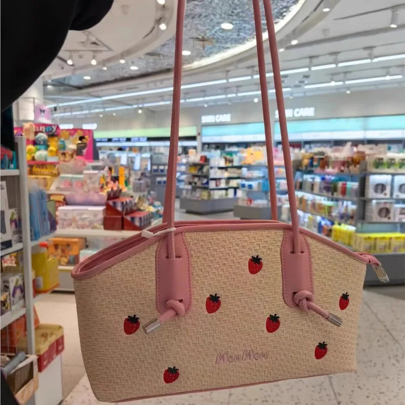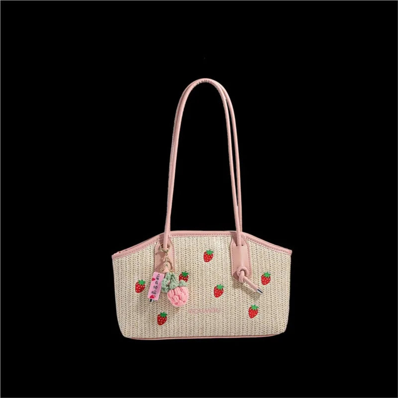 Cyflymder Sweet Cute Strawberry Tote Bag Pastoral Holiday Vacation Style Handbag Women Large Capacity Commuter Shoulder Crossbody Bag 2025