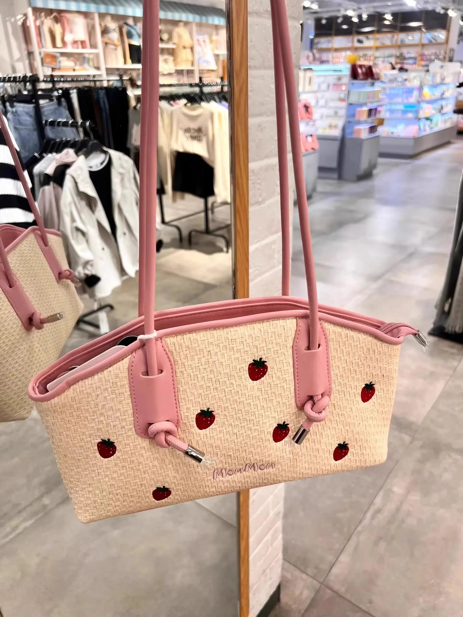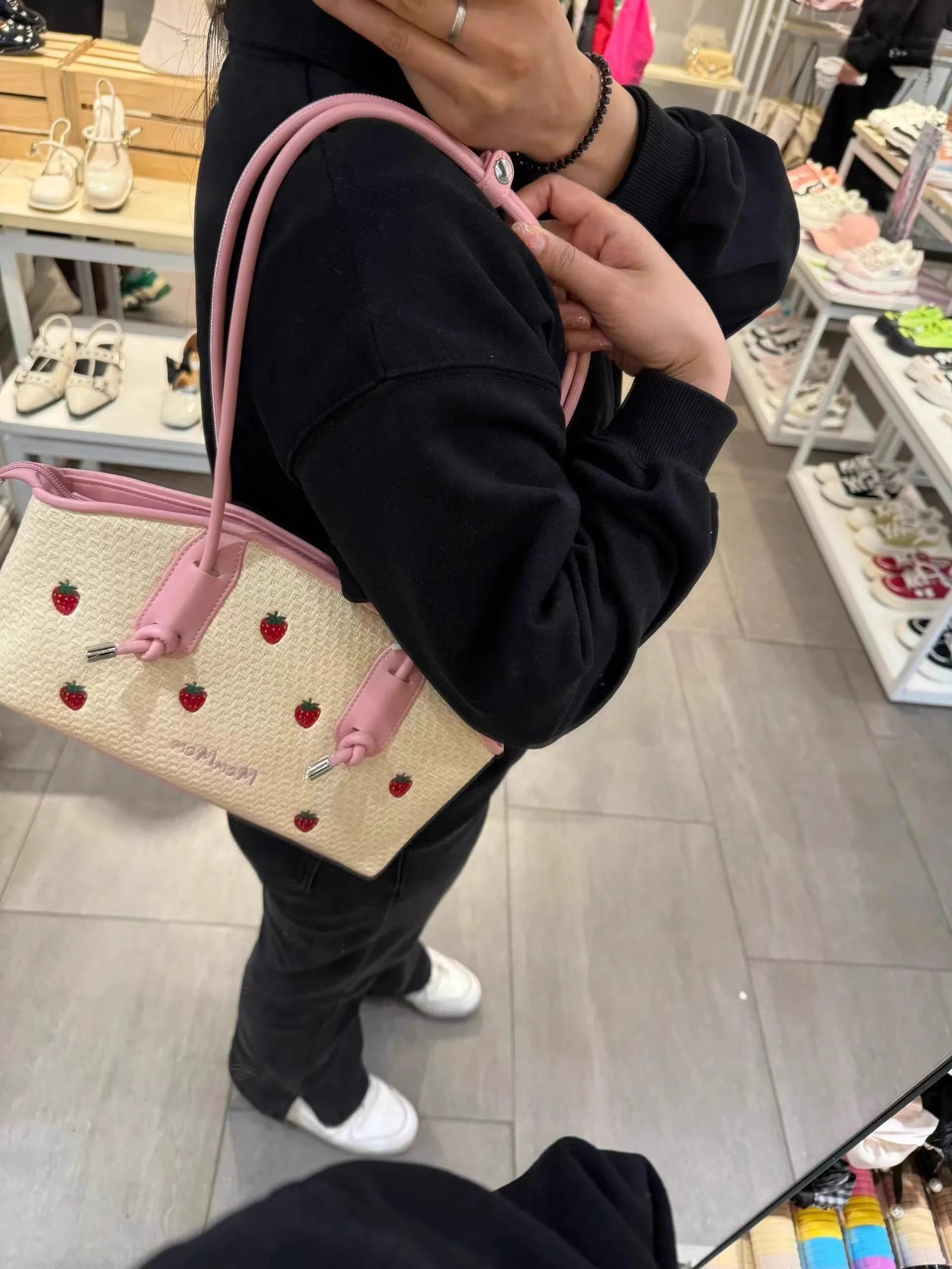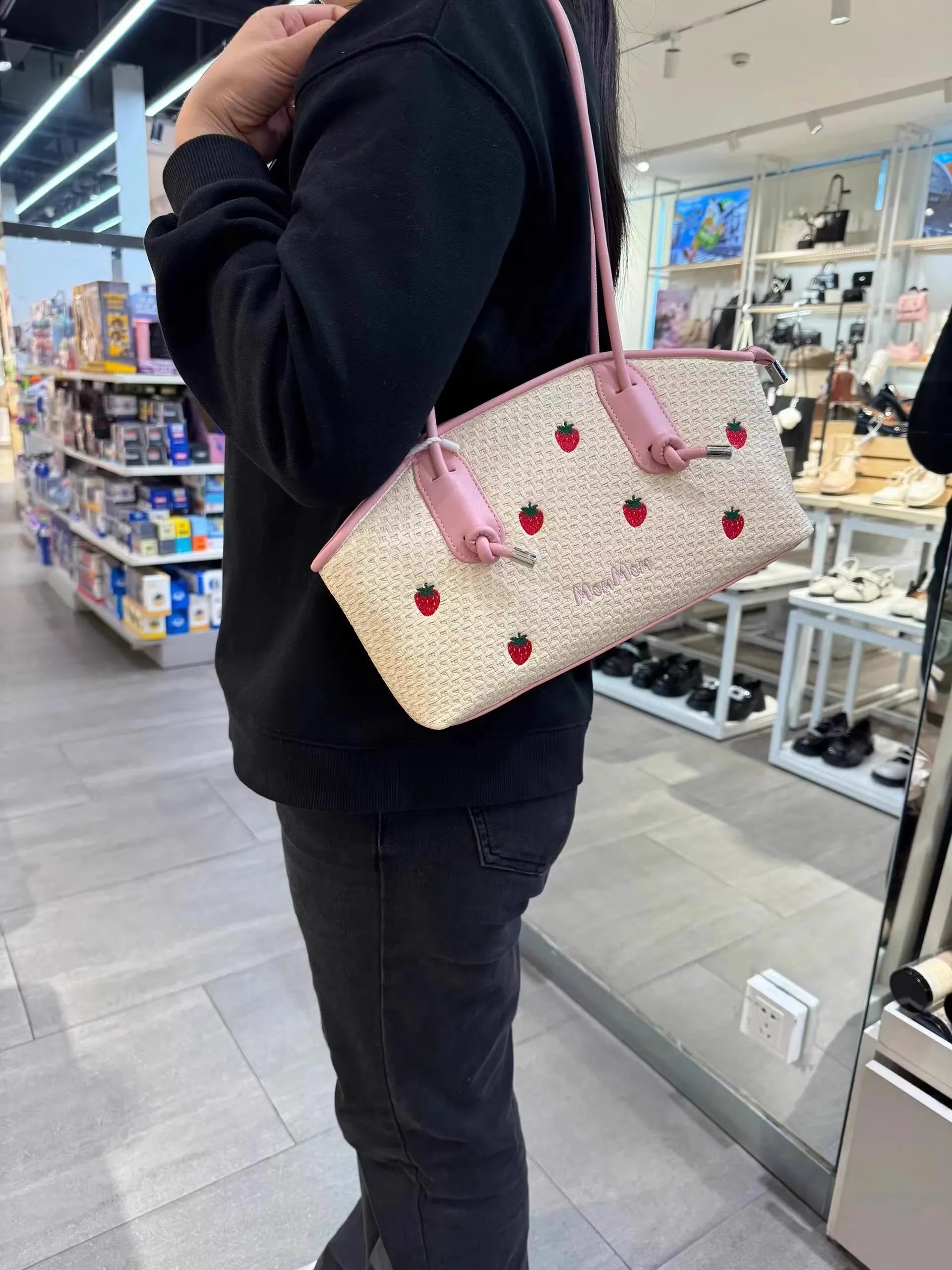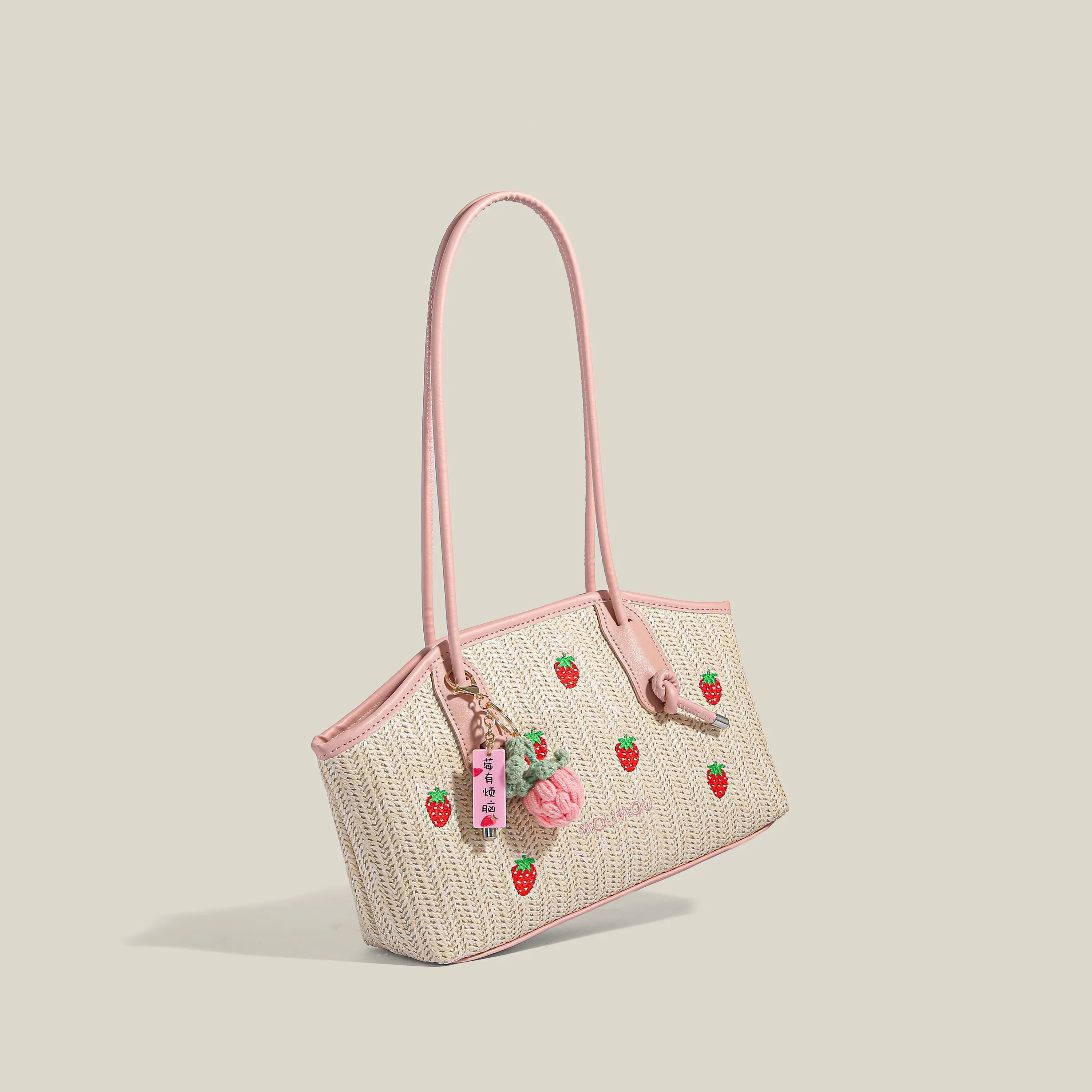 Cyflymder Sweet Cute Strawberry Tote Bag Pastoral Holiday Vacation Style Handbag Women Large Capacity Commuter Shoulder Crossbody Bag 2025