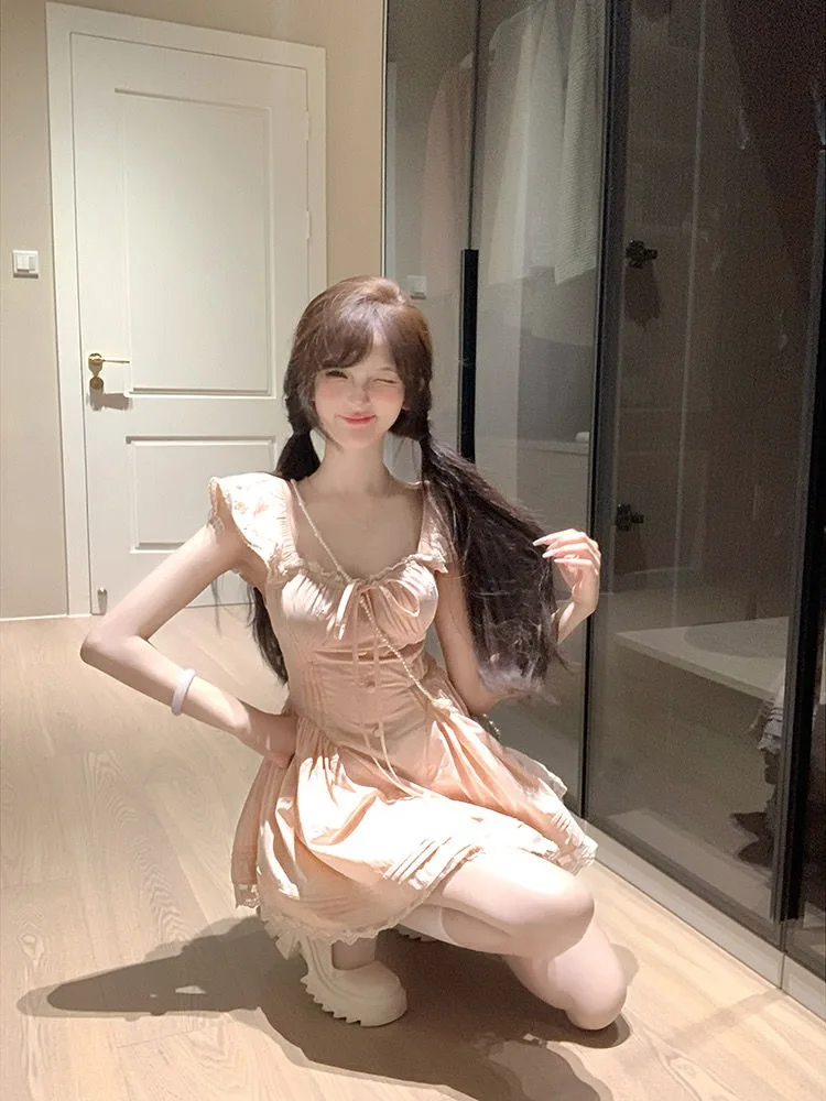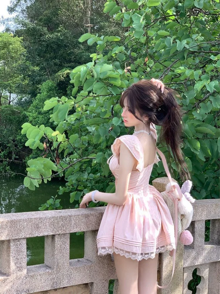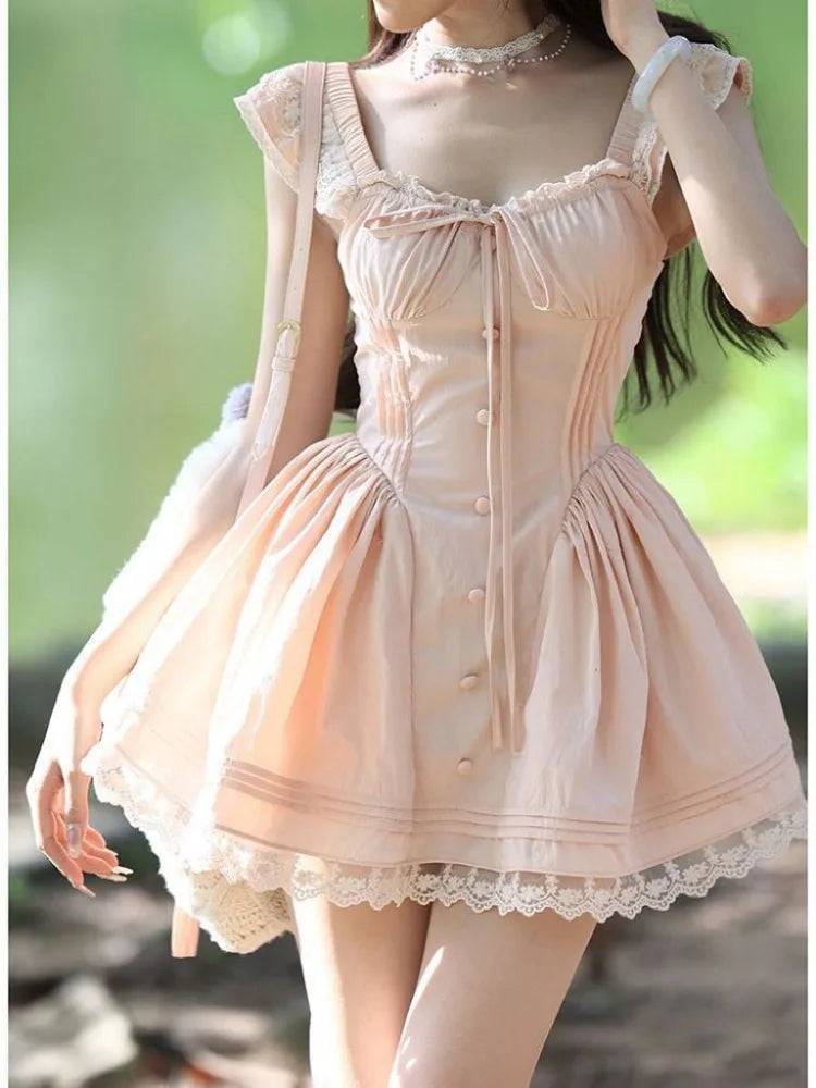 Cyflymder Sweet Dresses Women Flying Sleeve Lace Patchwork Square Collar Slim Bandage French Style Spring Summer Elegant Dress