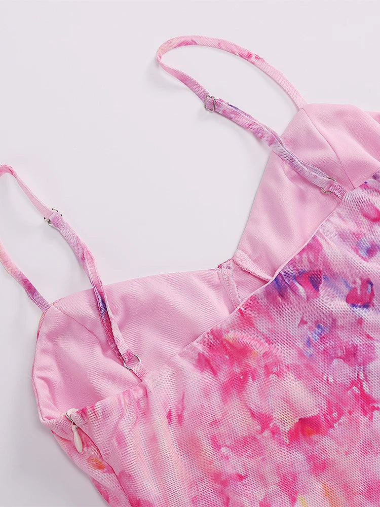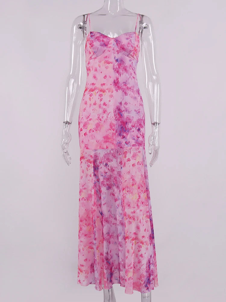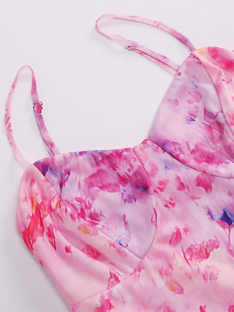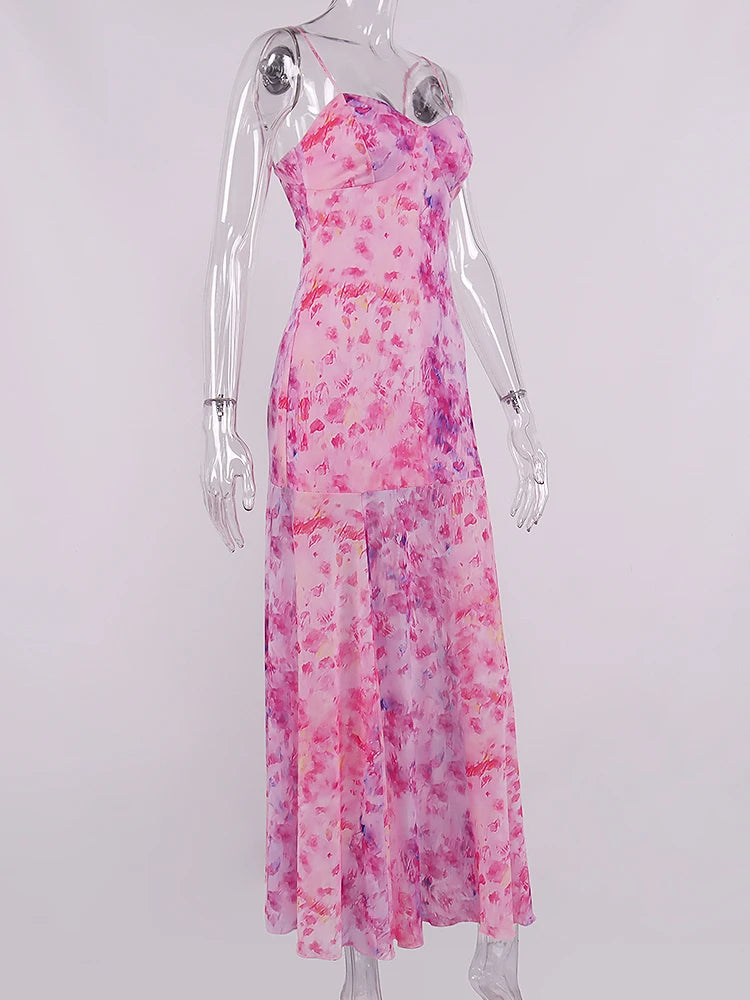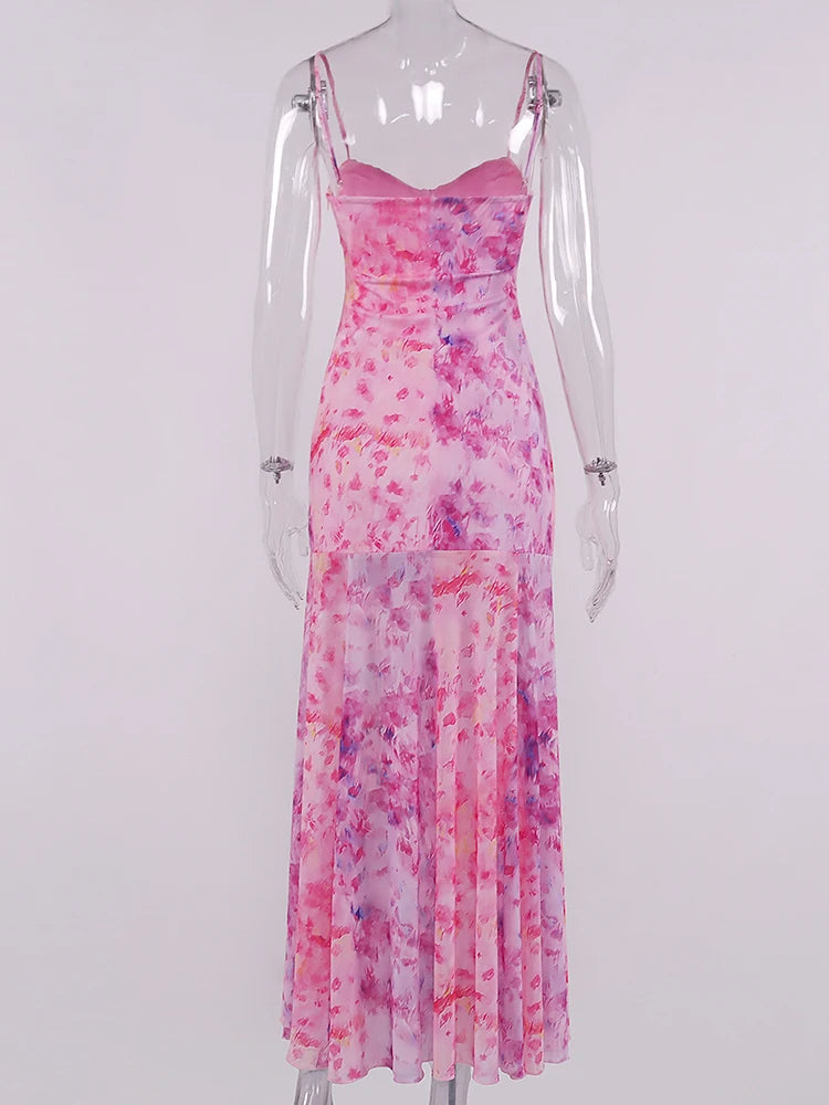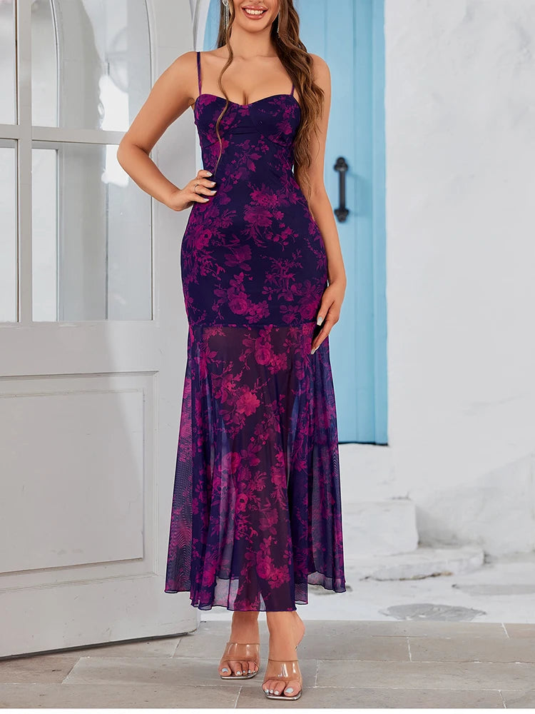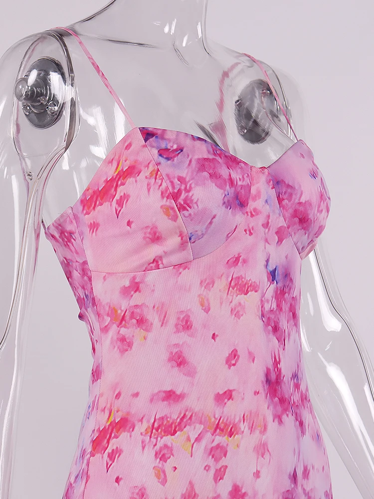 Cyflymder Sweet Floral Camisole Long Dress For Women Summer Print Empire Bodycon Vestido Beach Holiday Elegant Mesh Robes Female
