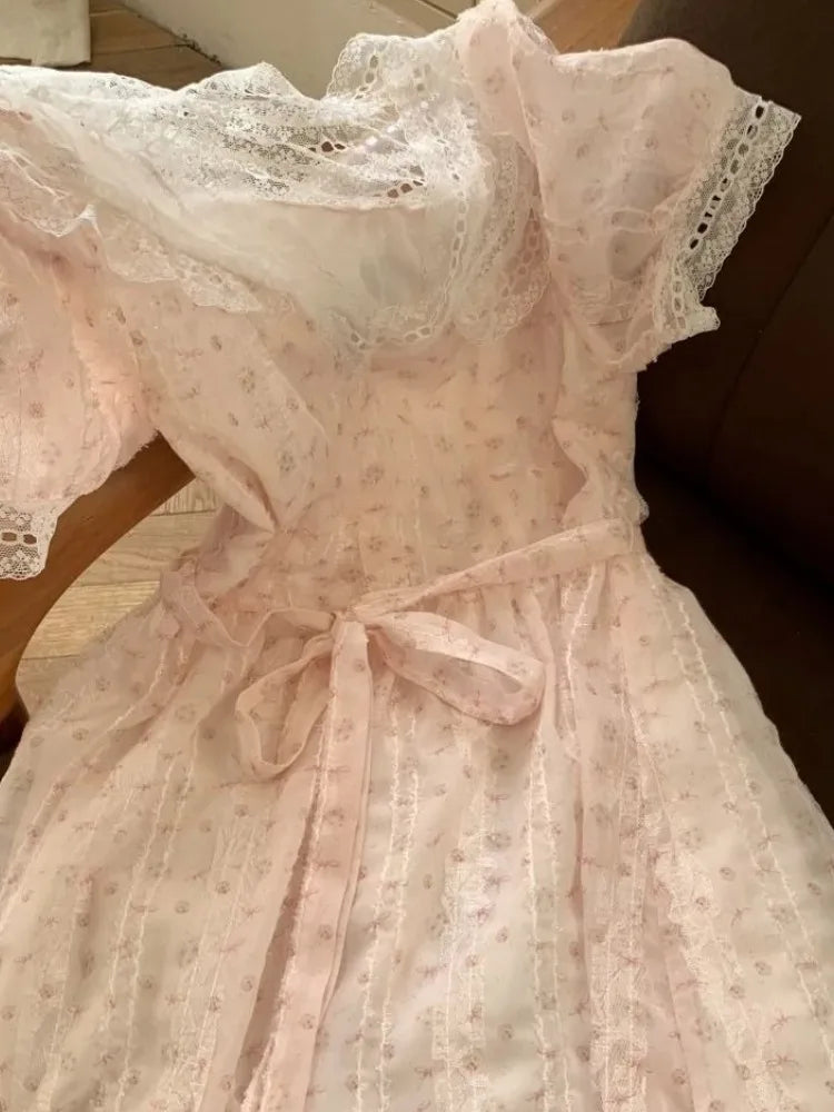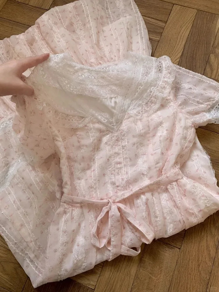 Cyflymder Sweet Girly Lace Spliced Short-sleeved Dresses Women Summer Elegant V-neck Waist Slim Floral Midi Dress Korea Chic Party Outfits