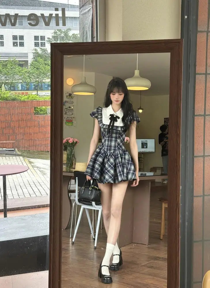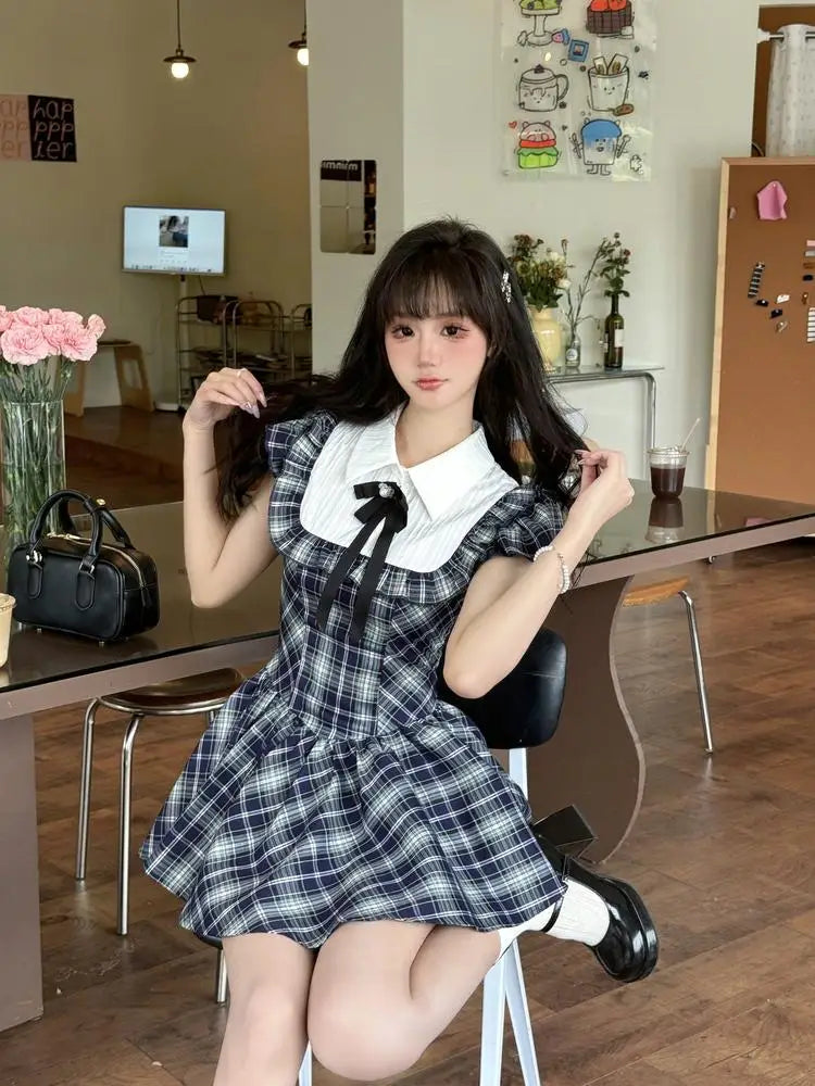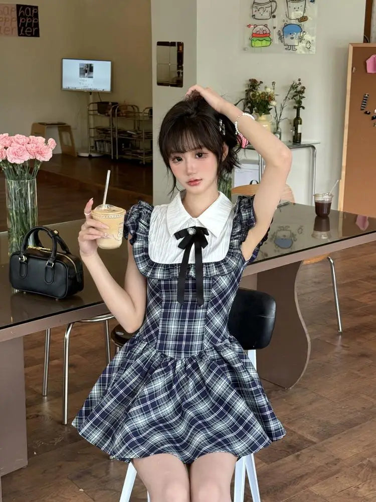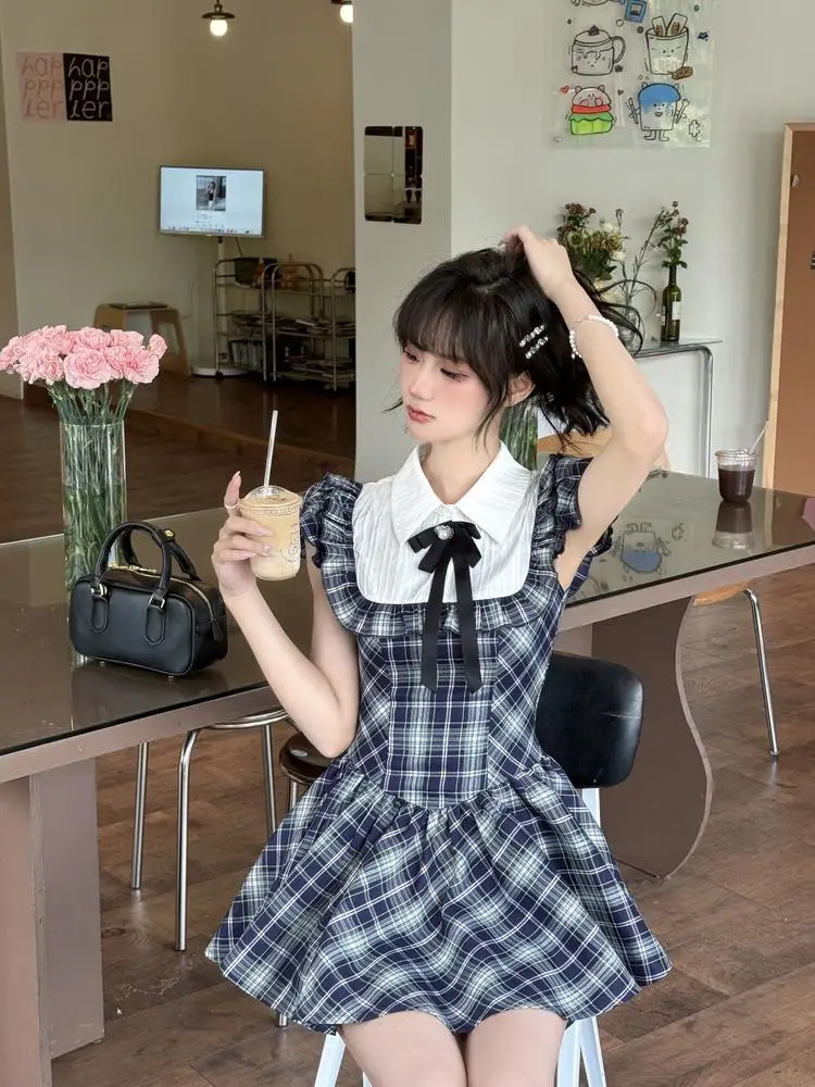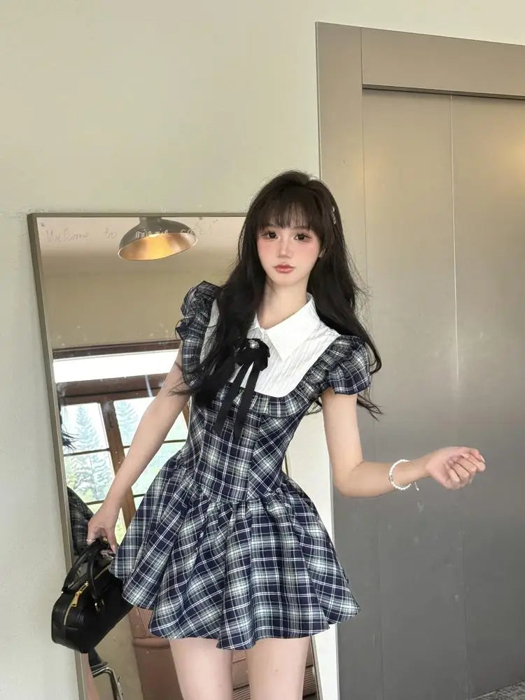 Cyflymder Sweet Hot Girl College Style Slim Fit Fluffy Dress for Women Summer Retro Plaid Fake Two-piece Dress Fashion Female Clothes