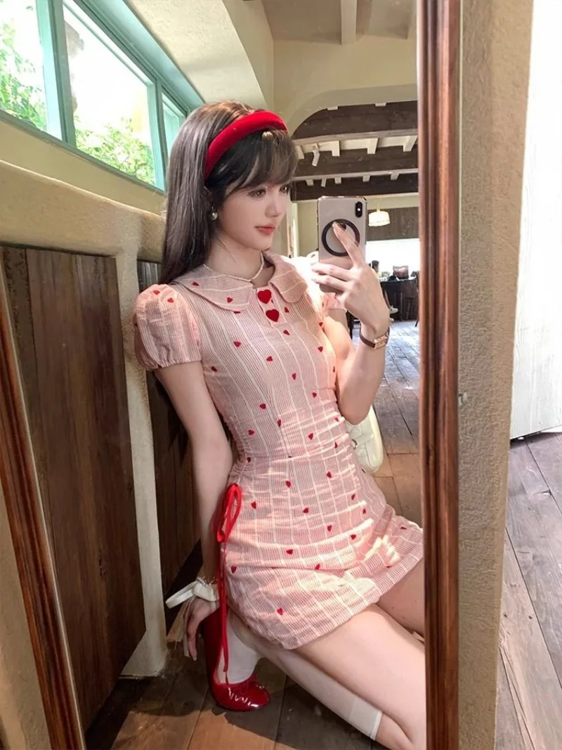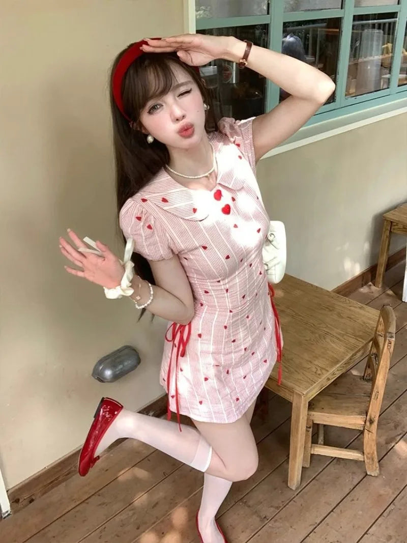 Cyflymder Sweet Hot Girl Heart Printed Striped Dress for Women's Summer Slim Fit Bubble Sleeves A-line Dress Fashion Female Clothes
