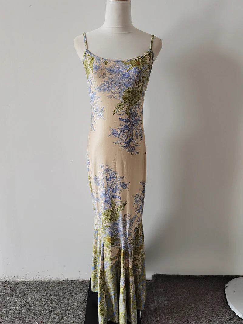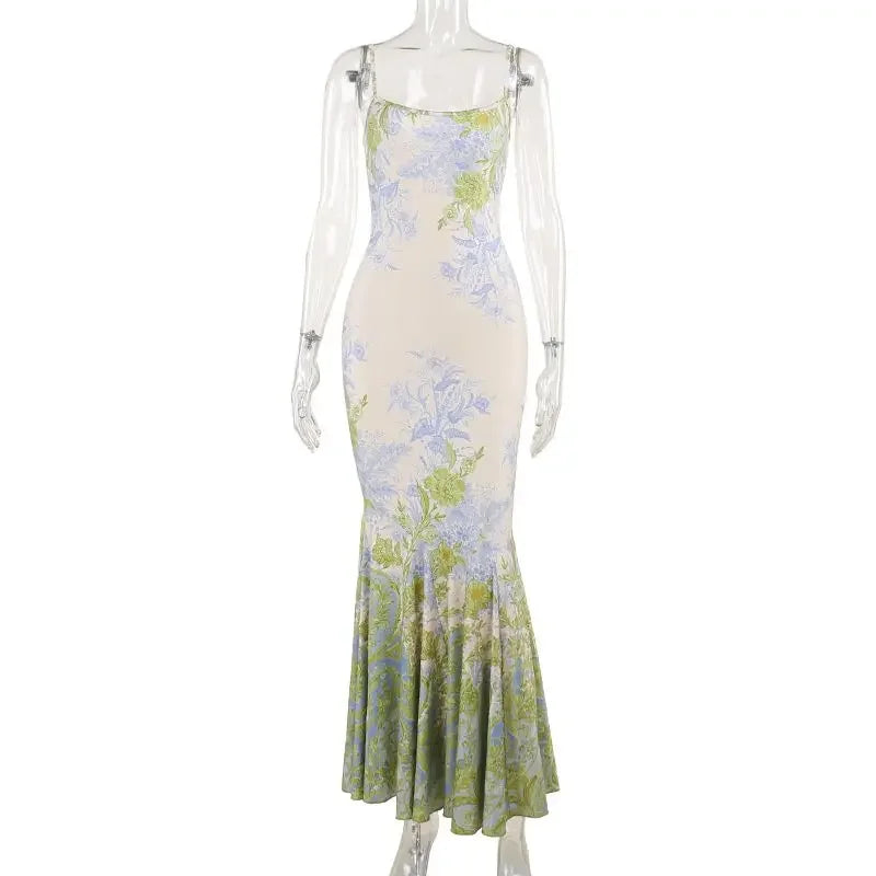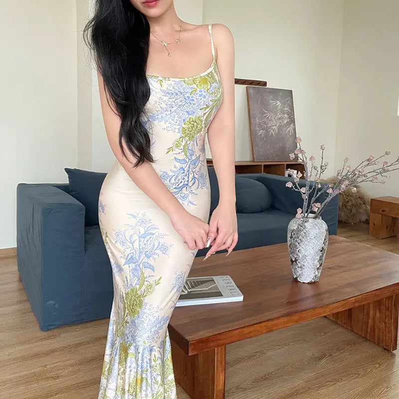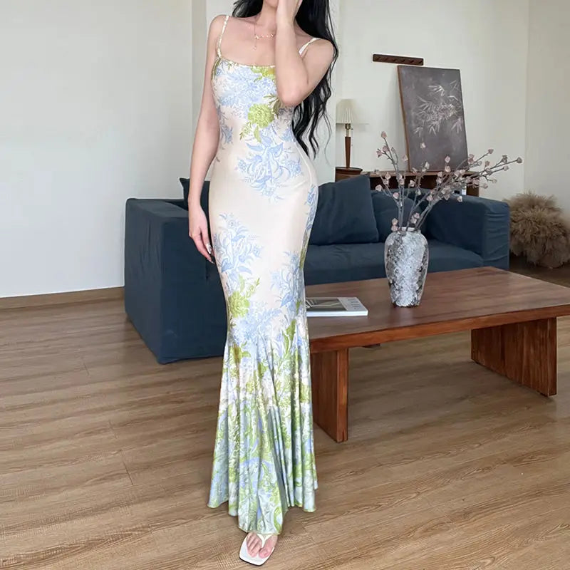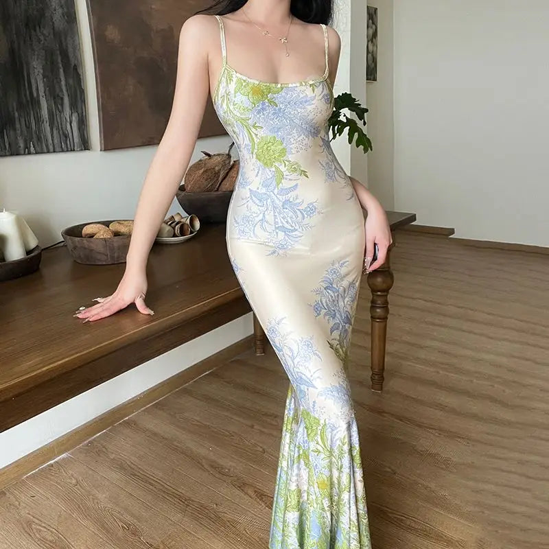 Cyflymder Sweet Hot Girl Pure Sexy Printed Strap Dress for Women's Summer Retro Square Collar Slim Fit Mermaid Long Dress Female Clothes
