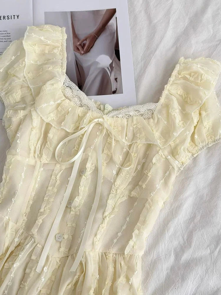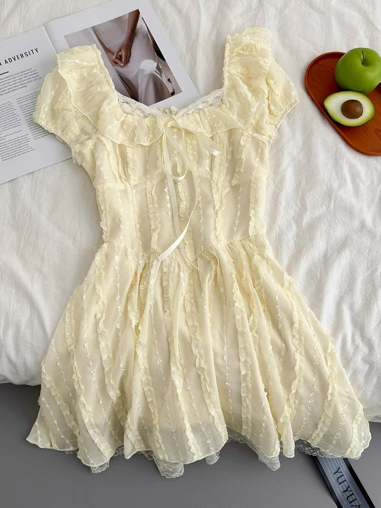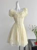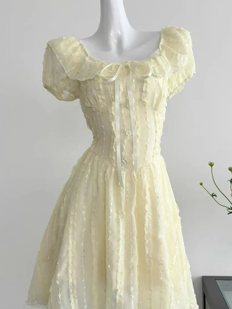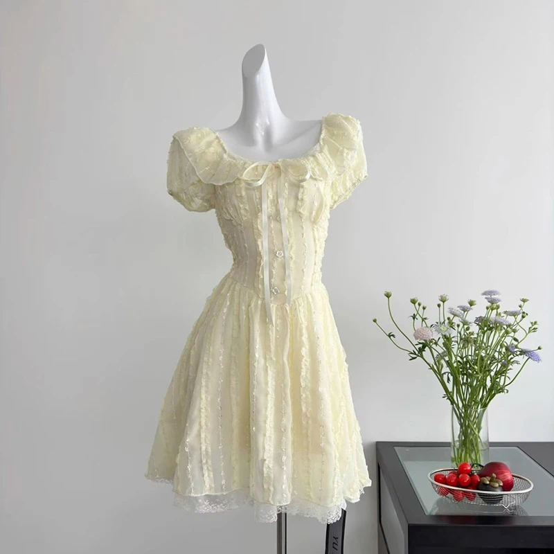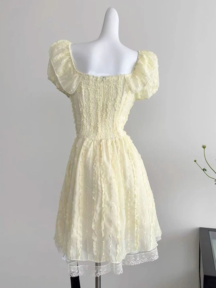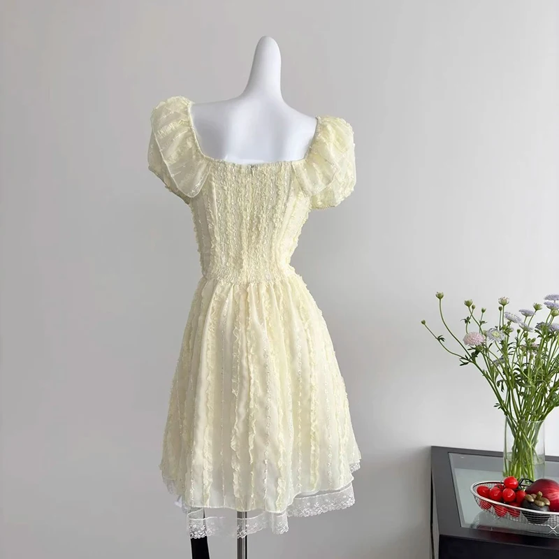 Cyflymder Sweet Slim Yellow Dress Women Elegant Vintage Square Collar Mini Dress French Retro Puffy Sleeve Lace Patchwork Vestidos