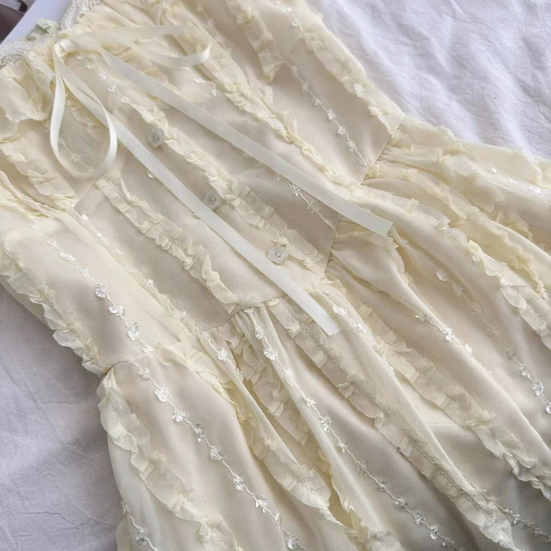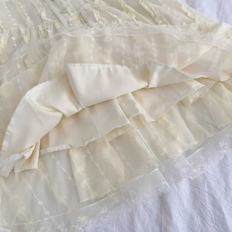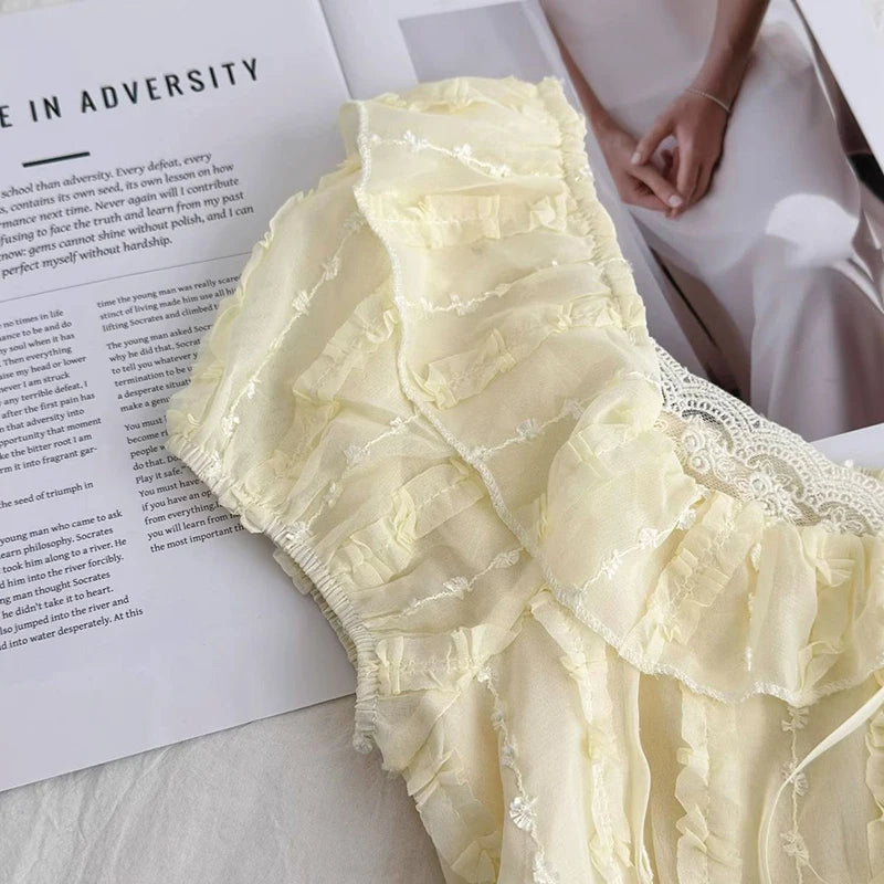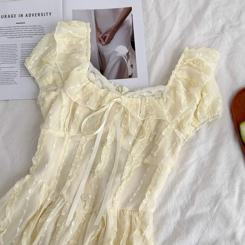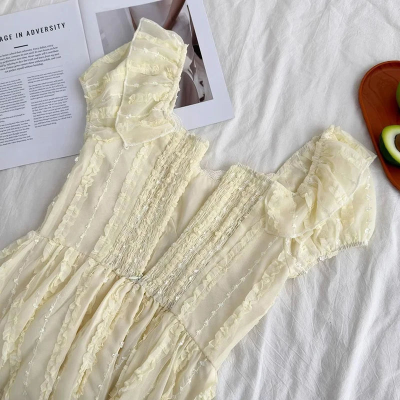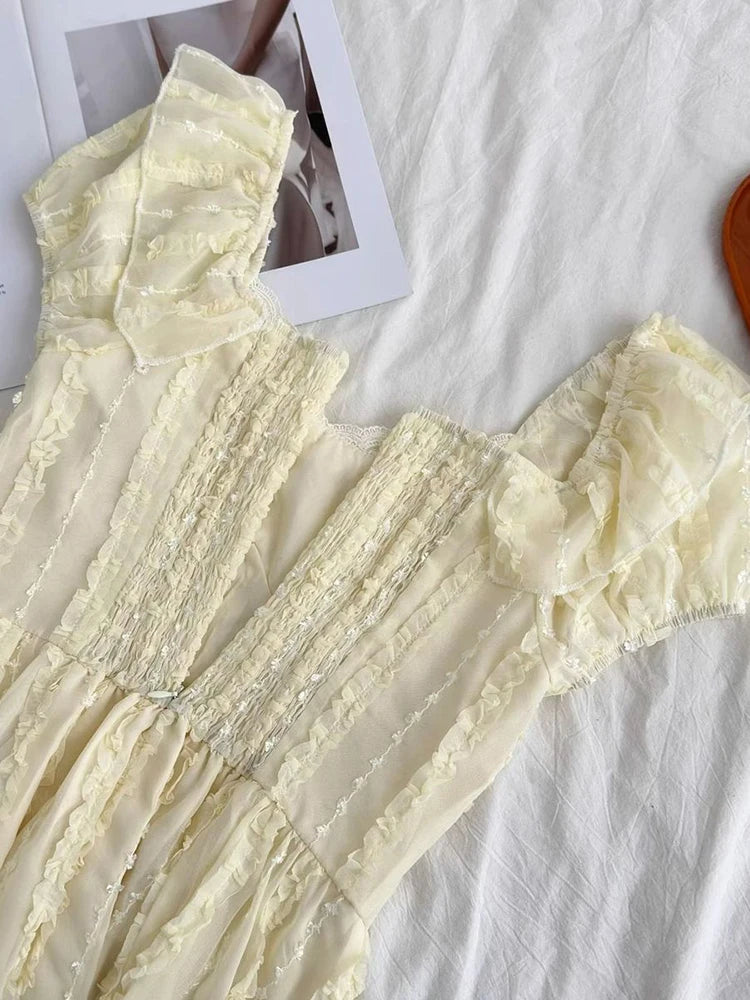Cyflymder Sweet Slim Yellow Dress Women Elegant Vintage Square Collar Mini Dress French Retro Puffy Sleeve Lace Patchwork Vestidos