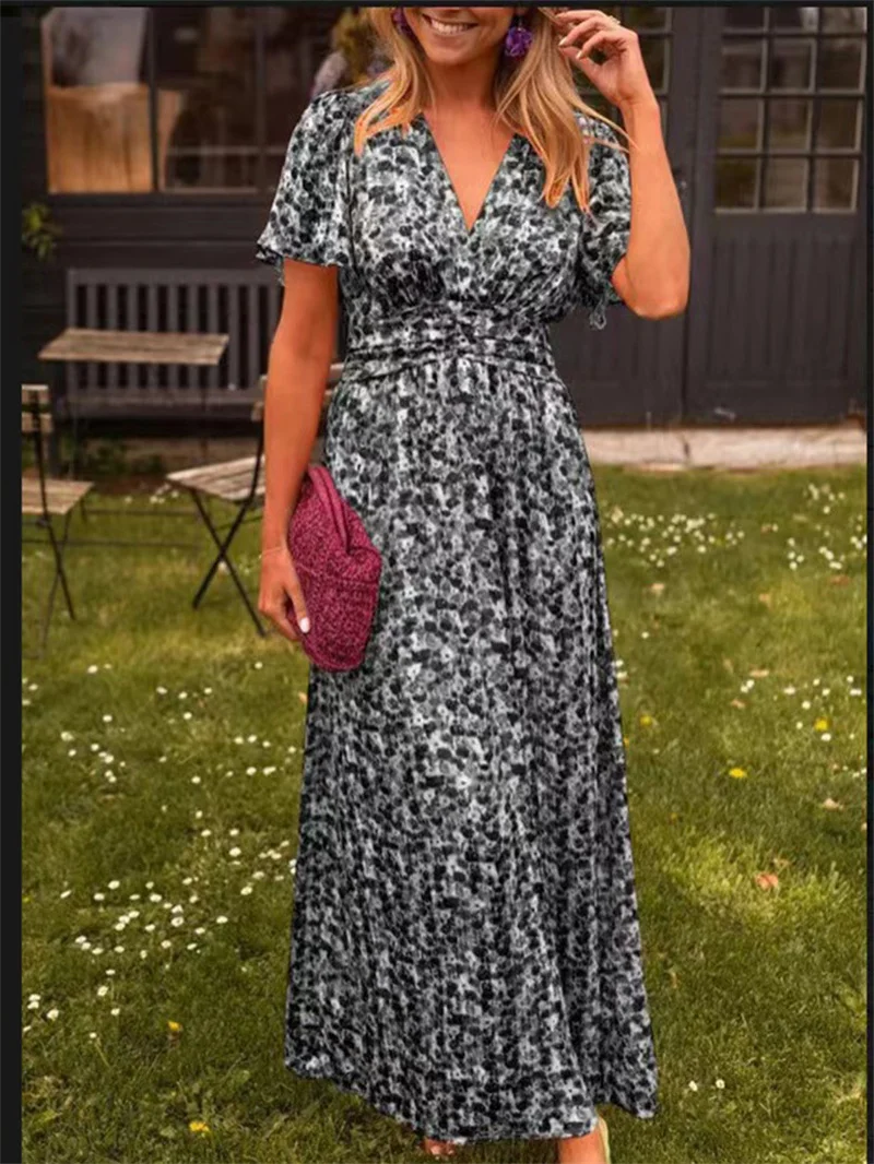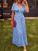 Cyflymder Sweet Style Small Flower Dresses Women High Waist Slim Fit Deep V Neck Pullover Dress Summer Long Gown Daily Casual Female Frock