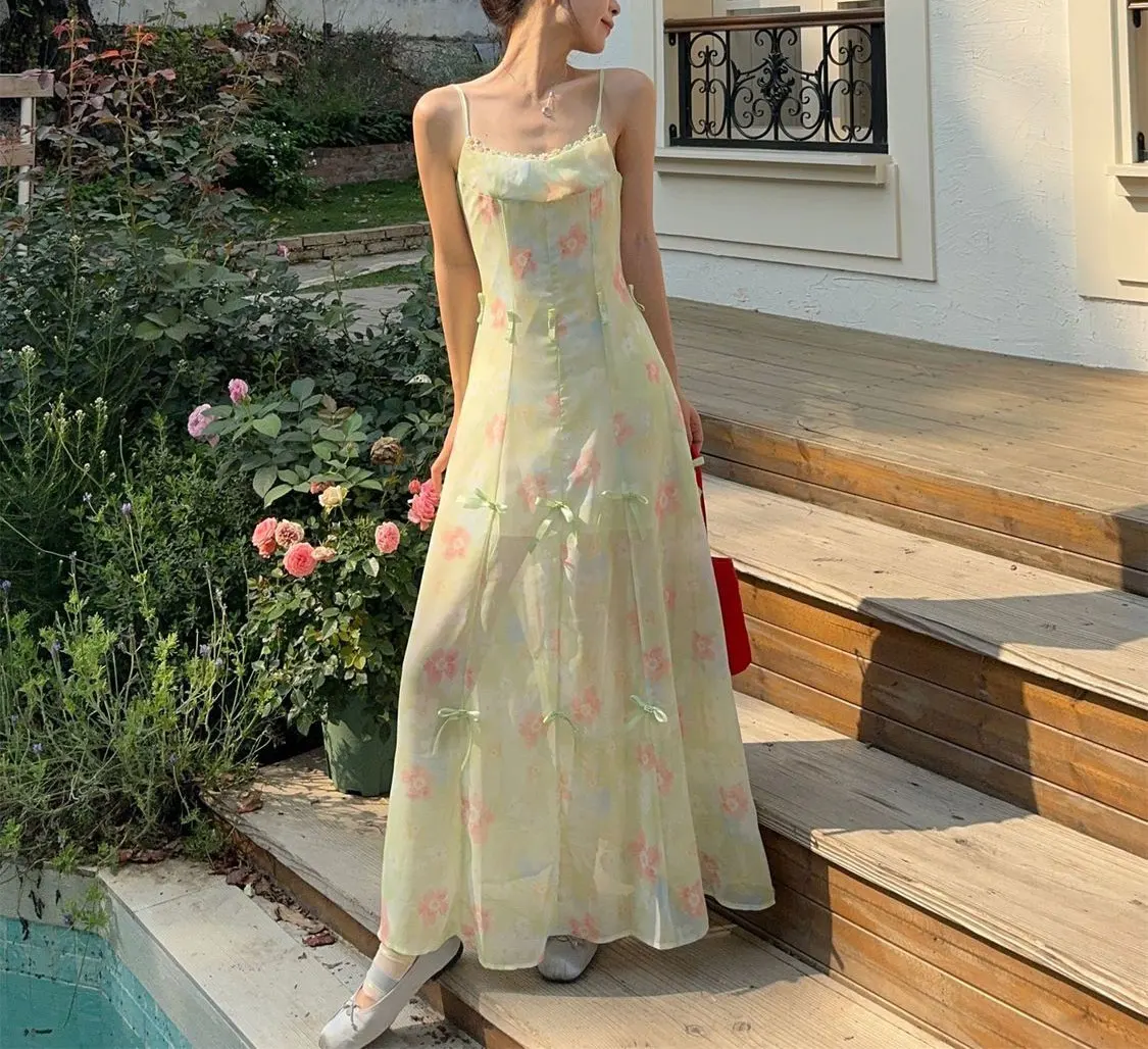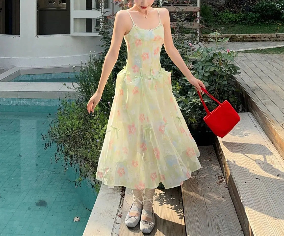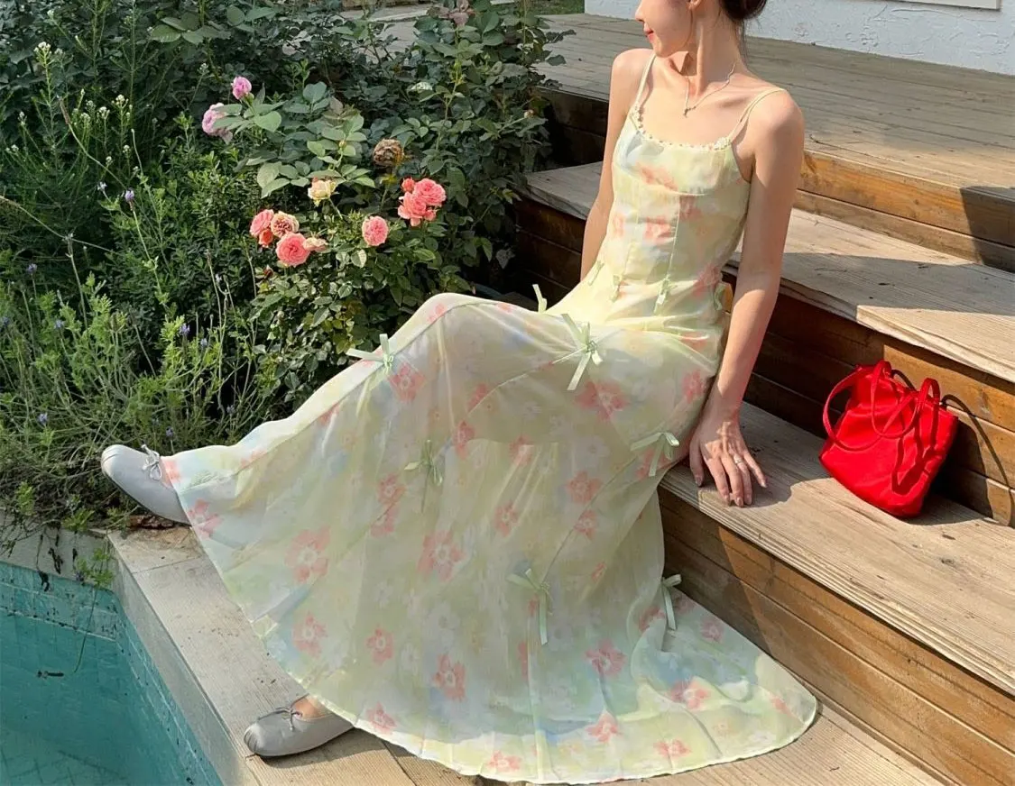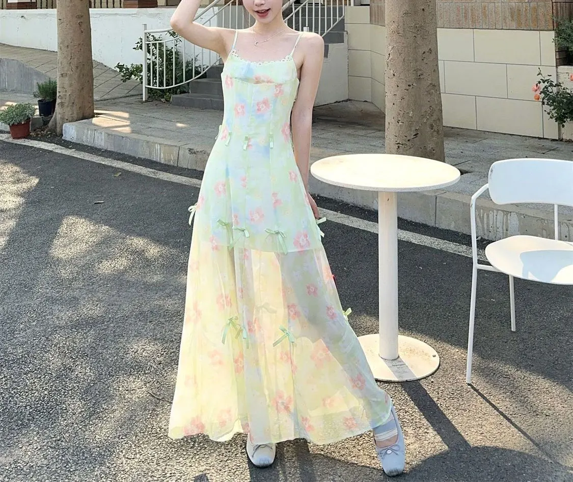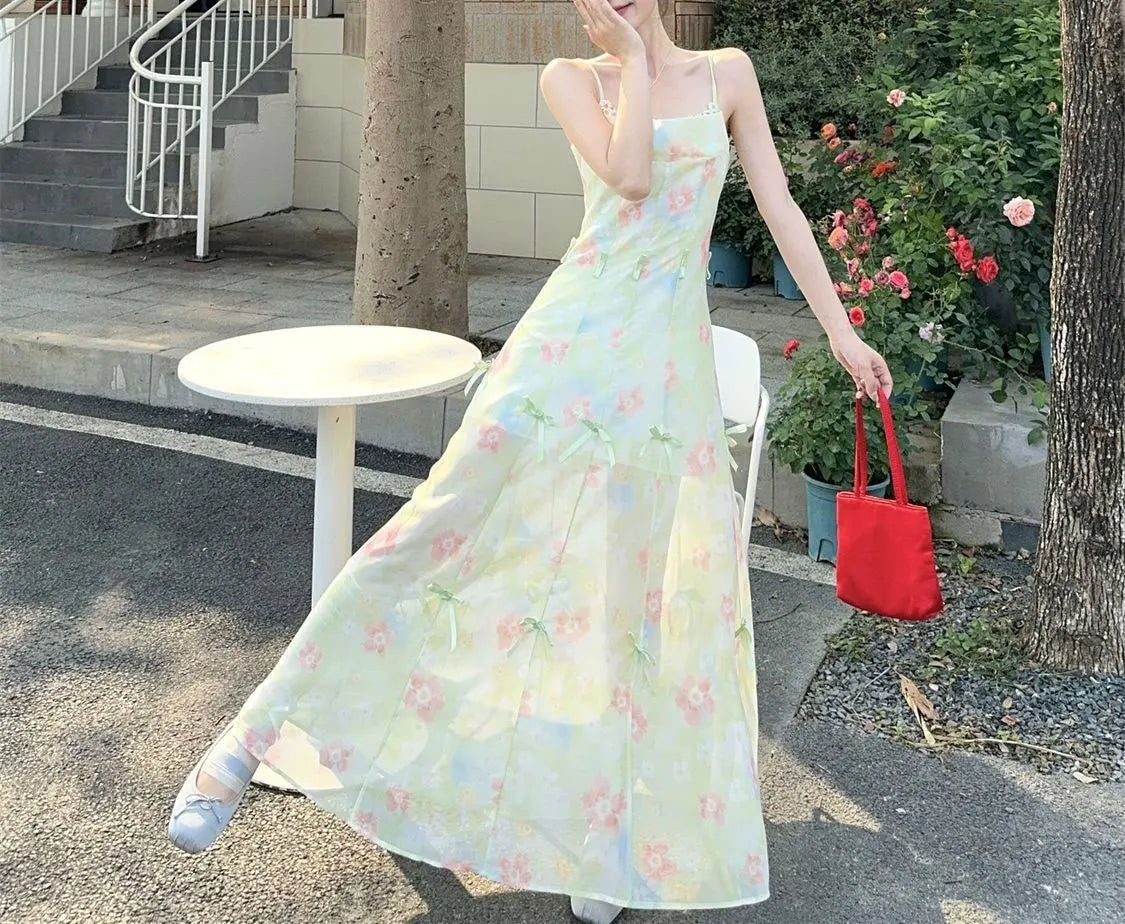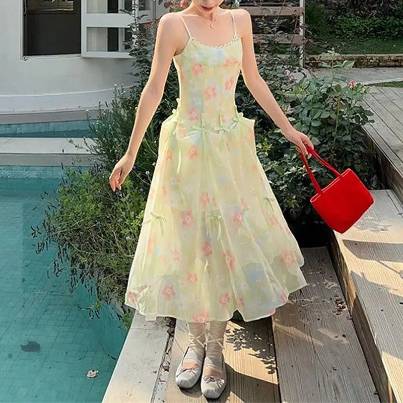 Cyflymder Sweet Vacation Style Strap Long Dress Women's Clothing Broken Flowers Summer A-Line Fashion Bow Three Ways of Wearing Dresses