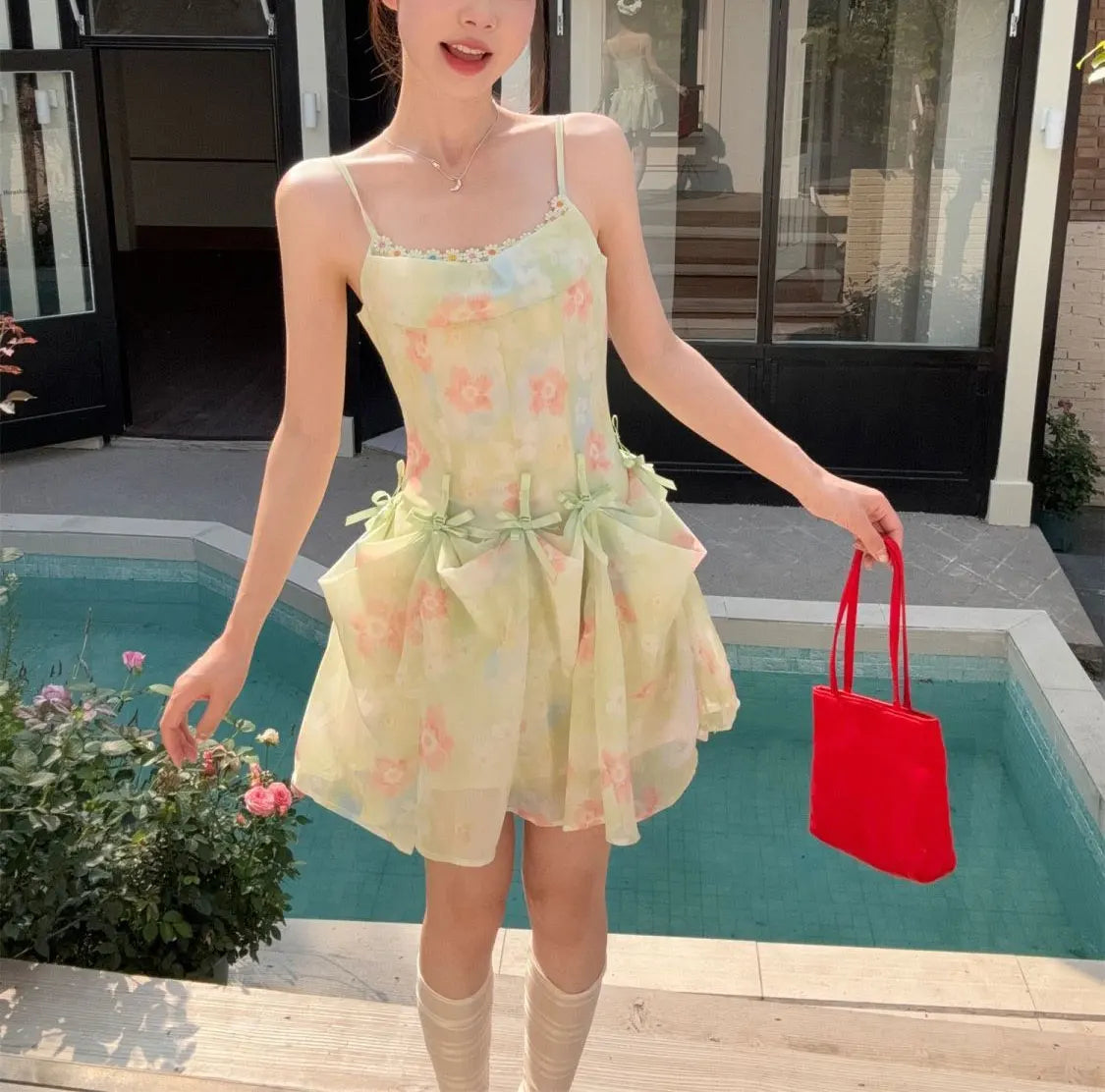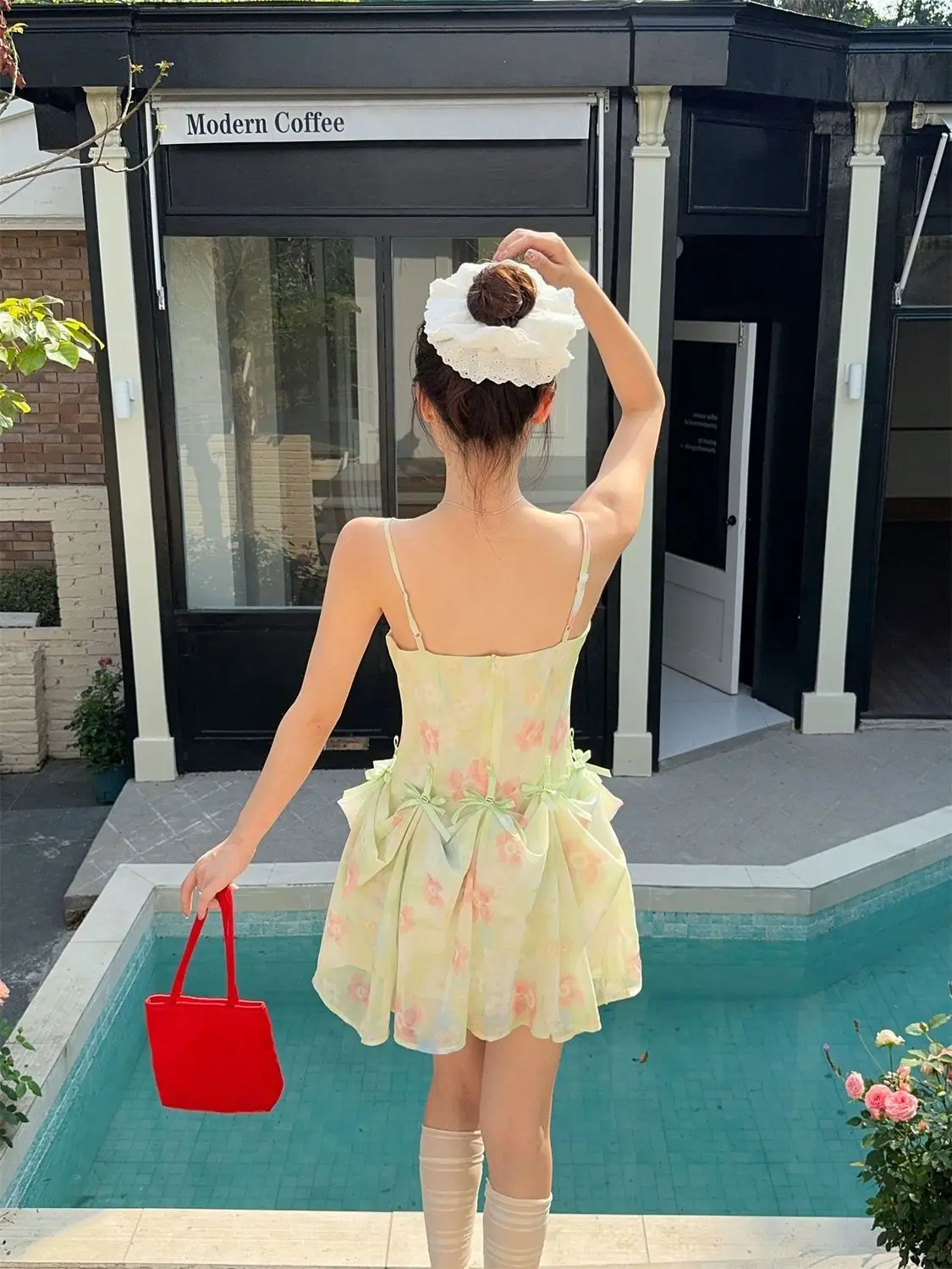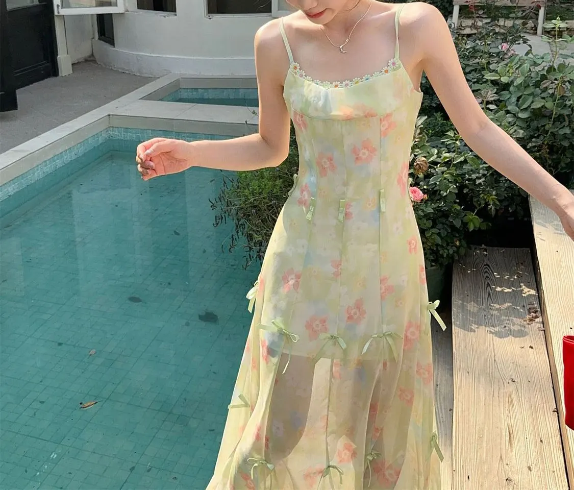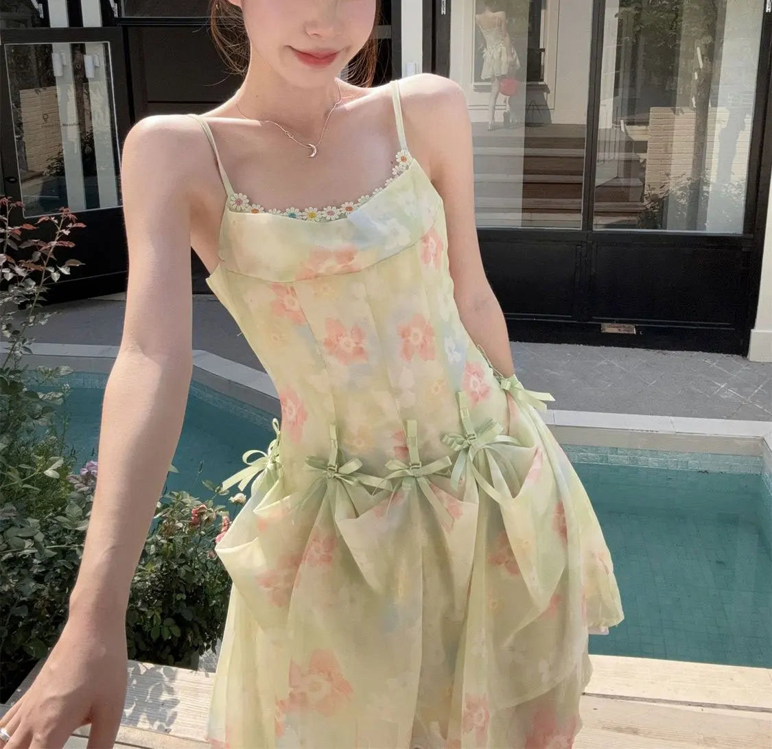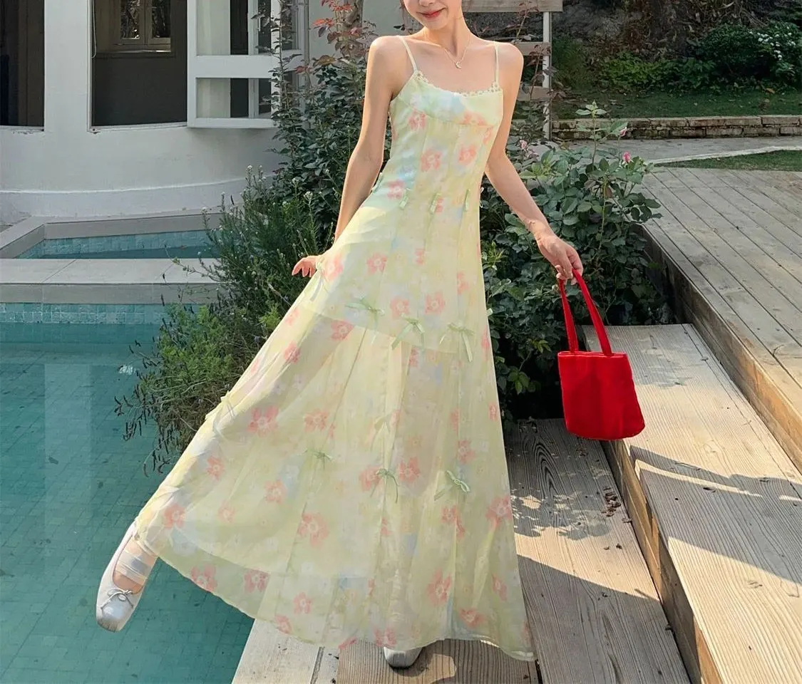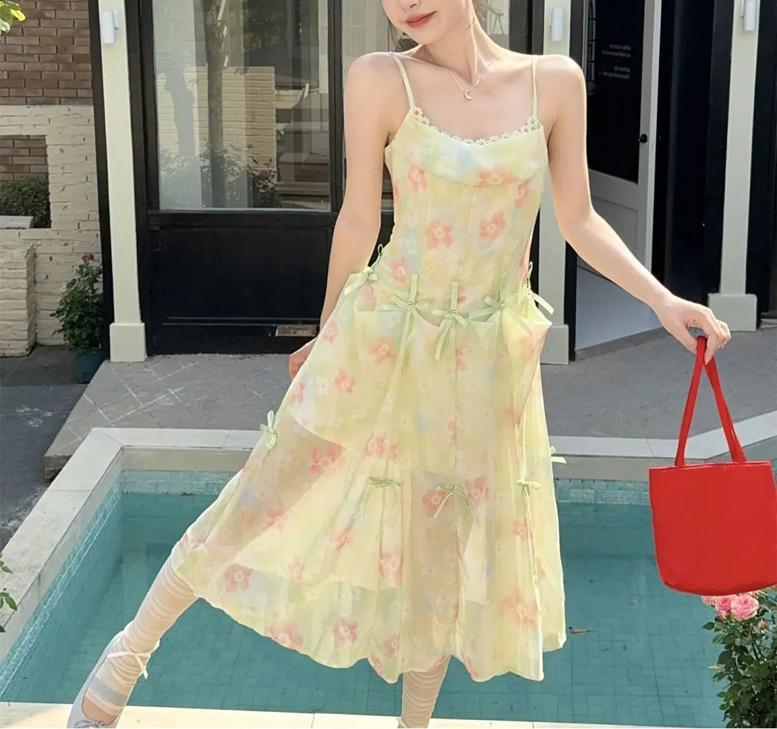Cyflymder Sweet Vacation Style Strap Long Dress Women's Clothing Broken Flowers Summer A-Line Fashion Bow Three Ways of Wearing Dresses