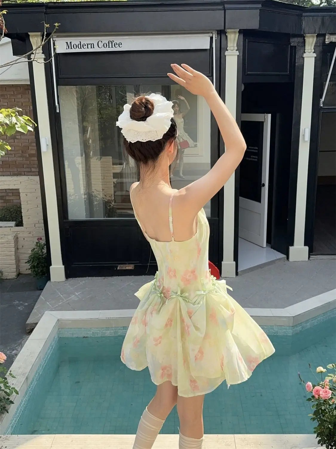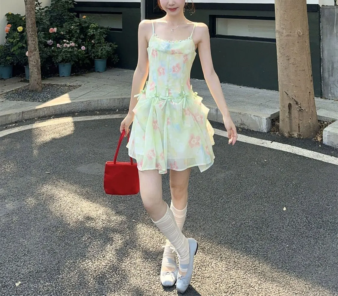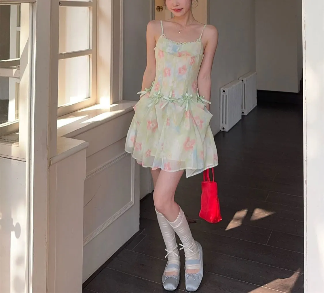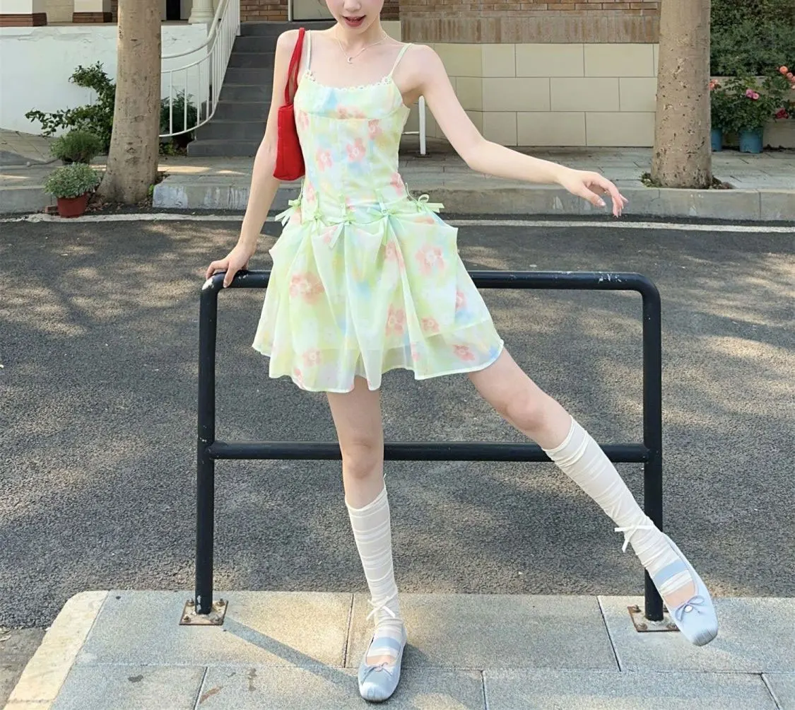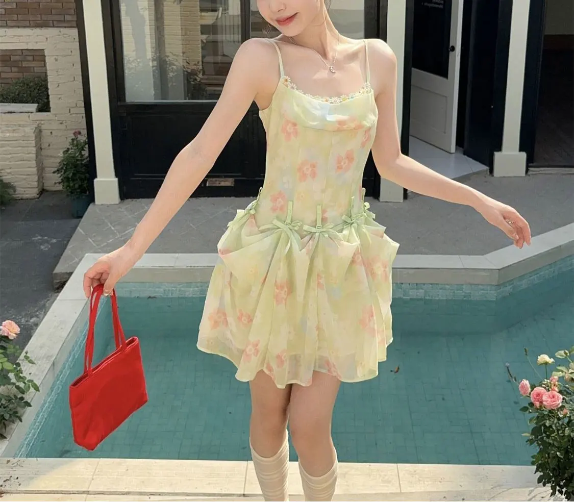 Cyflymder Sweet Vacation Style Strap Long Dress Women's Clothing Broken Flowers Summer A-Line Fashion Bow Three Ways of Wearing Dresses