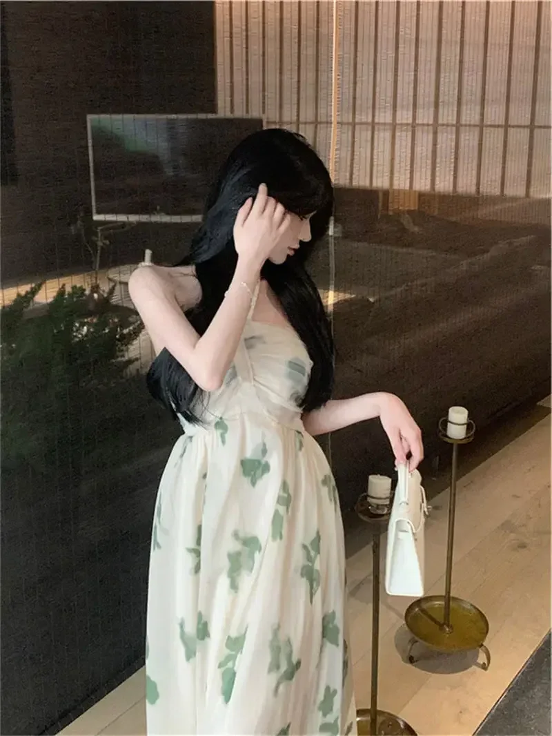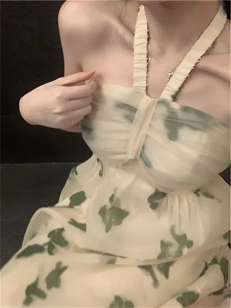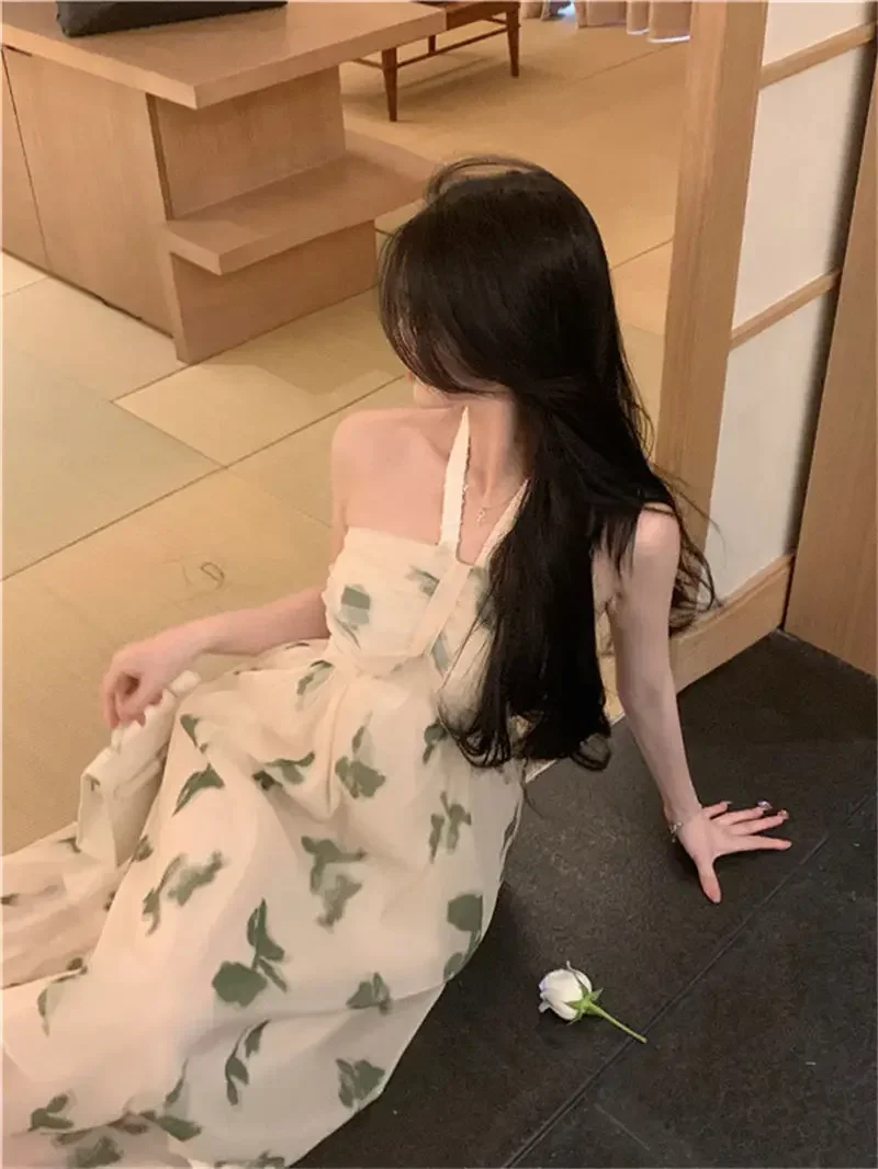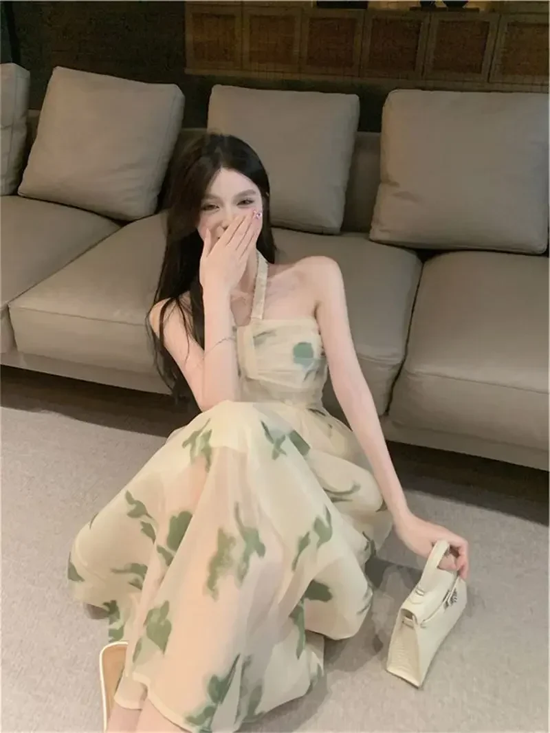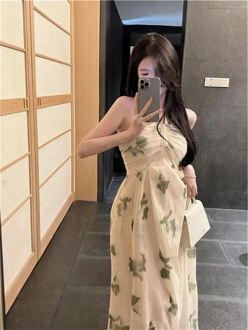Cyflymder Temperament Floral Neck Strapless Tulle Skirt Gentle Style Slim A-line Long Skirt