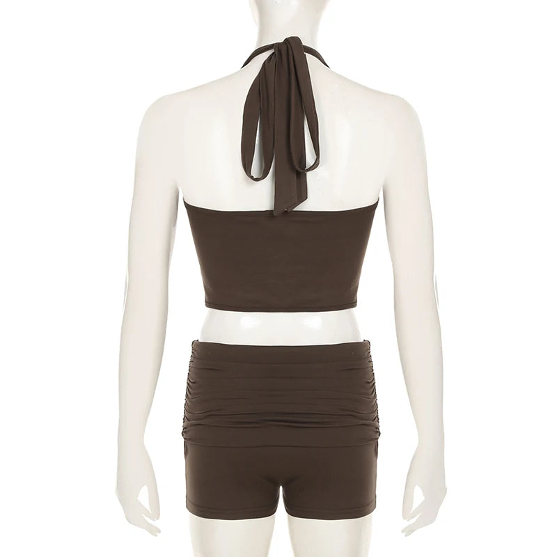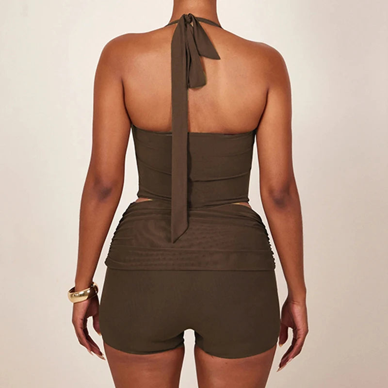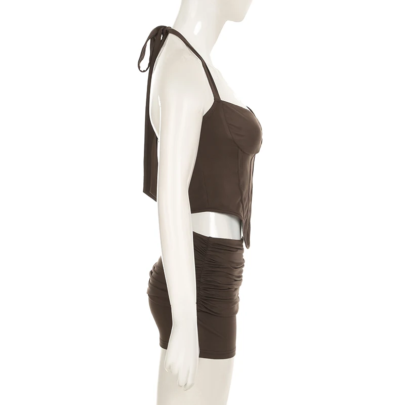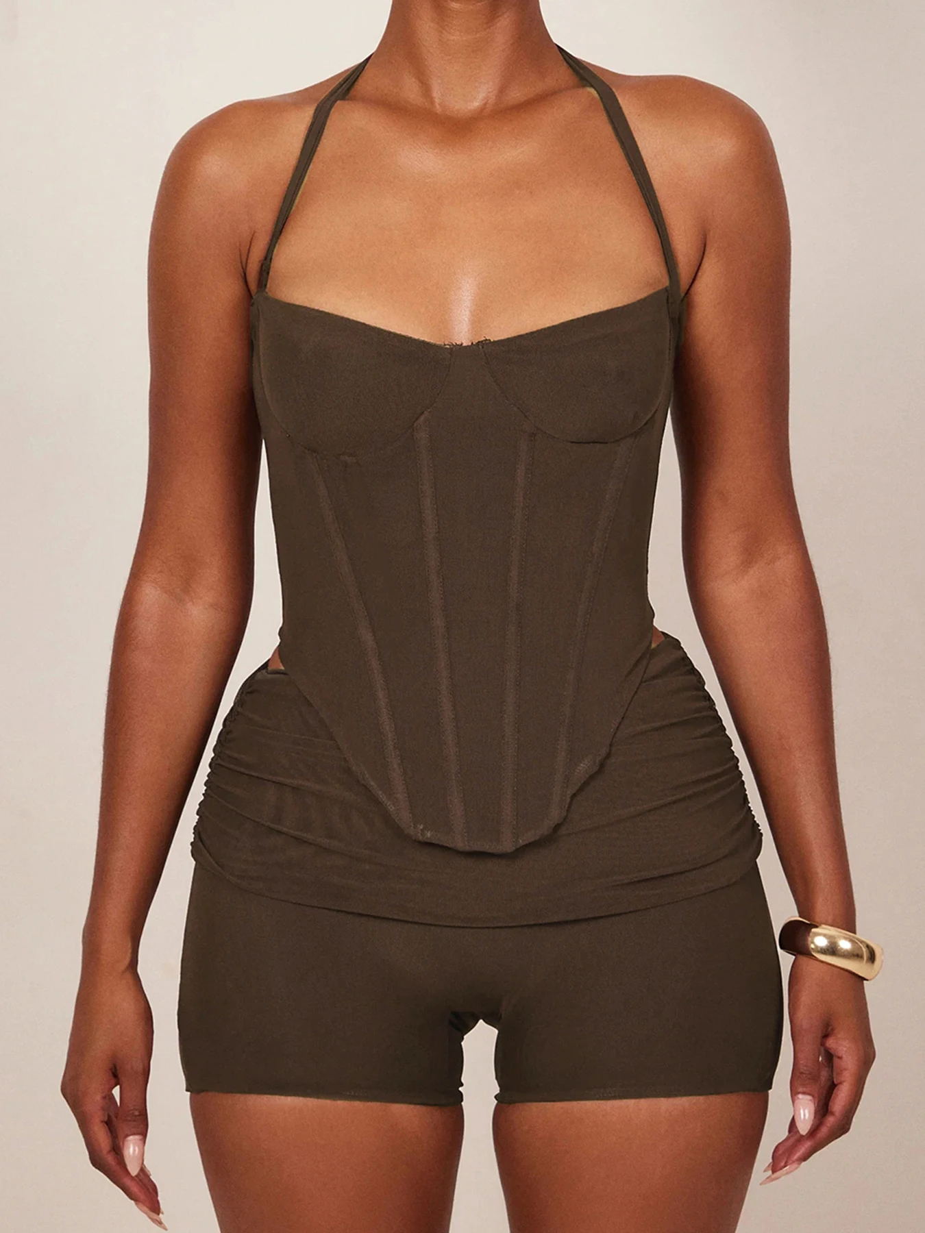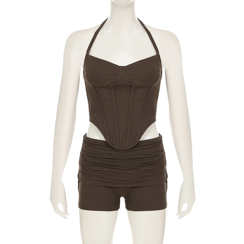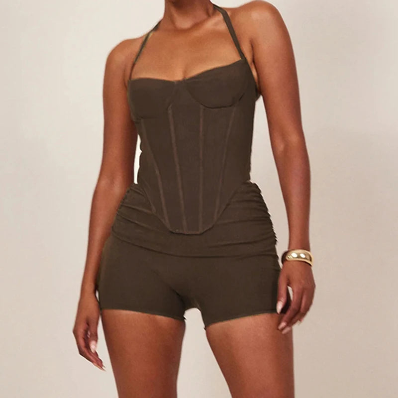Cyflymder Two Piece Set Lace Up Halter Backless Fishbone Corset Crop Top & Shorts Fashion Clubwear Women Streetwear Suit 2025 New
