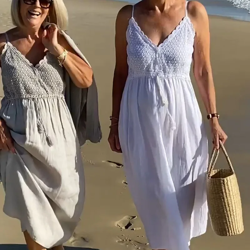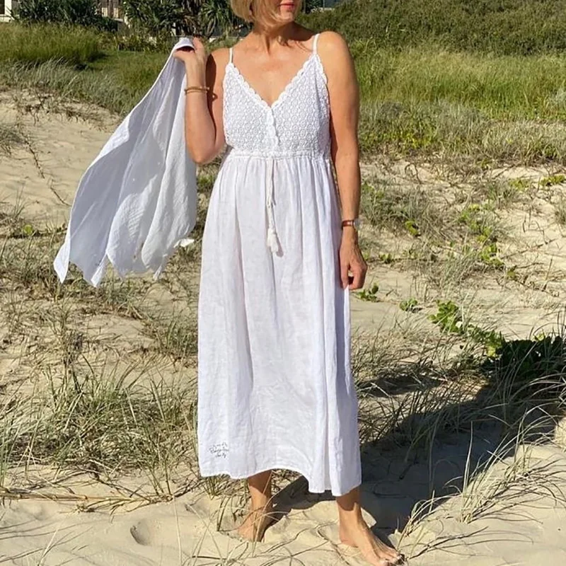 Cyflymder V-neck Lace Patchwork Holiday Dress Fashion Suspender Sleeveless Summer Bohemian Dress Elegant Women's Solid Pleated Beach Dress