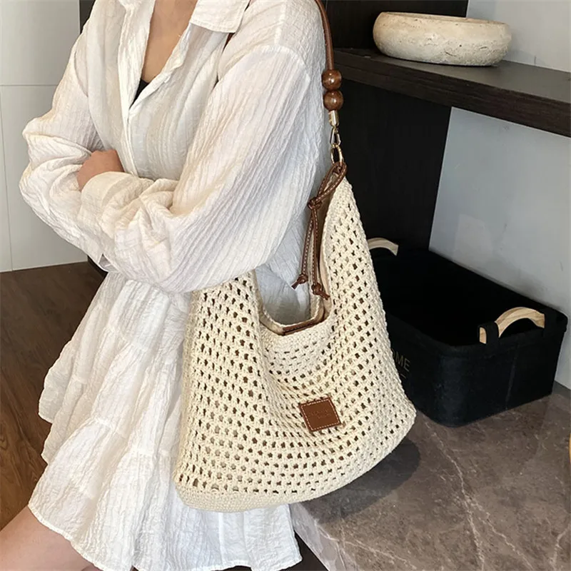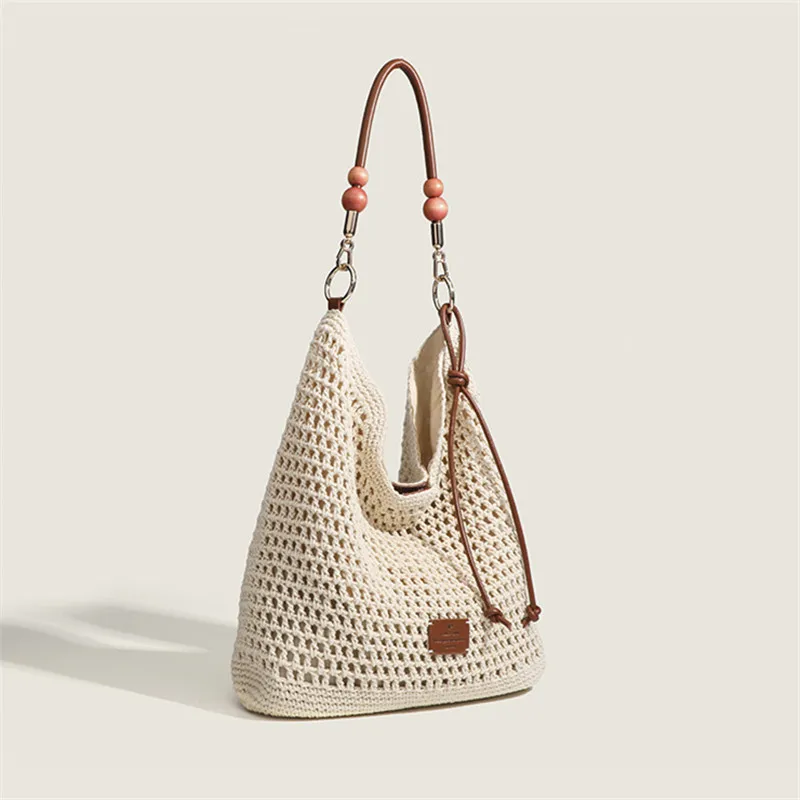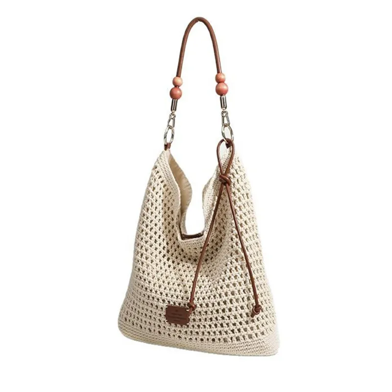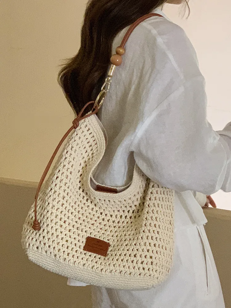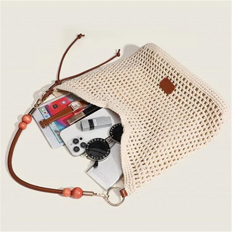 Cyflymder Vacation Woven Bag with Leather Round Shoulder Strap, Hollow Shoulder Bag, Summer Knitted Beach Bag for Women Work Travel Party