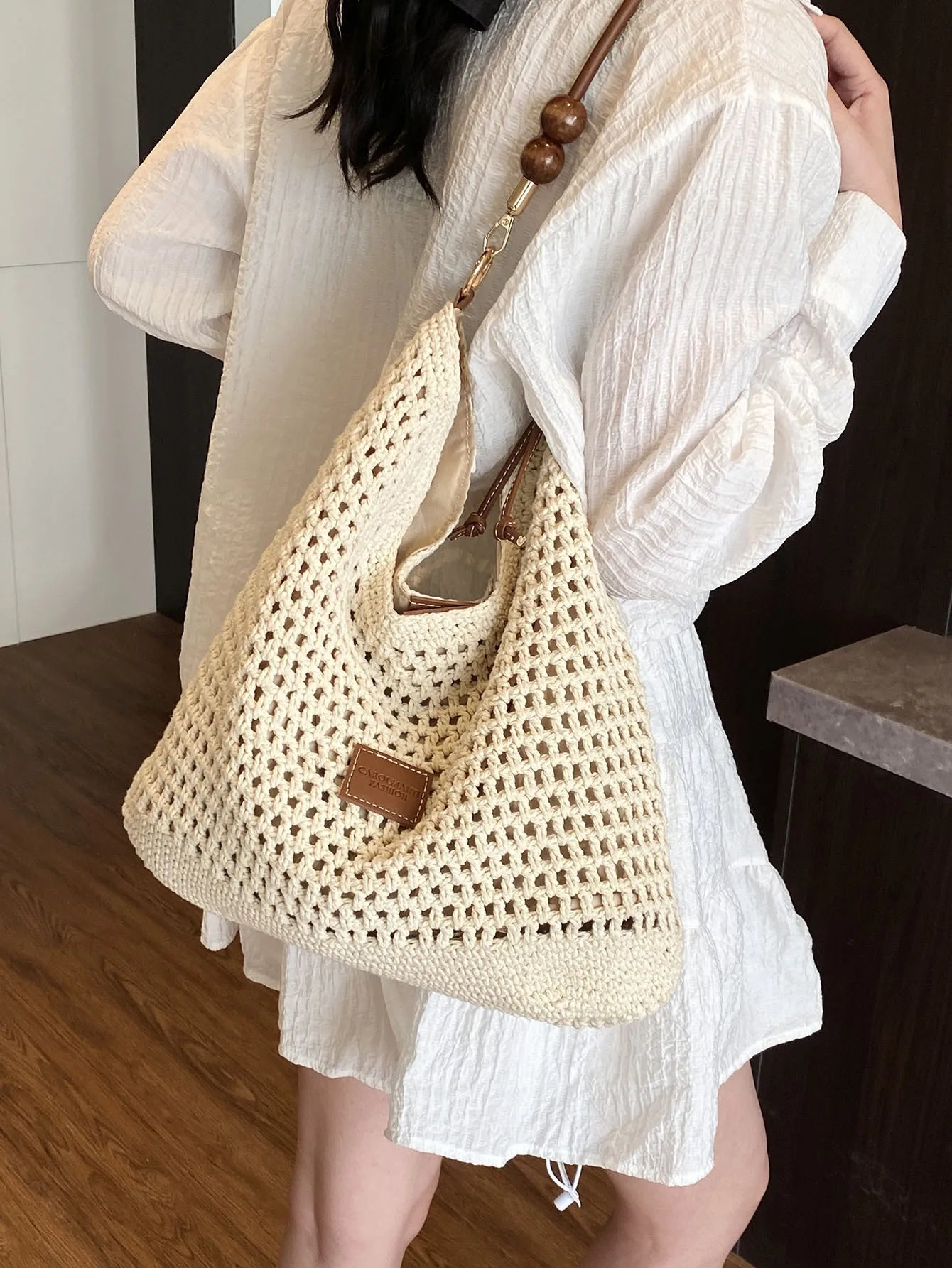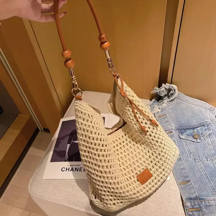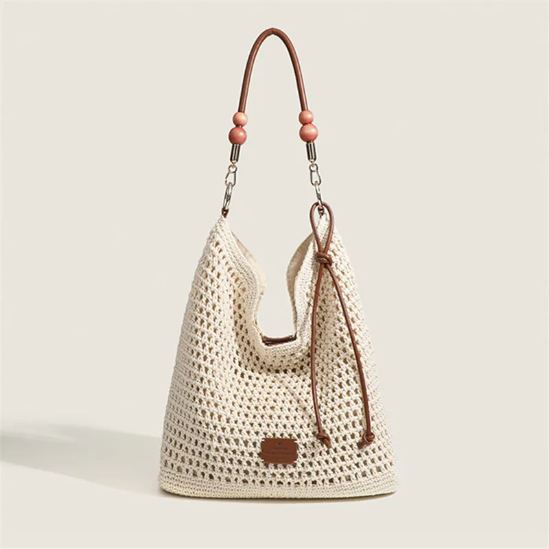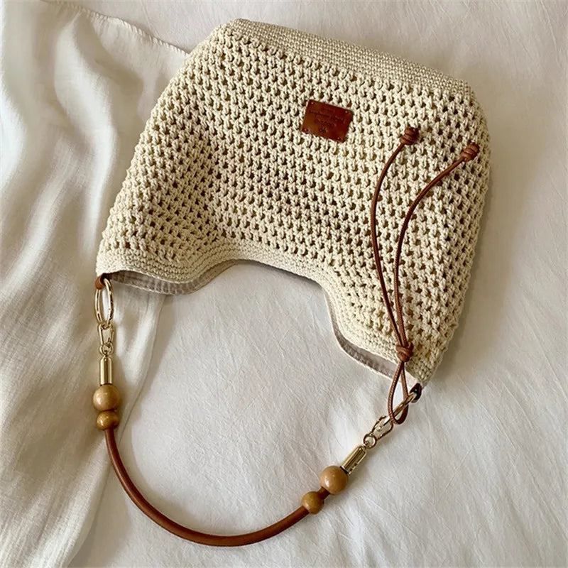 Cyflymder Vacation Woven Bag with Leather Round Shoulder Strap, Hollow Shoulder Bag, Summer Knitted Beach Bag for Women Work Travel Party
