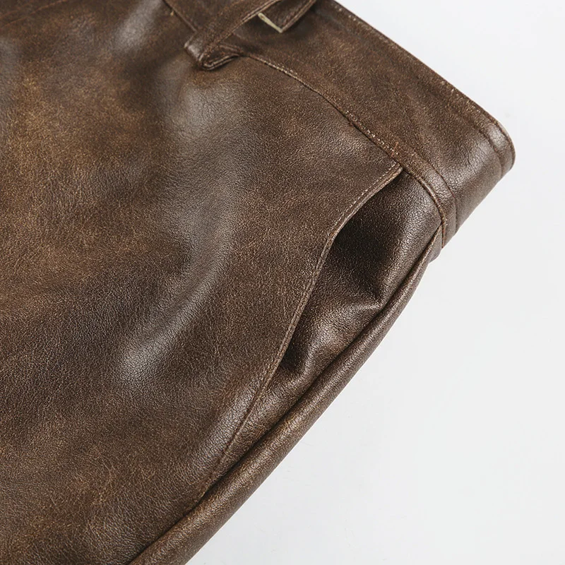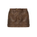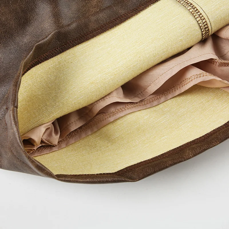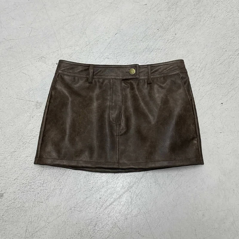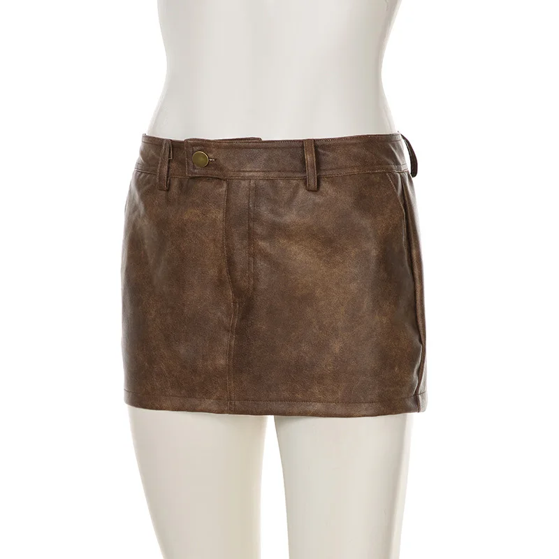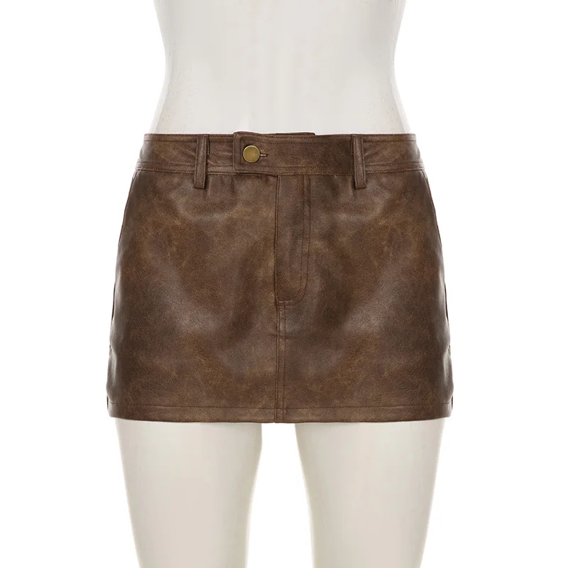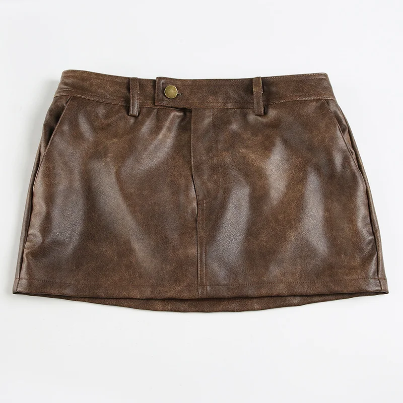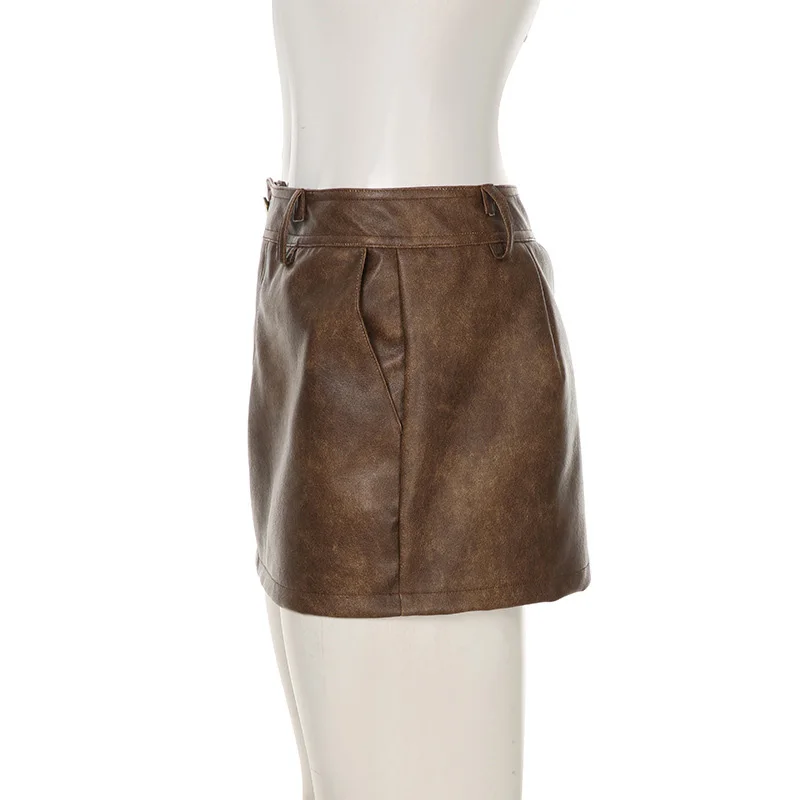 Cyflymder Vintage Brown PU Leather Mini Skirt Women Fashion High-waisted Slim Fit Button Up Pocket Patchwork Wrapped Hip Lined Skirts
