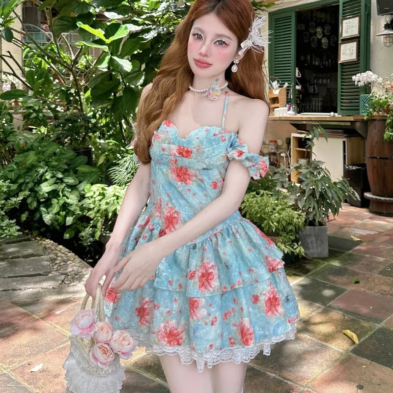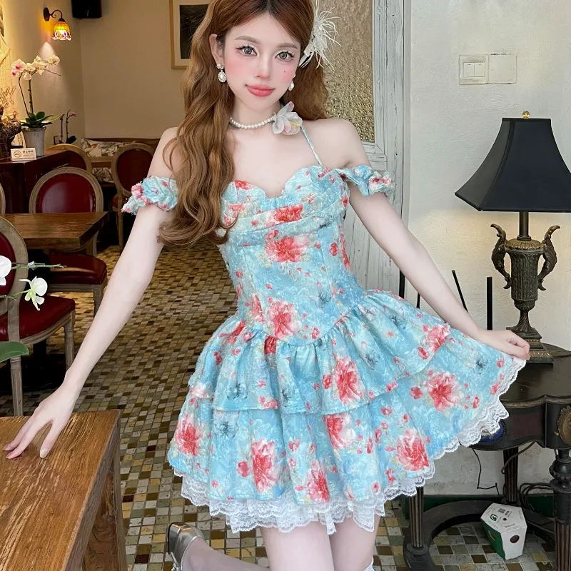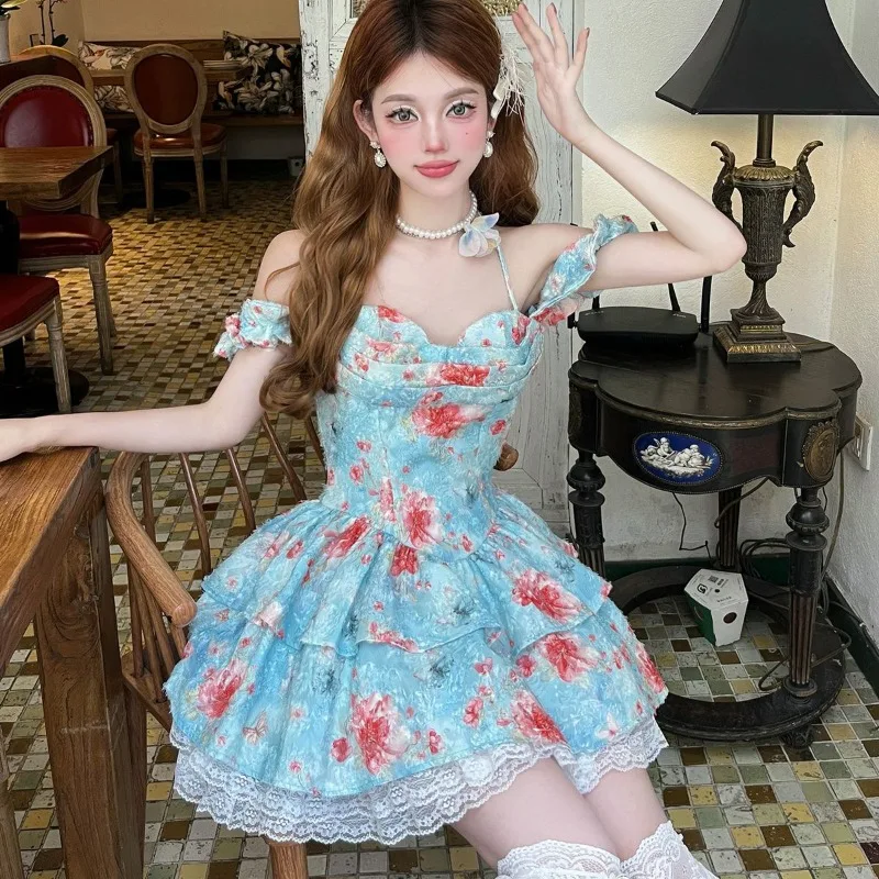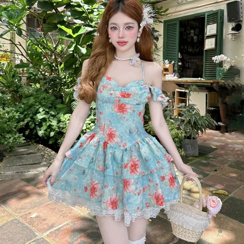 Cyflymder Vintage Dresses Women Sweet Blooming Floral Oil Painting Lace Patchwork Puff Sleeve Backless Ball Gown Mini Dress