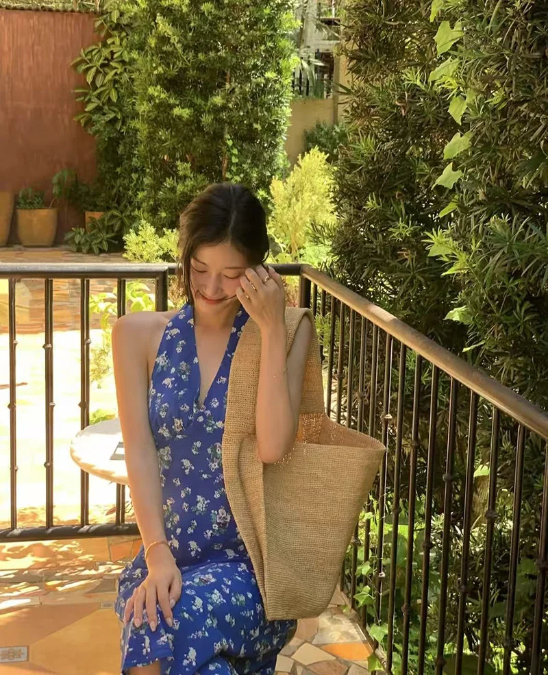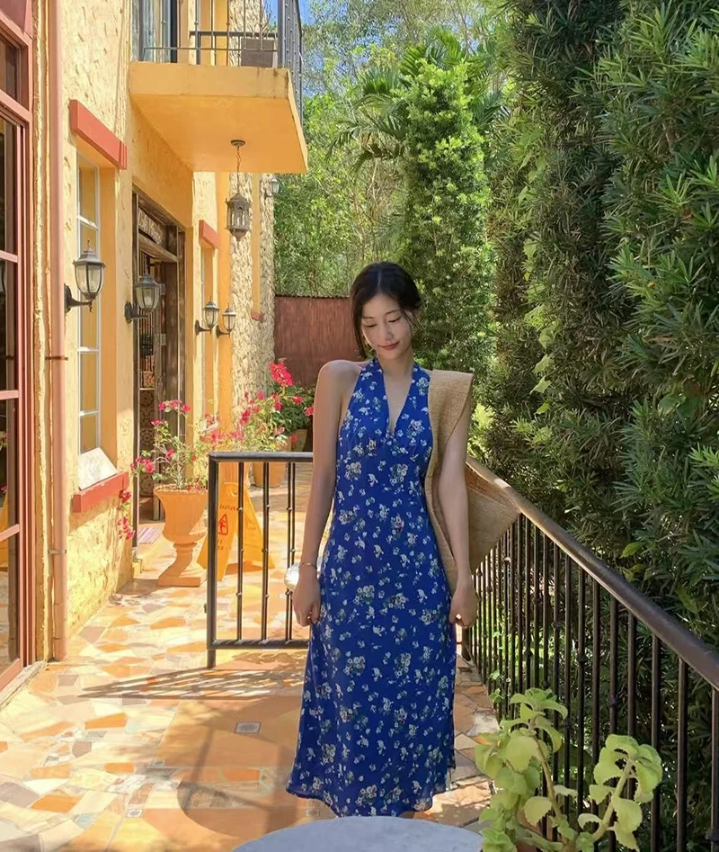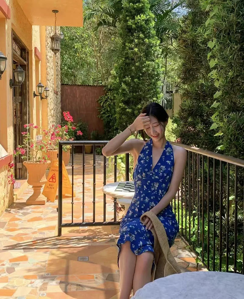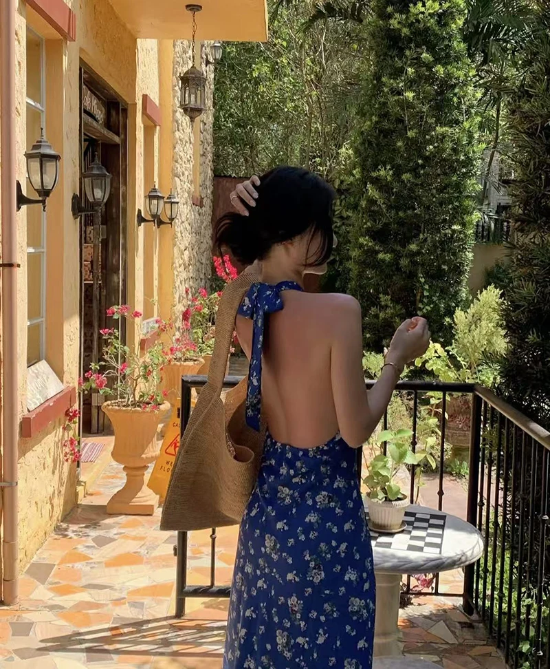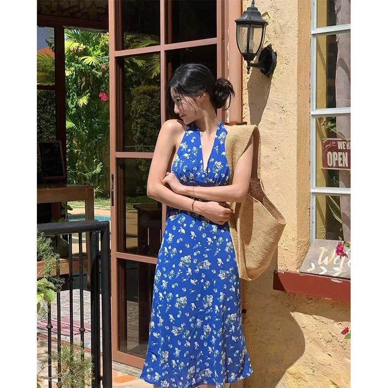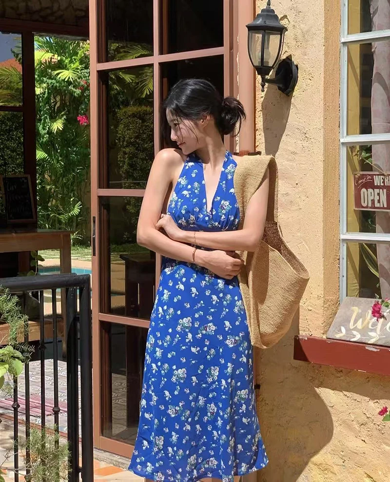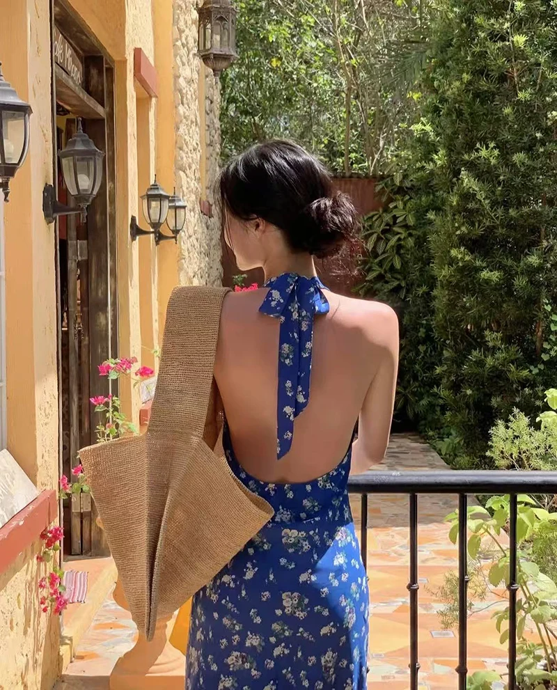 Cyflymder Vintage Floral Midi Dress Women Boho Vacation Beach Sexy Backless Bandage Dresses Summer Elegant Korean V Neck Bodycon Vestidos
