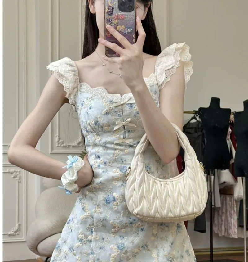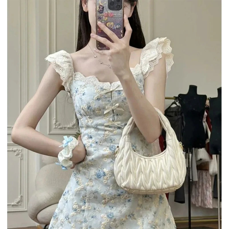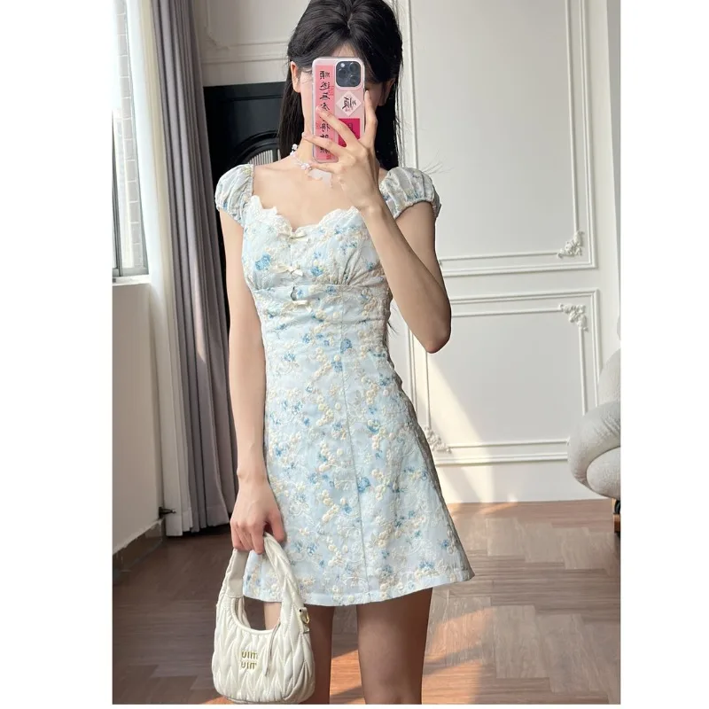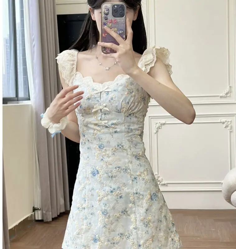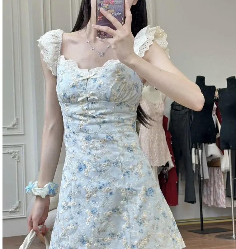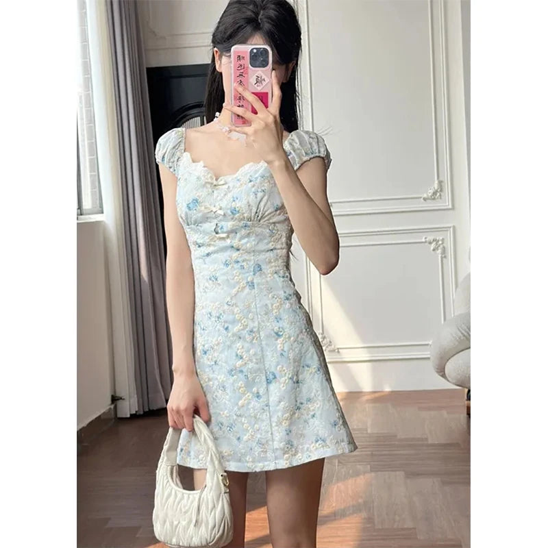 Cyflymder Vintage Floral Mini Dress Women Party Elegant Bow Lace Dresses Summer Korean Flying Sleeve Square Collar Bodycon Design Vestidos