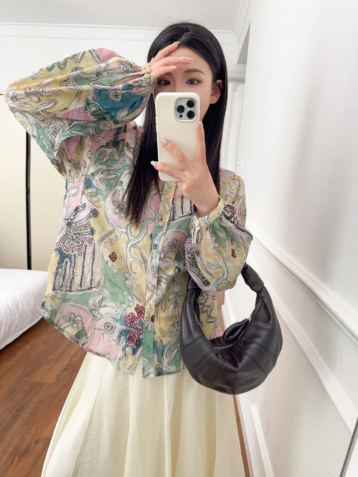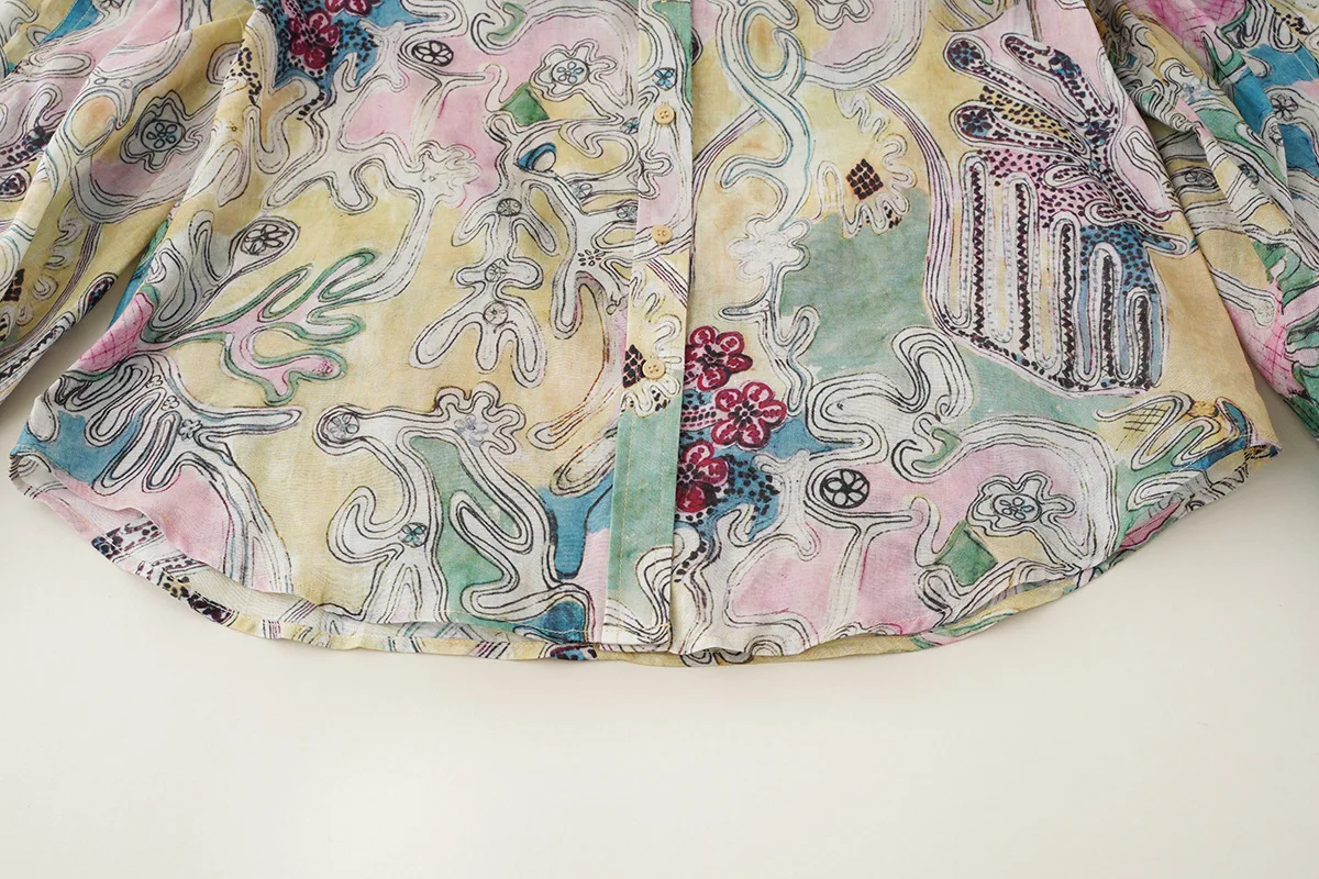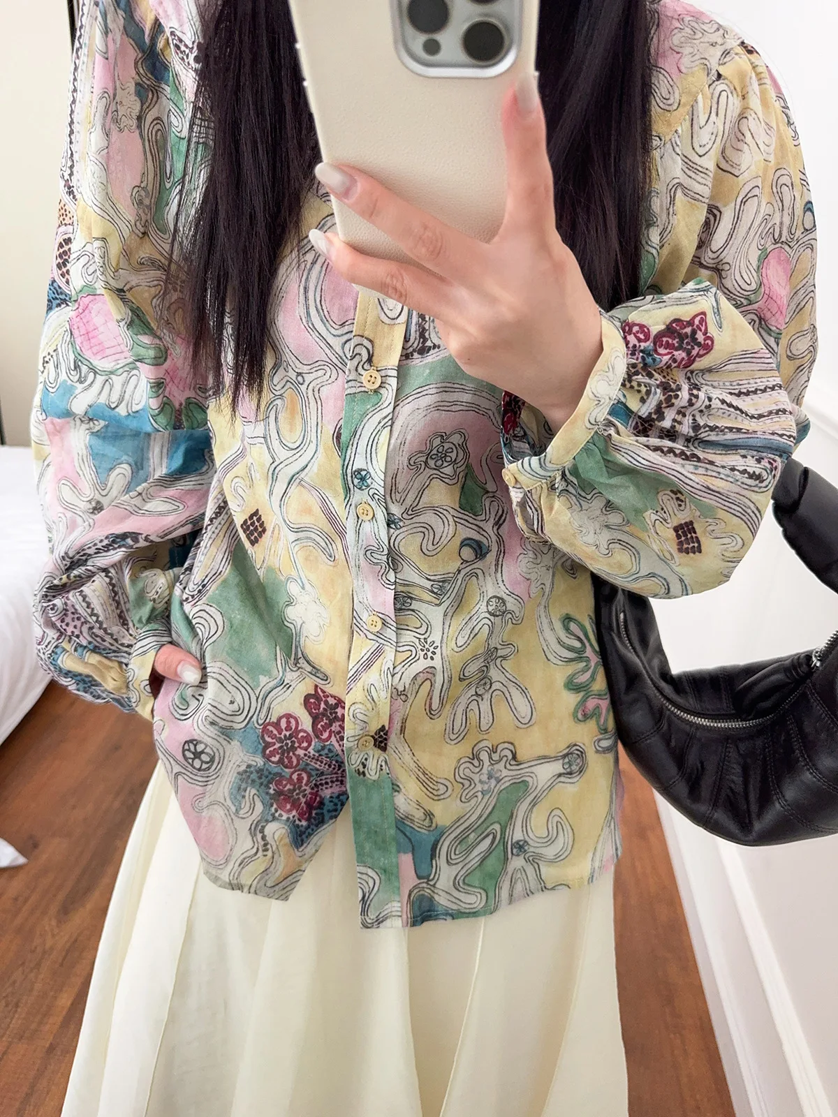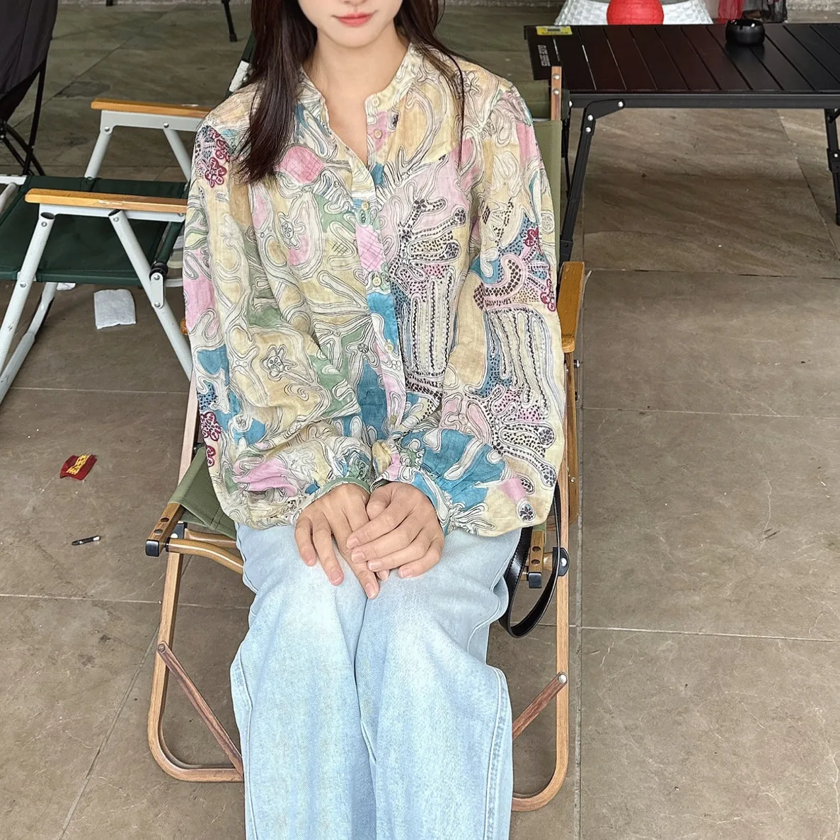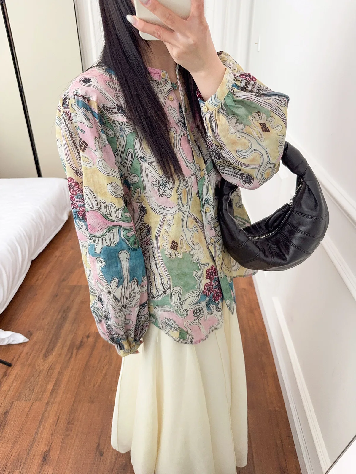 Cyflymder Vintage French Style Floral Shirt Blouse Painted Long Sleeves O-neck Bohemian Vocation Casual Ladies Women Shirt Tops
