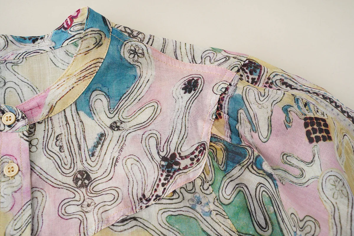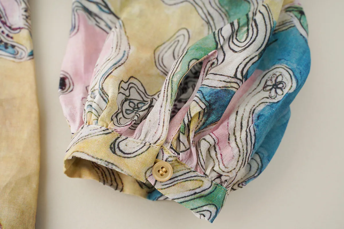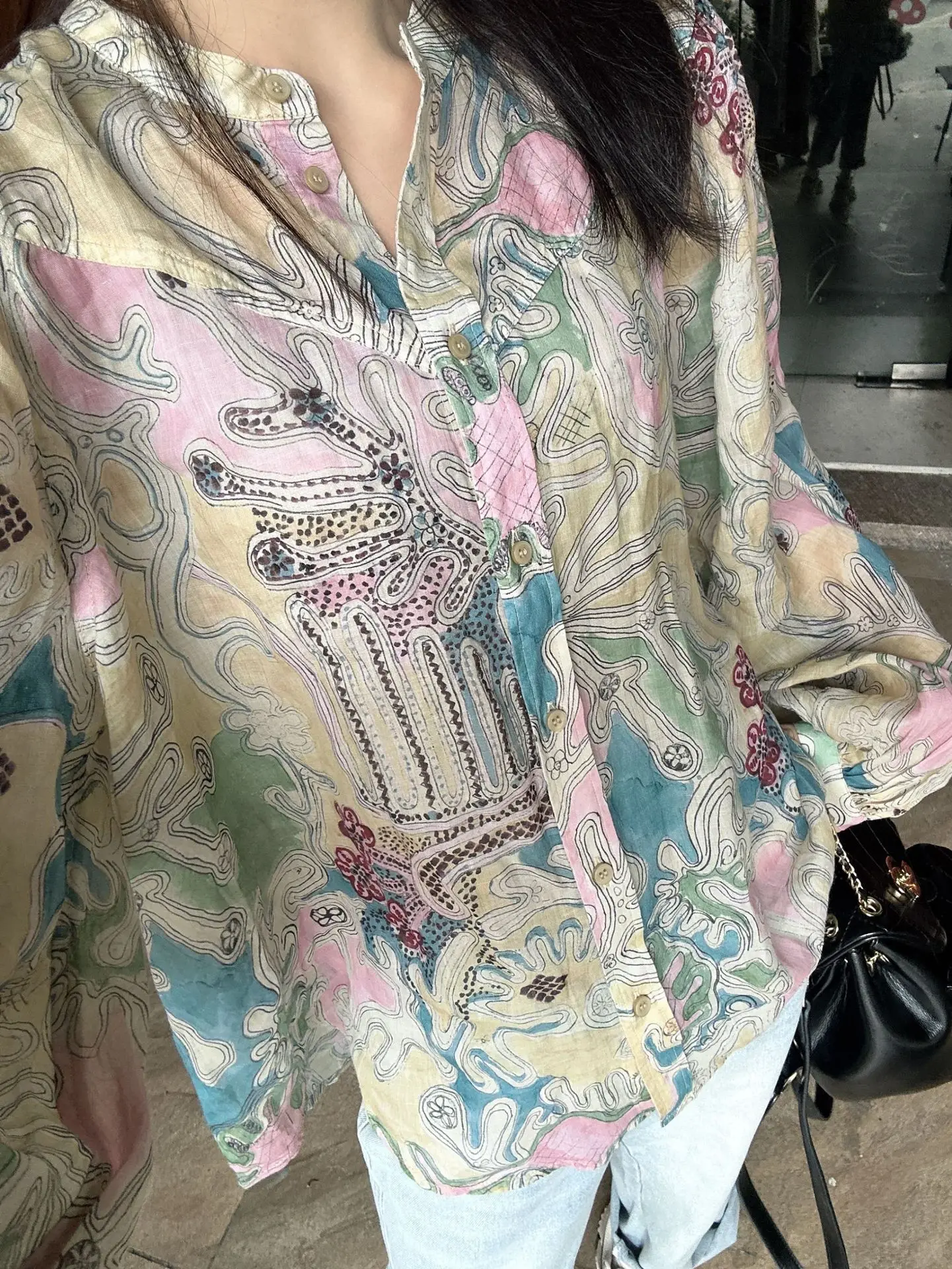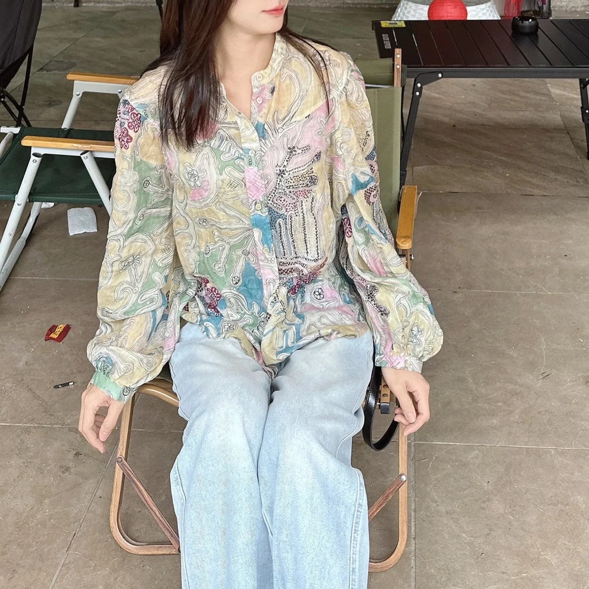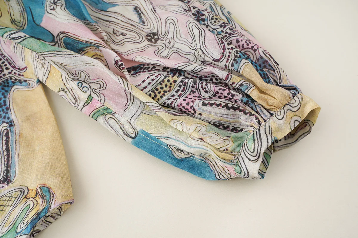 Cyflymder Vintage French Style Floral Shirt Blouse Painted Long Sleeves O-neck Bohemian Vocation Casual Ladies Women Shirt Tops