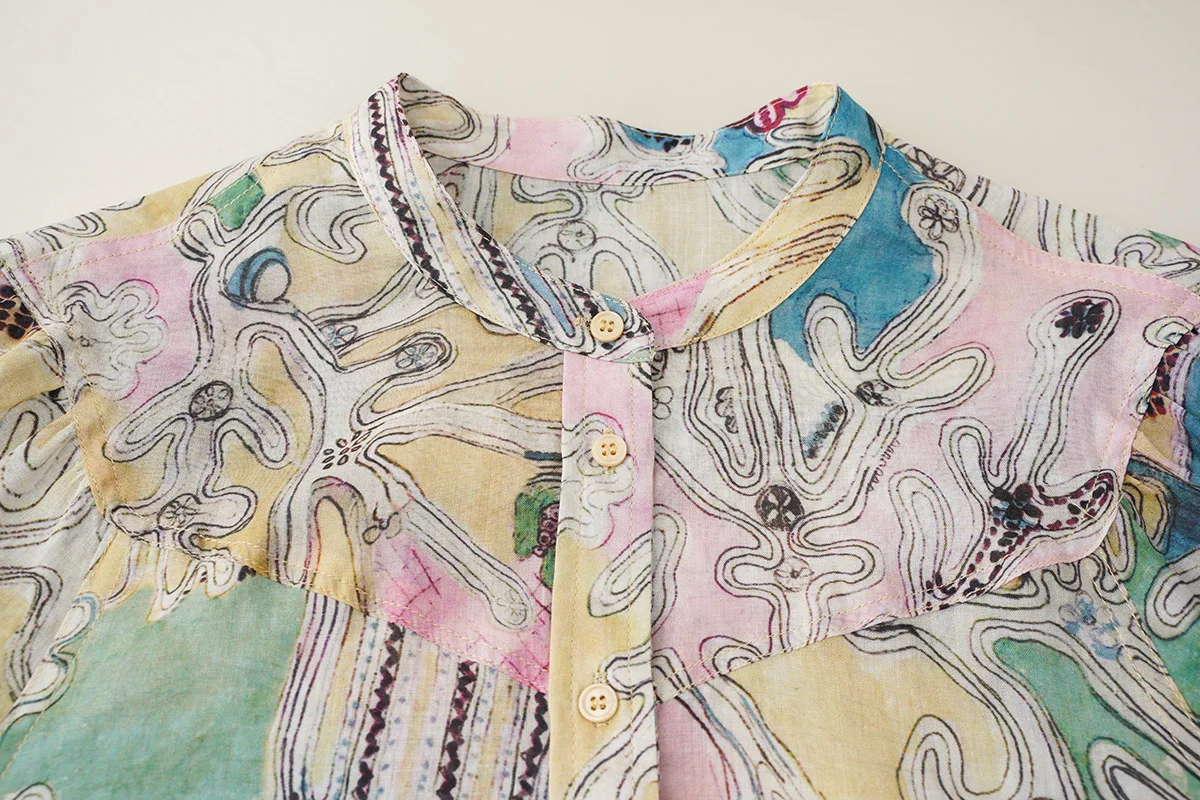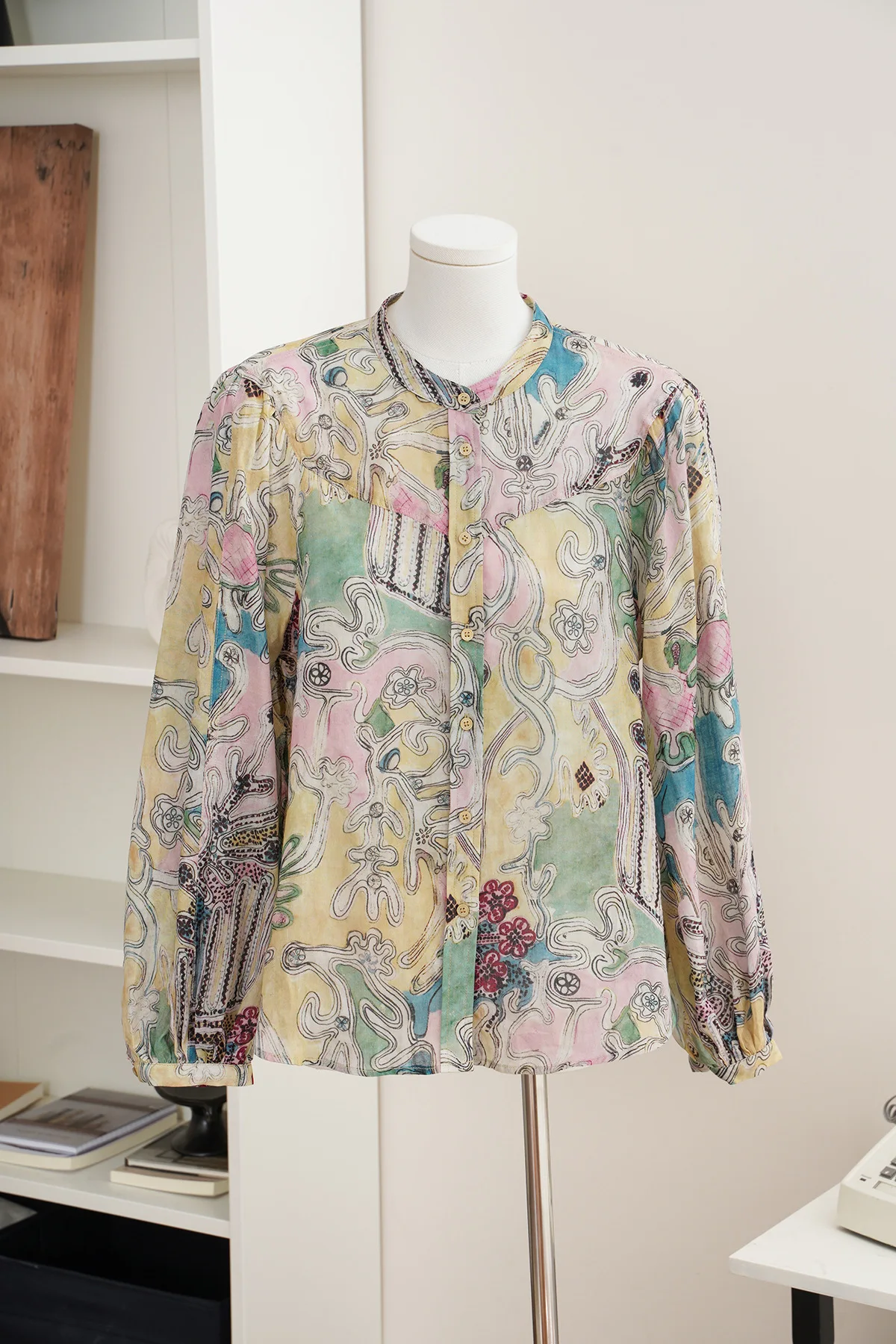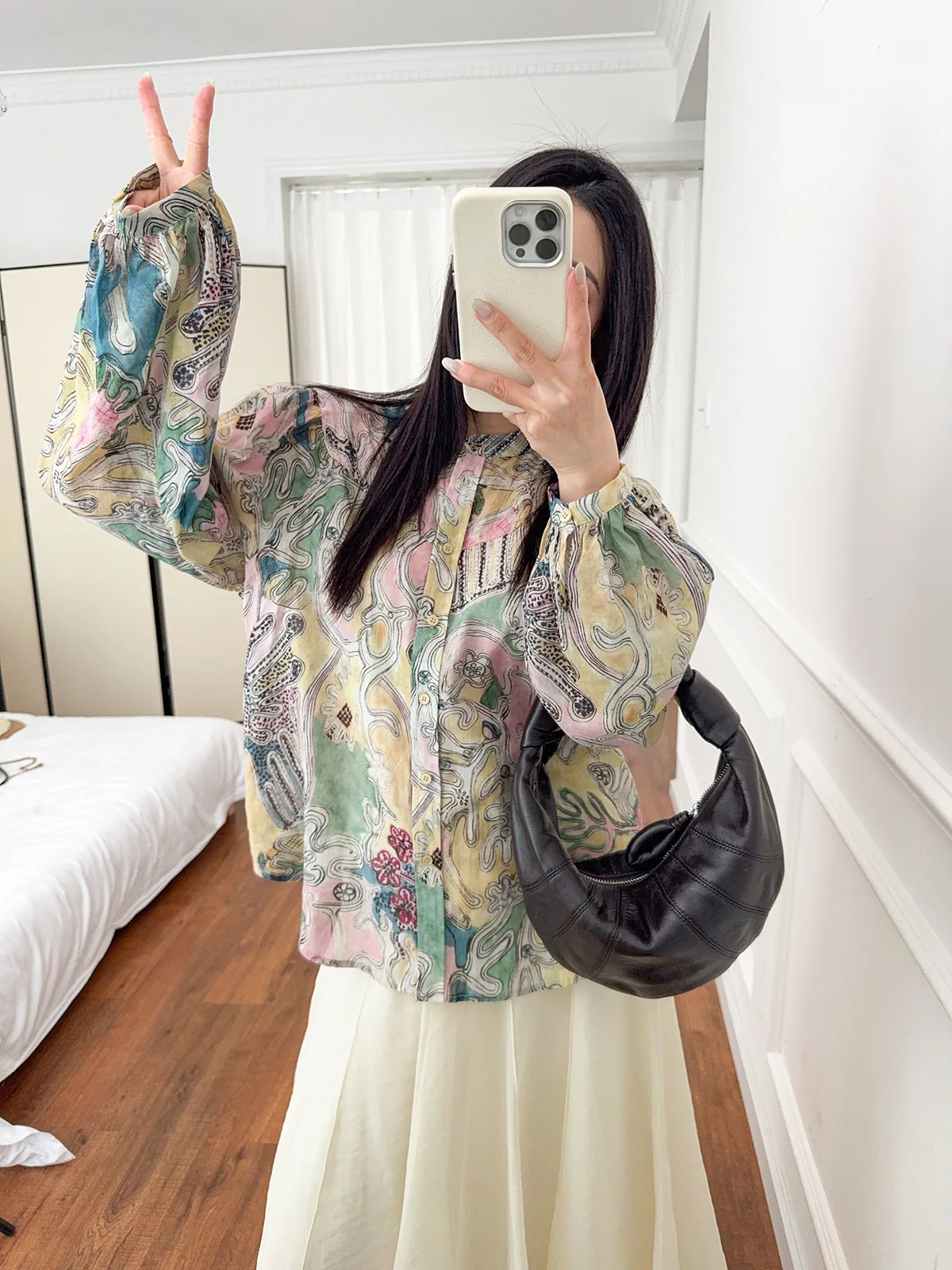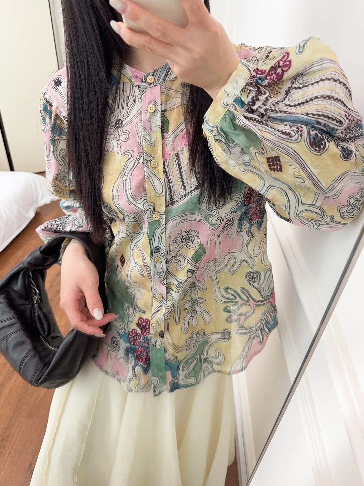 Cyflymder Vintage French Style Floral Shirt Blouse Painted Long Sleeves O-neck Bohemian Vocation Casual Ladies Women Shirt Tops