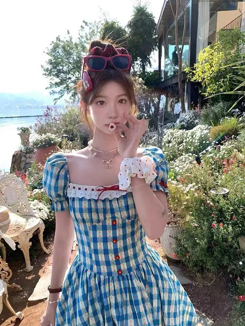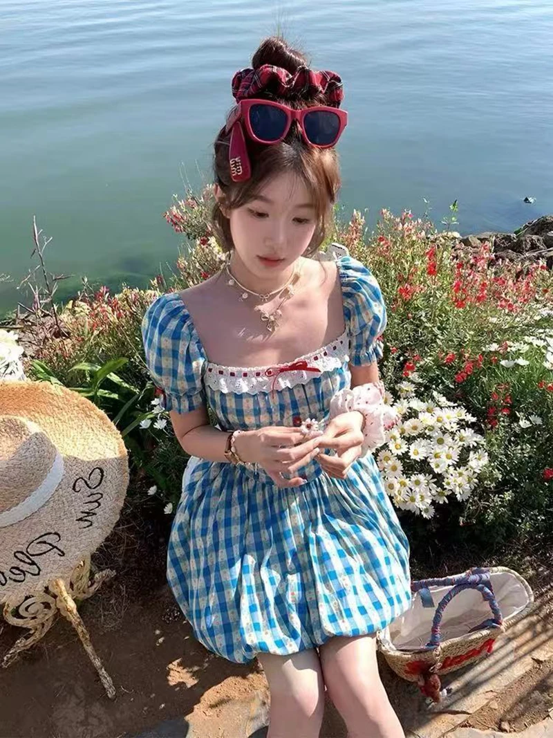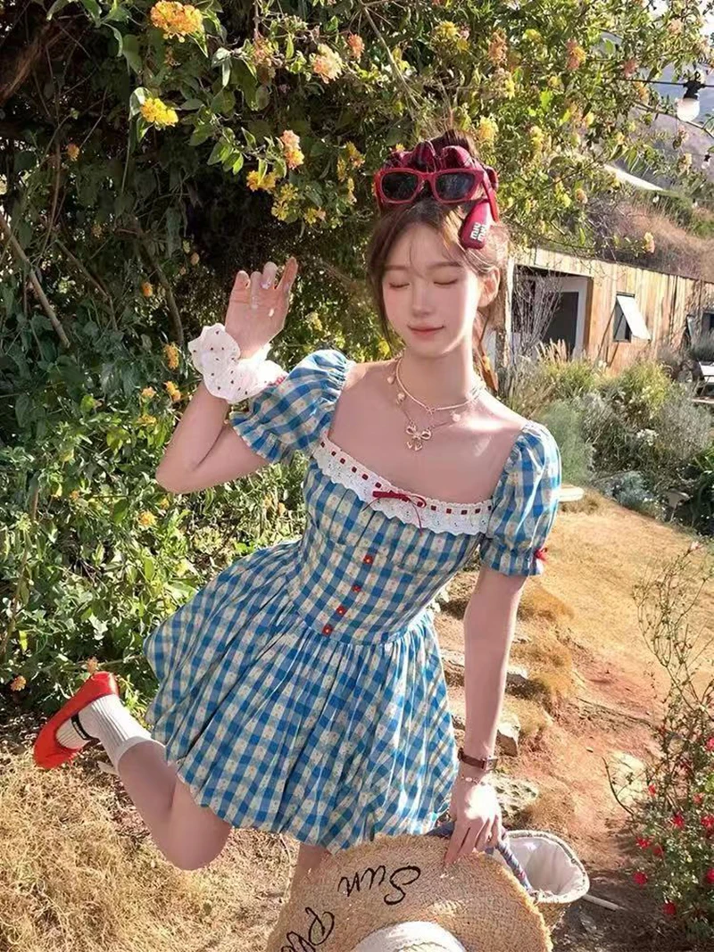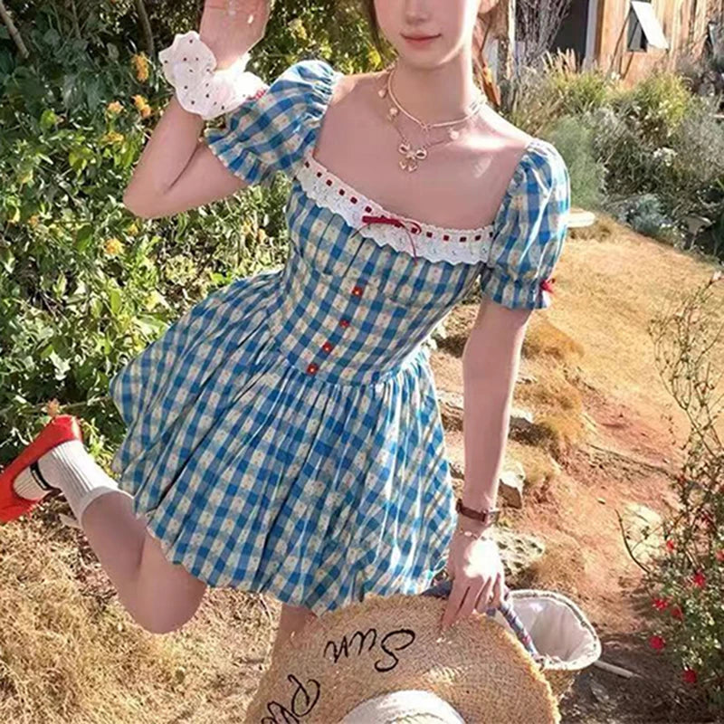 Cyflymder Vintage Plaid Mini Dress Women Japanese Kawaii Bow Lace Dresses Summer Korean Square Collar Puff Short Sleeve Bodycon Vestidos