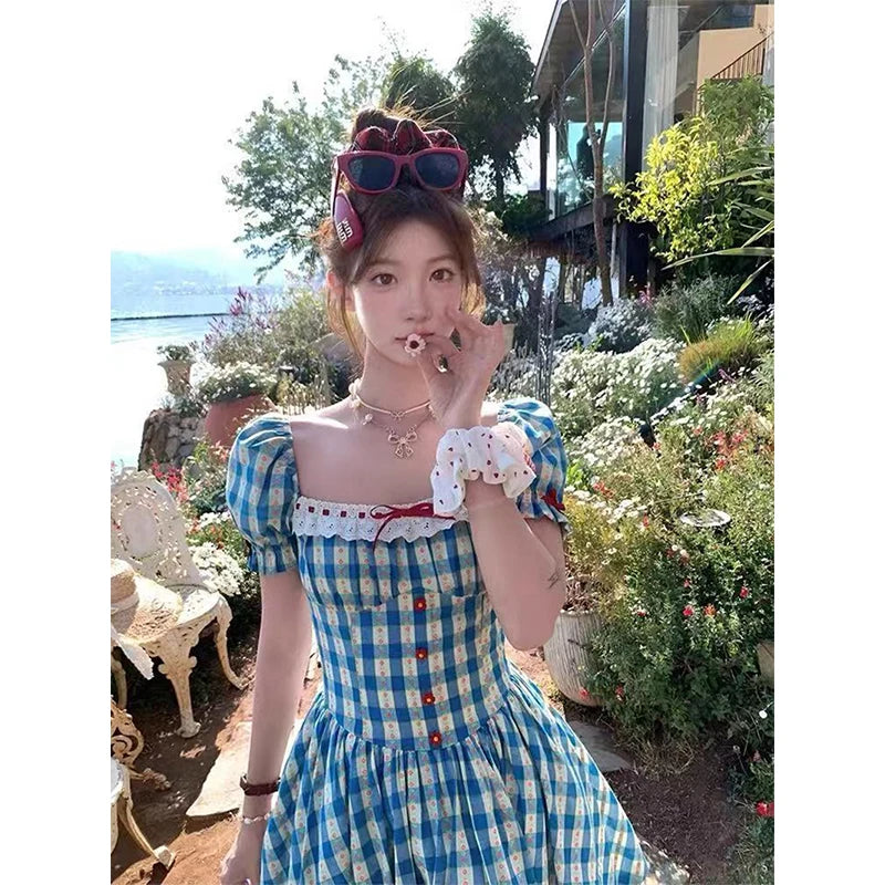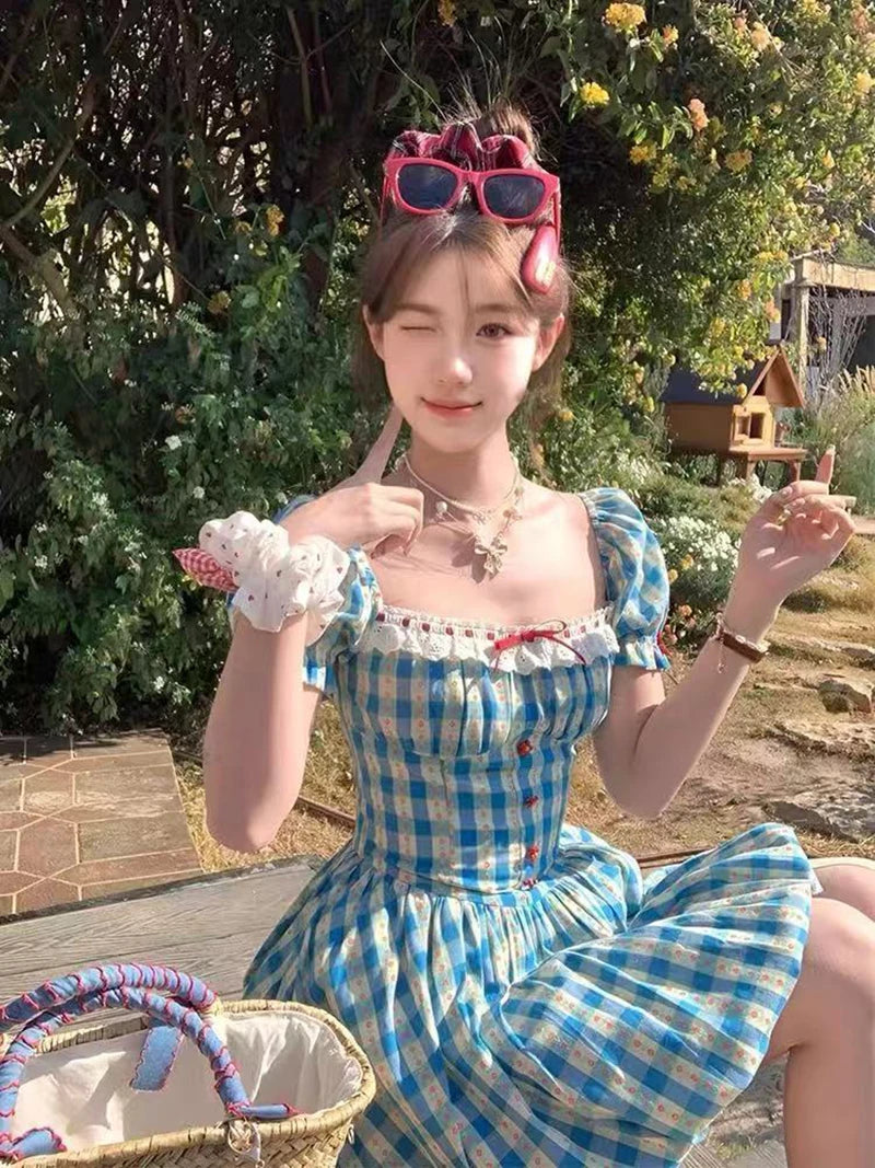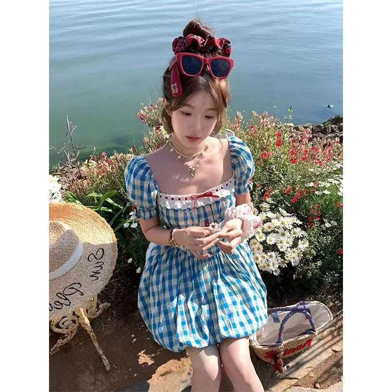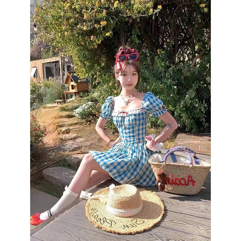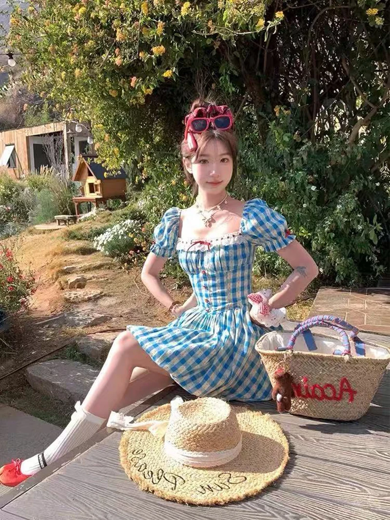 Cyflymder Vintage Plaid Mini Dress Women Japanese Kawaii Bow Lace Dresses Summer Korean Square Collar Puff Short Sleeve Bodycon Vestidos