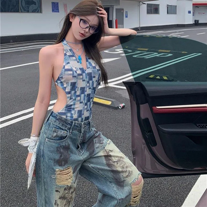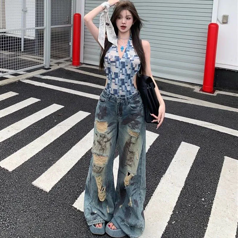 Cyflymder Vintage Y2K Ripped Jeans for Women American Streetwear Baggy Grunge Wide Leg Trousers Female Hot-Girl High Waisted Denim Pants