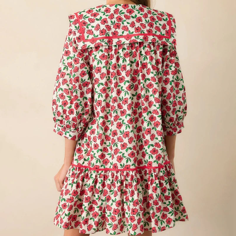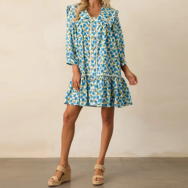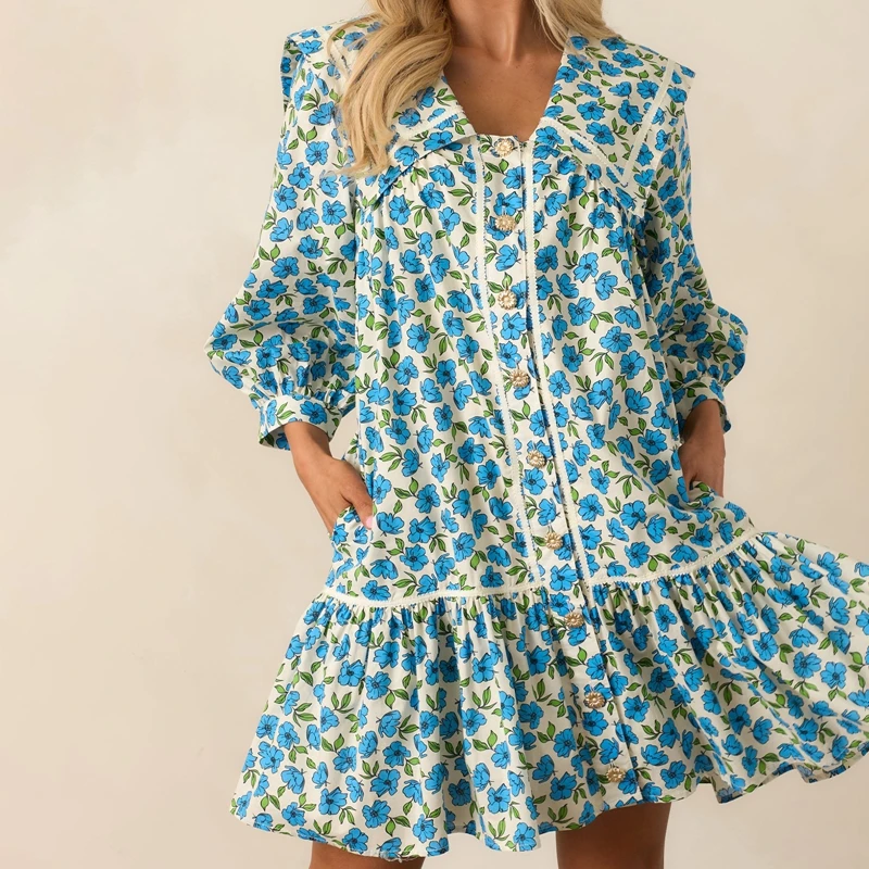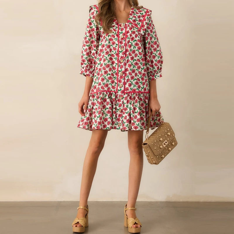 Cyflymder Women Boho Floral A-line Short Dress Vintage Puff Sleeve Flowy Babydoll Dress Smocked Shirt Dresses Bohemian Mini Sundress