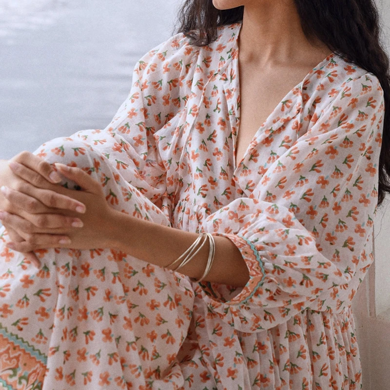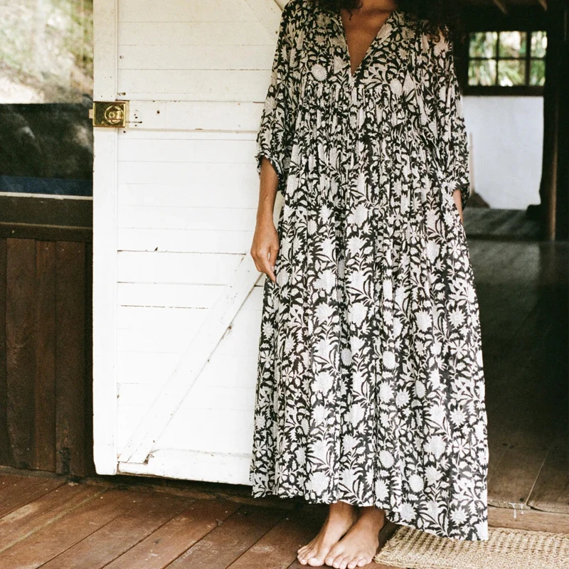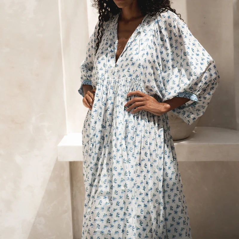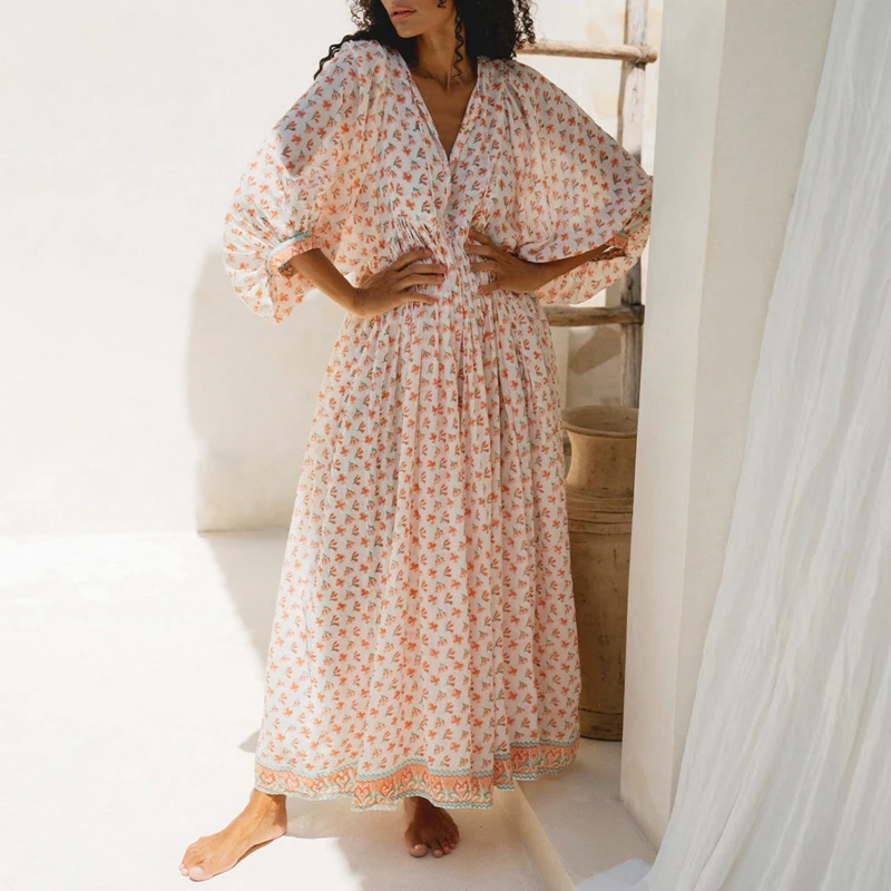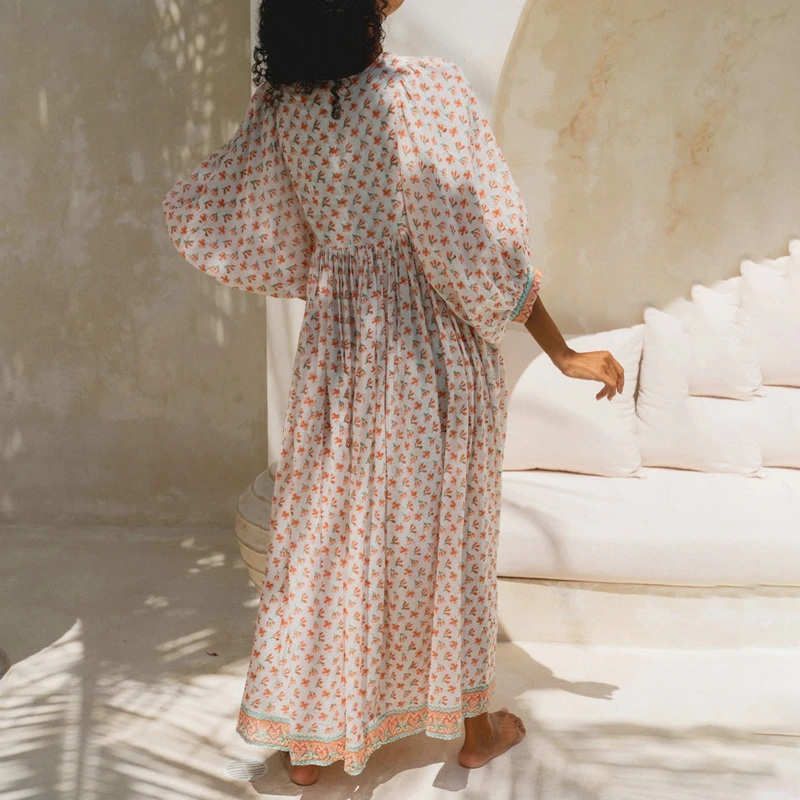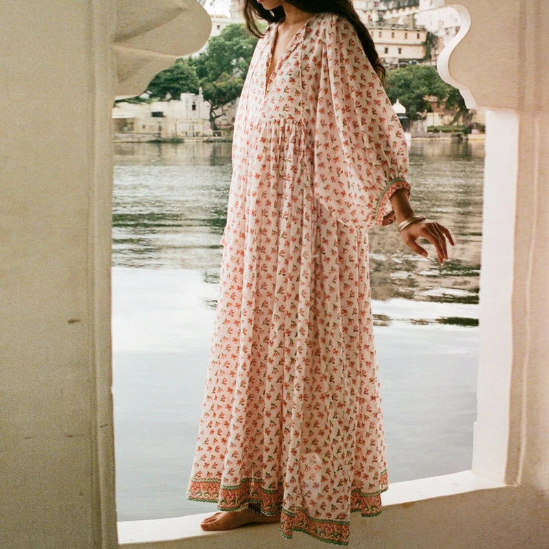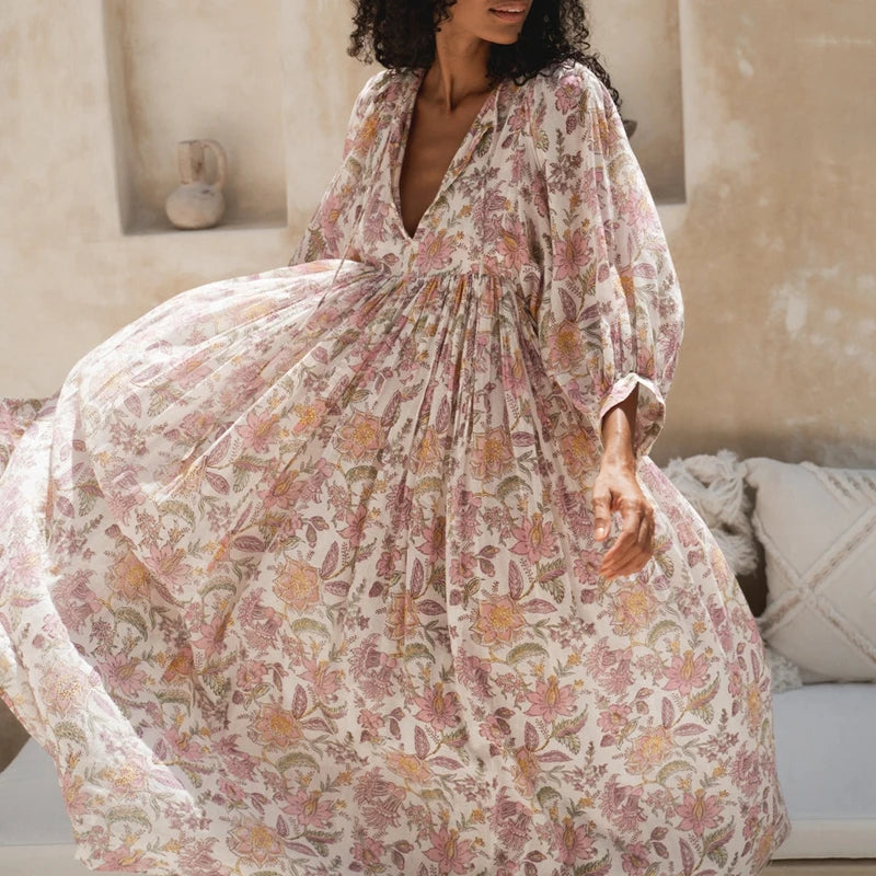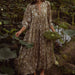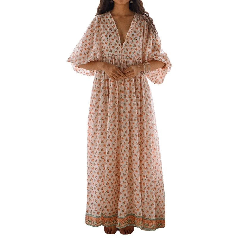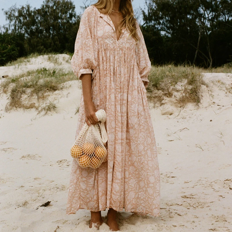 Cyflymder Women Boho Floral Maxi Dress Ladies Fashion Puff Sleeve Flowy Long Dress V Neck Loose Fit Shirt Dress Bohemian Tiered Sundress