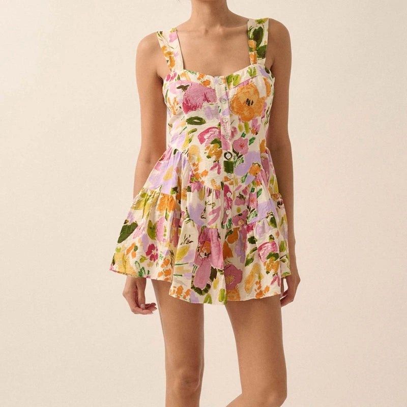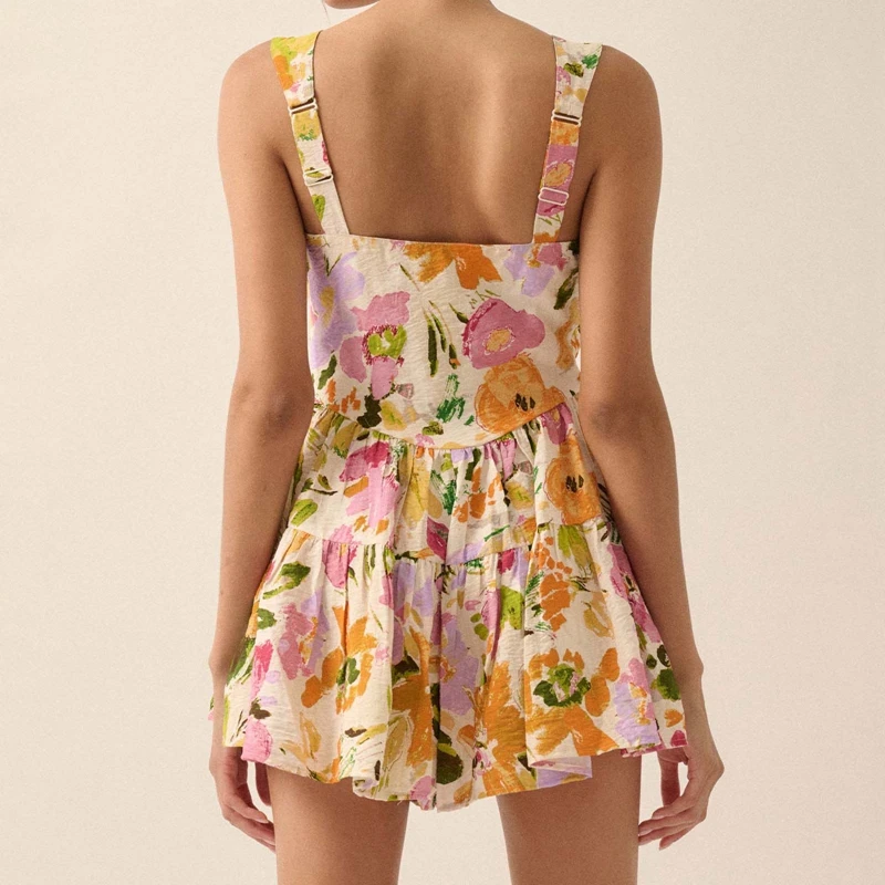 Cyflymder Women Boho Floral Mini Cami Dress Spaghetti Strap Flowy Short Sling Dress Summer Sleeveless Low Cut Holiday A-line Sundress