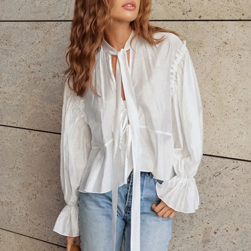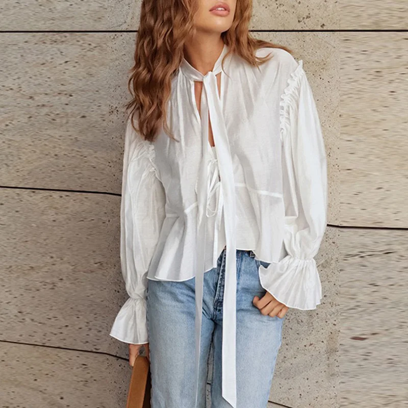 Cyflymder Women Casual High Street Solid Color Commuting Top Simple Lace Up Ruffle Design Tees 2025 New Autumn Puff Sleeve Loose Pullover
