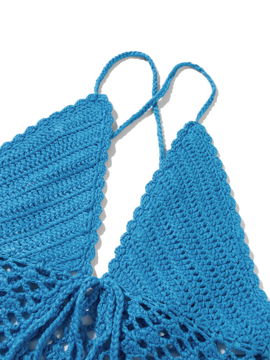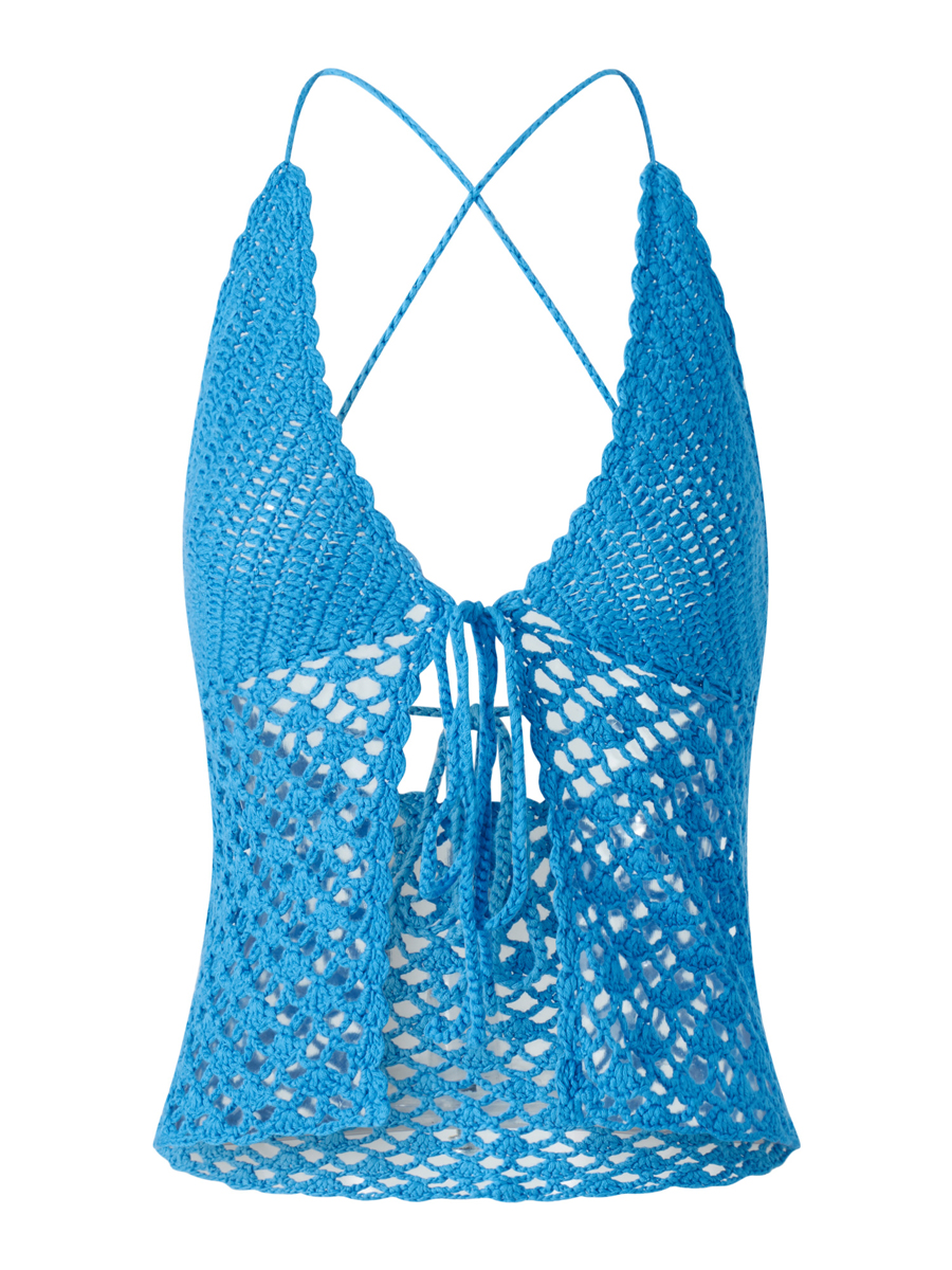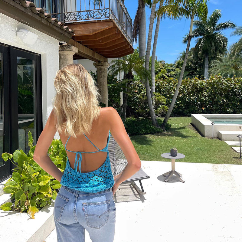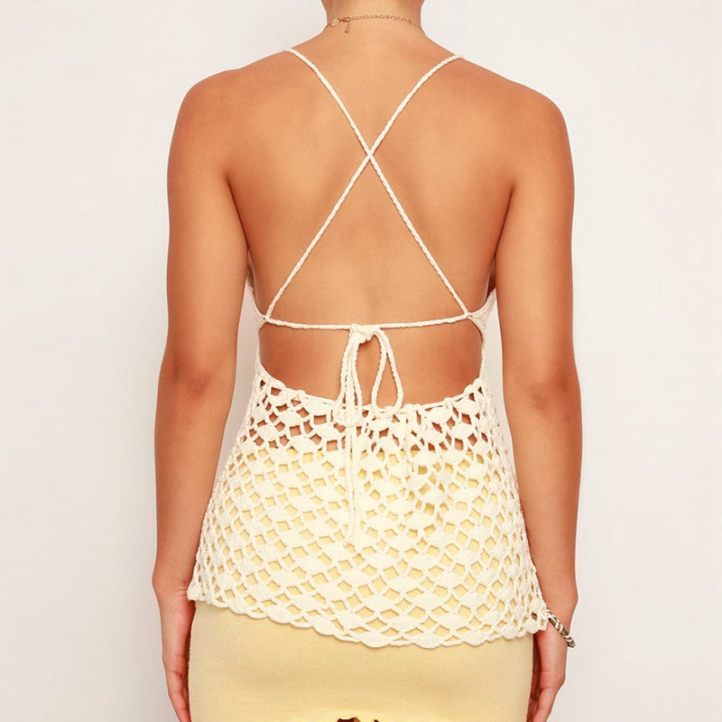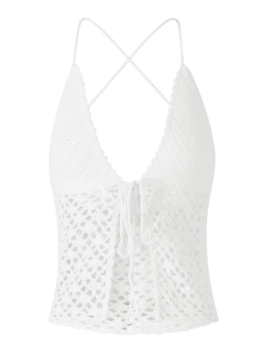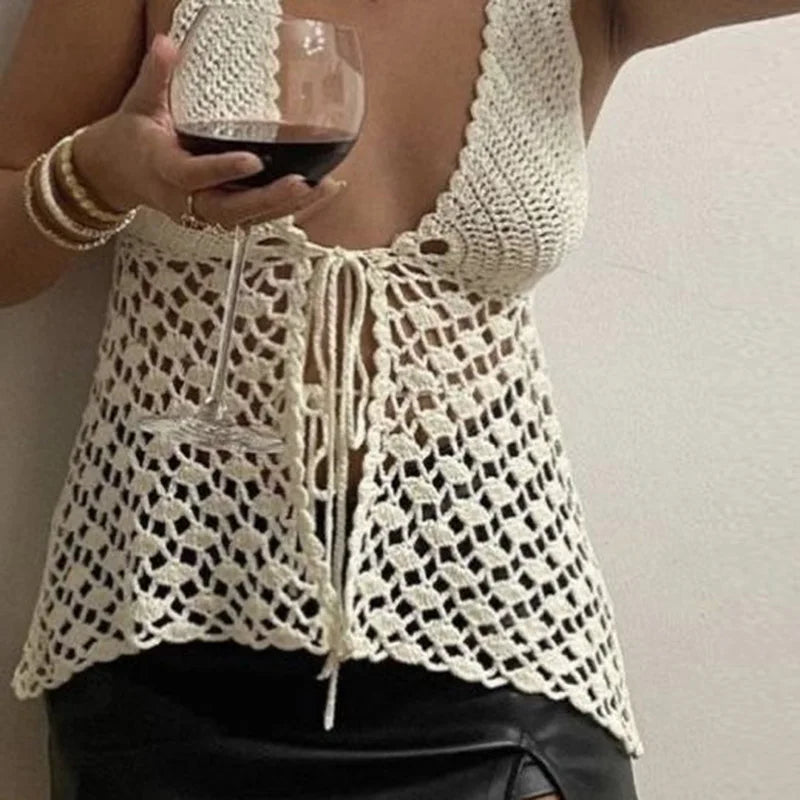 Cyflymder Women Crochet Halter Tops Vintage Knitted Front Tie Up Tank Vest Sexy Backless Crop Tops Y2K Summer Beach Holiday