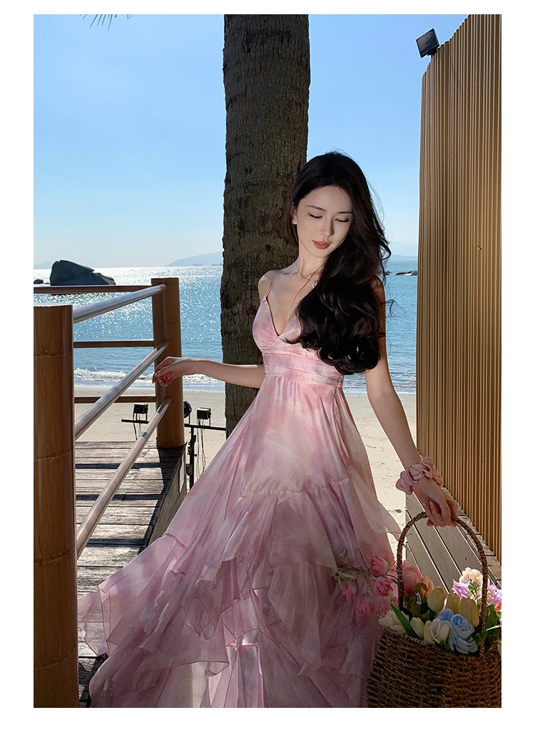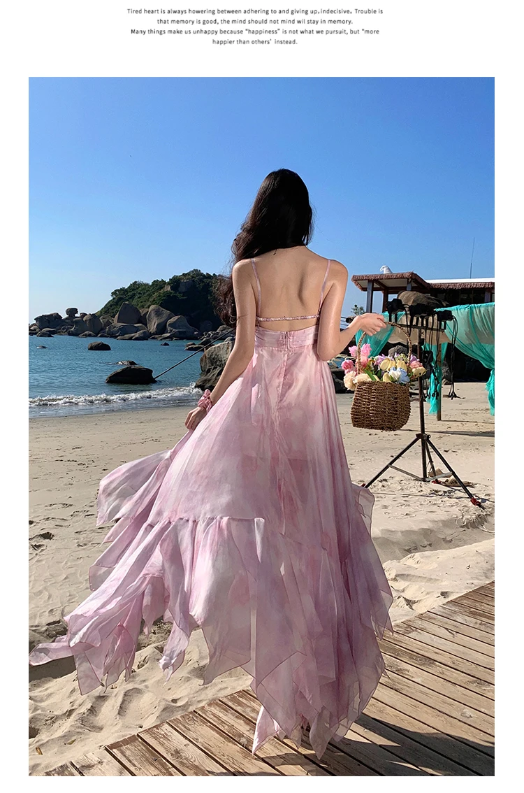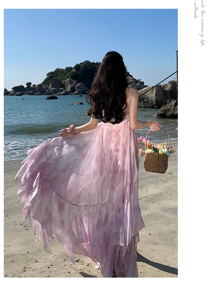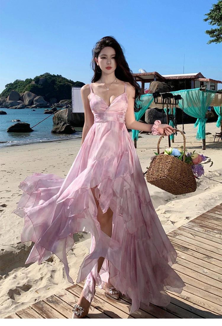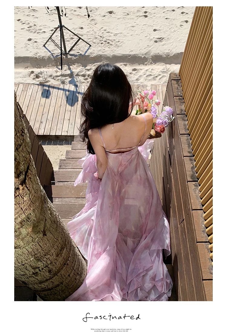 Cyflymder Women Elegant Pink 2025 Spaghetti Strap Fashionable Long Dress Summer Beach Holiday Party Floral Dresses Sweet High Waist Robe