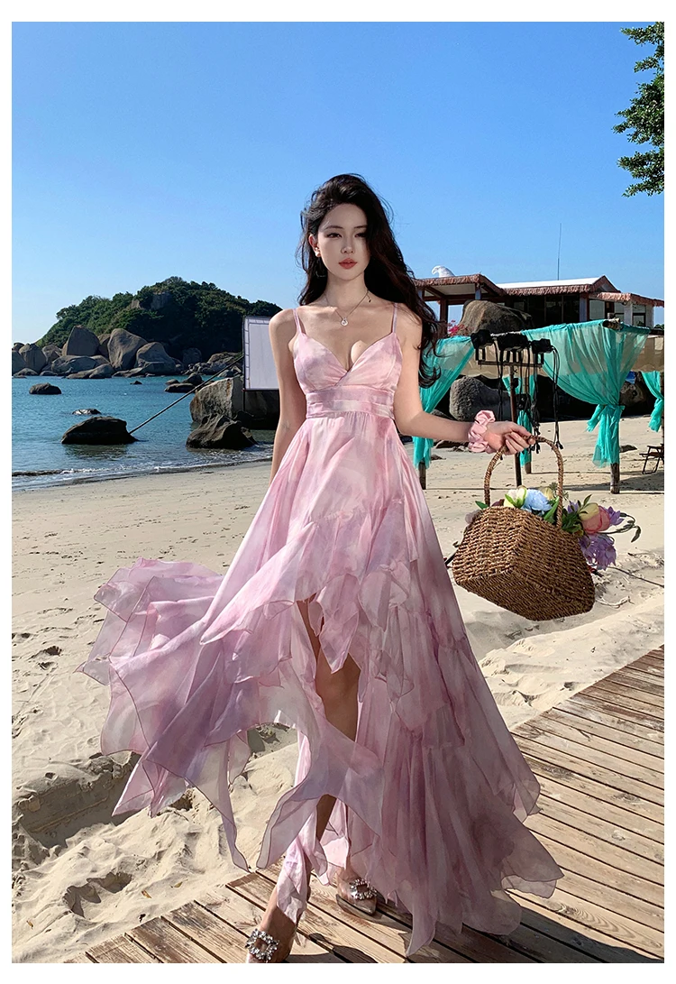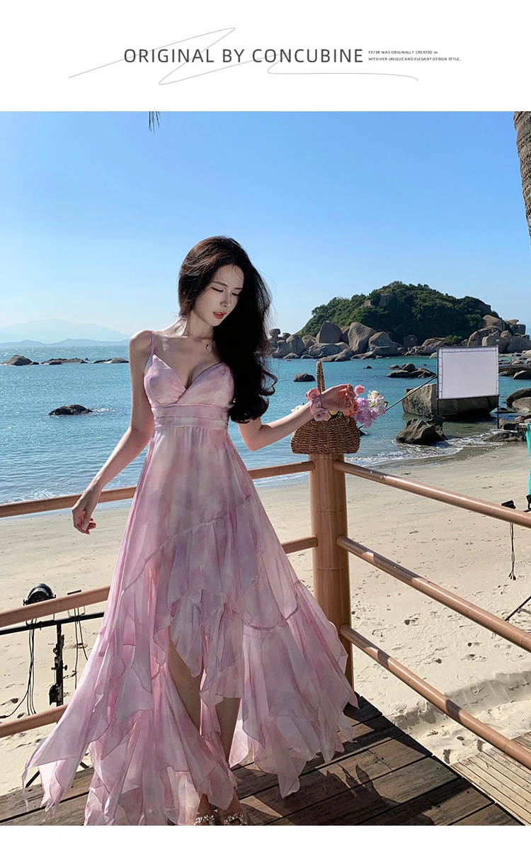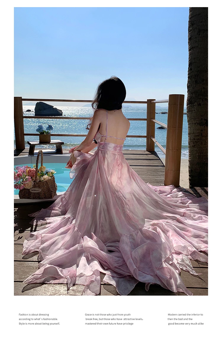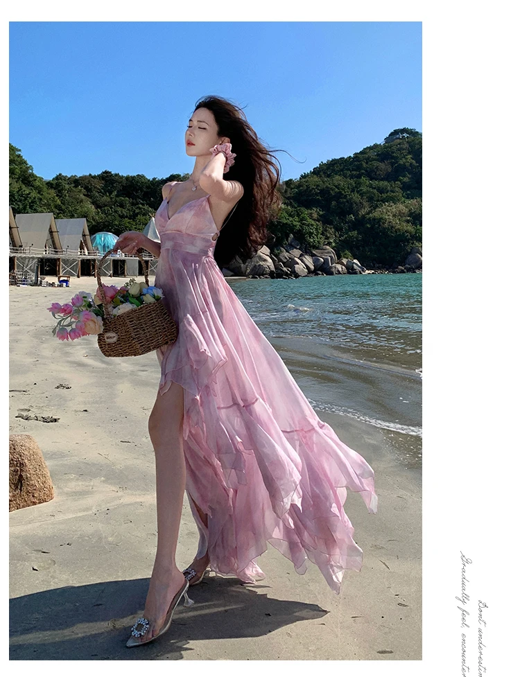 Cyflymder Women Elegant Pink 2025 Spaghetti Strap Fashionable Long Dress Summer Beach Holiday Party Floral Dresses Sweet High Waist Robe