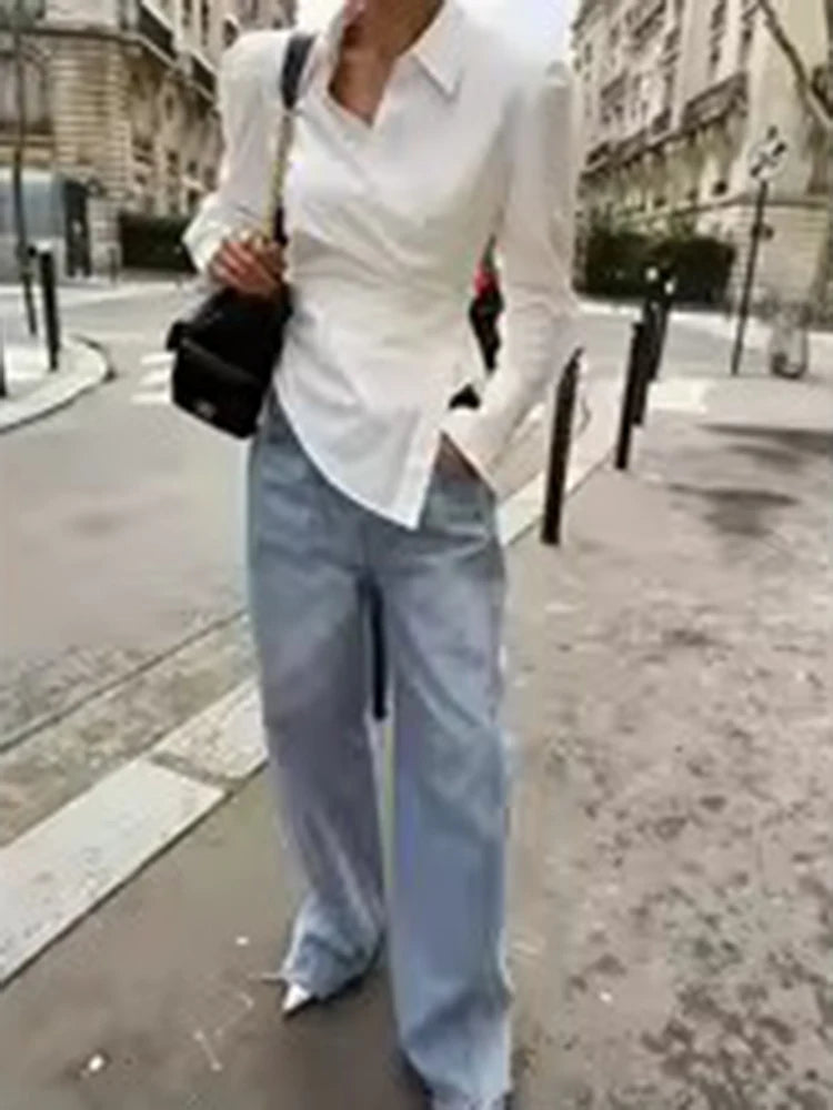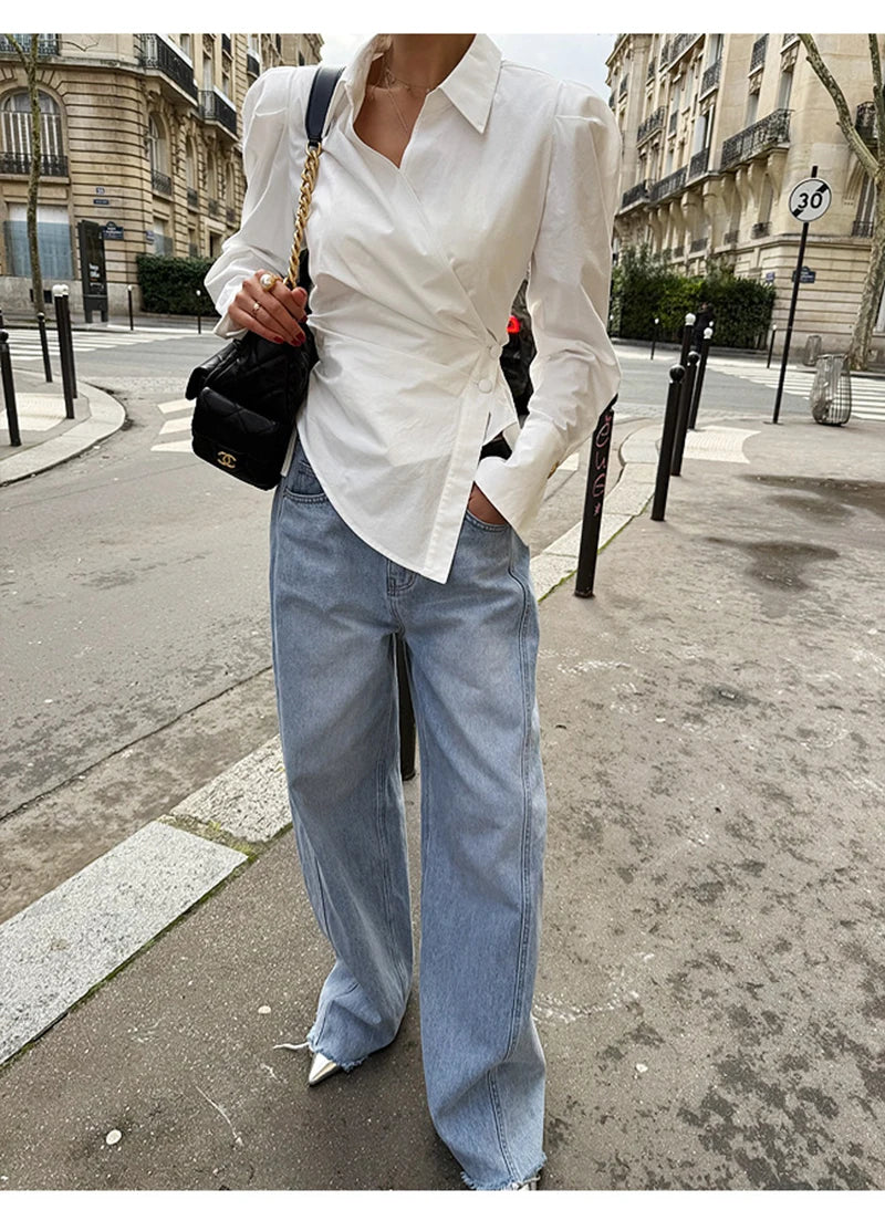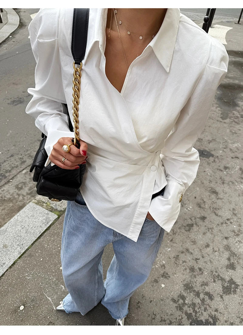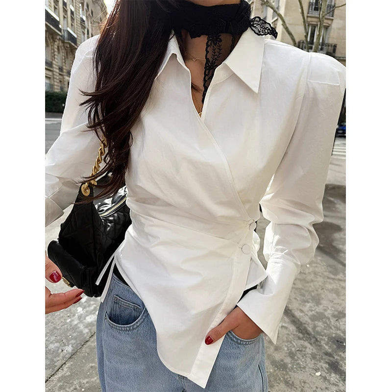 Cyflymder Women Elegant White Shirt Fashion Long Sleeve Blouse Irregular Office Top with Chic Buttons Slim Fit Ladies Casual Tops