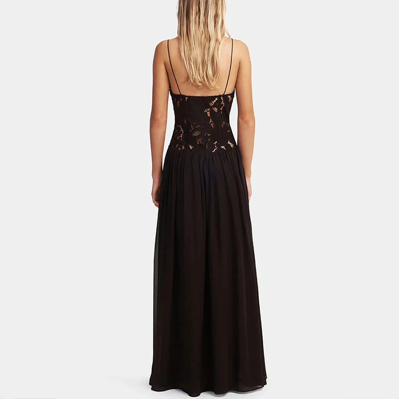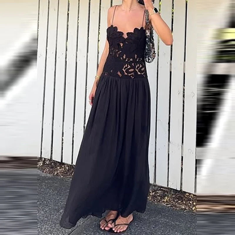 Cyflymder Women Fashion Sleeveless Backless Beach Long Dress Lace Embroidery Off Shoulder Black Dress Sexy Suspender Pleated Holiday Dress