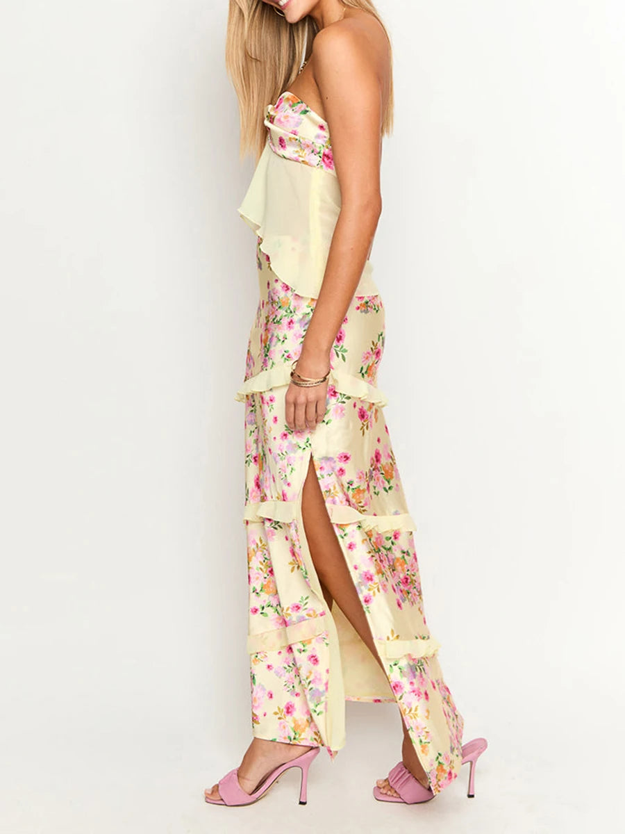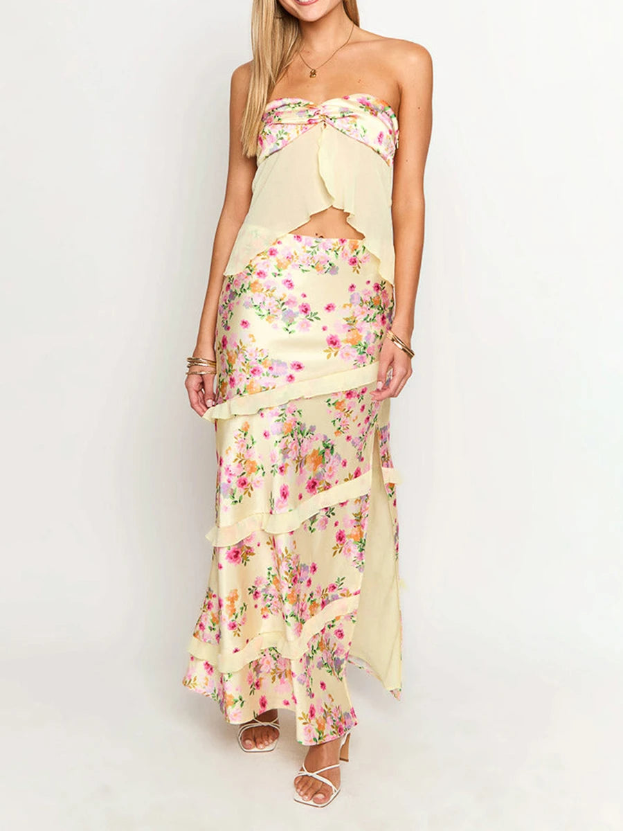 Cyflymder Women Floral Outfit Off Shoulder Split Front Tube Tops High Rise Long Skirt 2 Pcs Set for Party Club