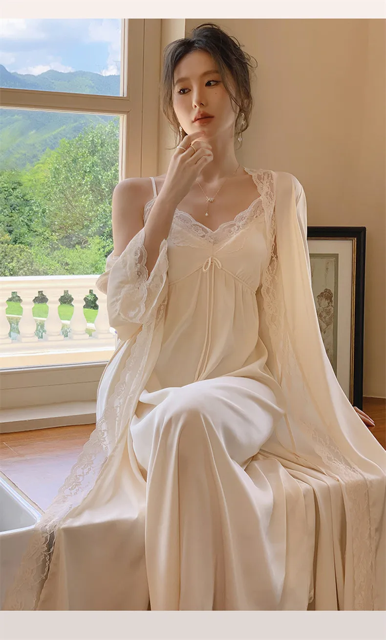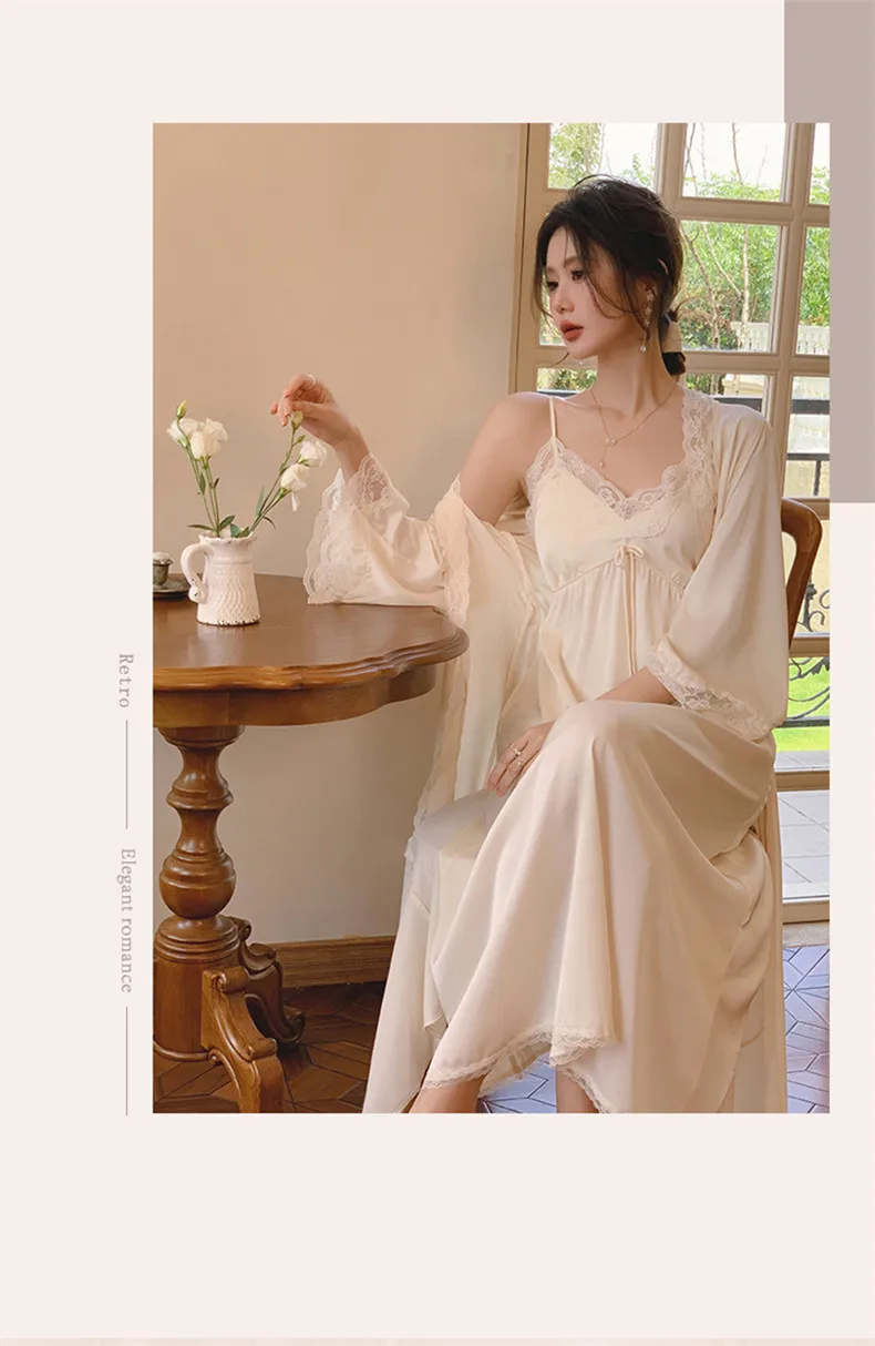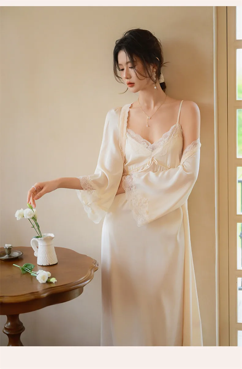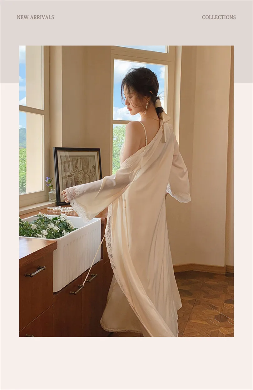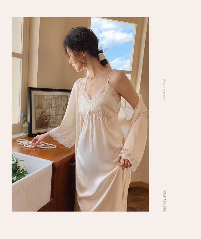 Cyflymder Women French Thin Style Sexy Two-Pieces Night Robe Lace V-Neck Spaghetti Strap Nightie Full Sleeves Loose Ice Silk Morning Robe